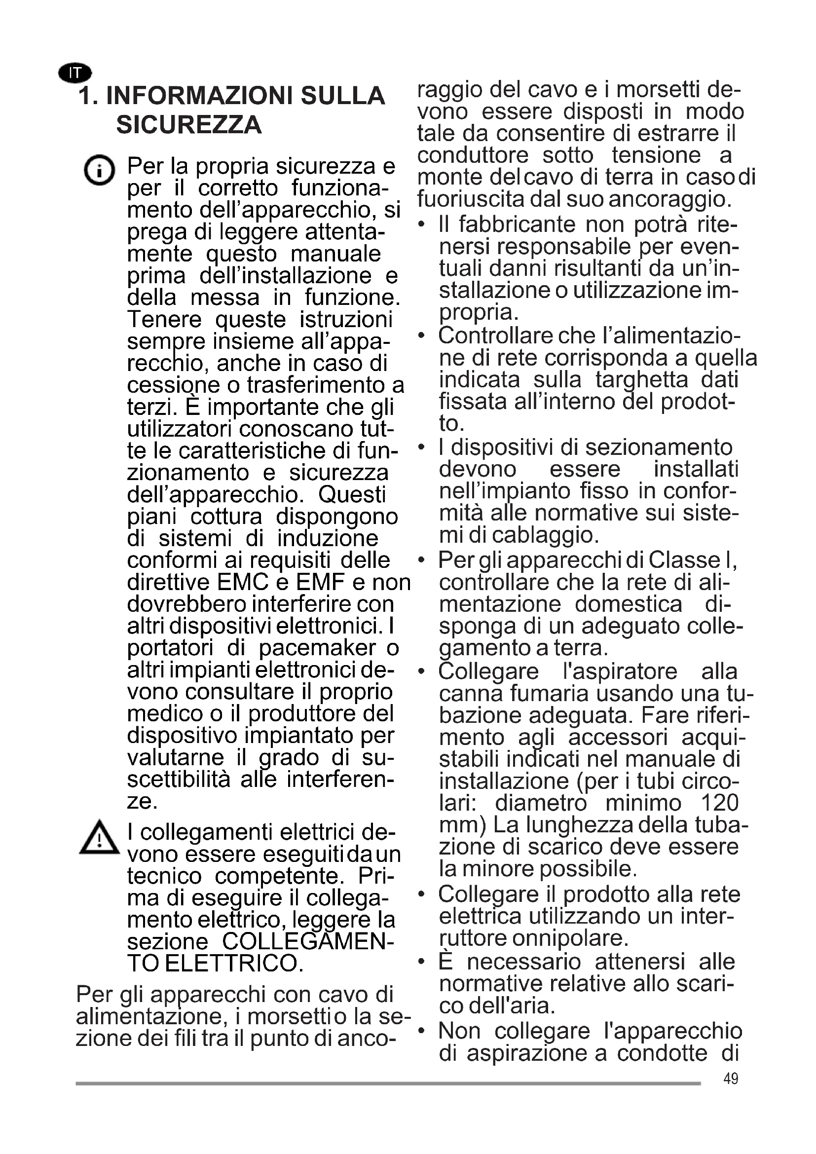 - Non collegare l'apparecchio di aspirazione a condotte di 49scarico che convoglino fumi di combustione (caldaie, ca- mini, ecc.).