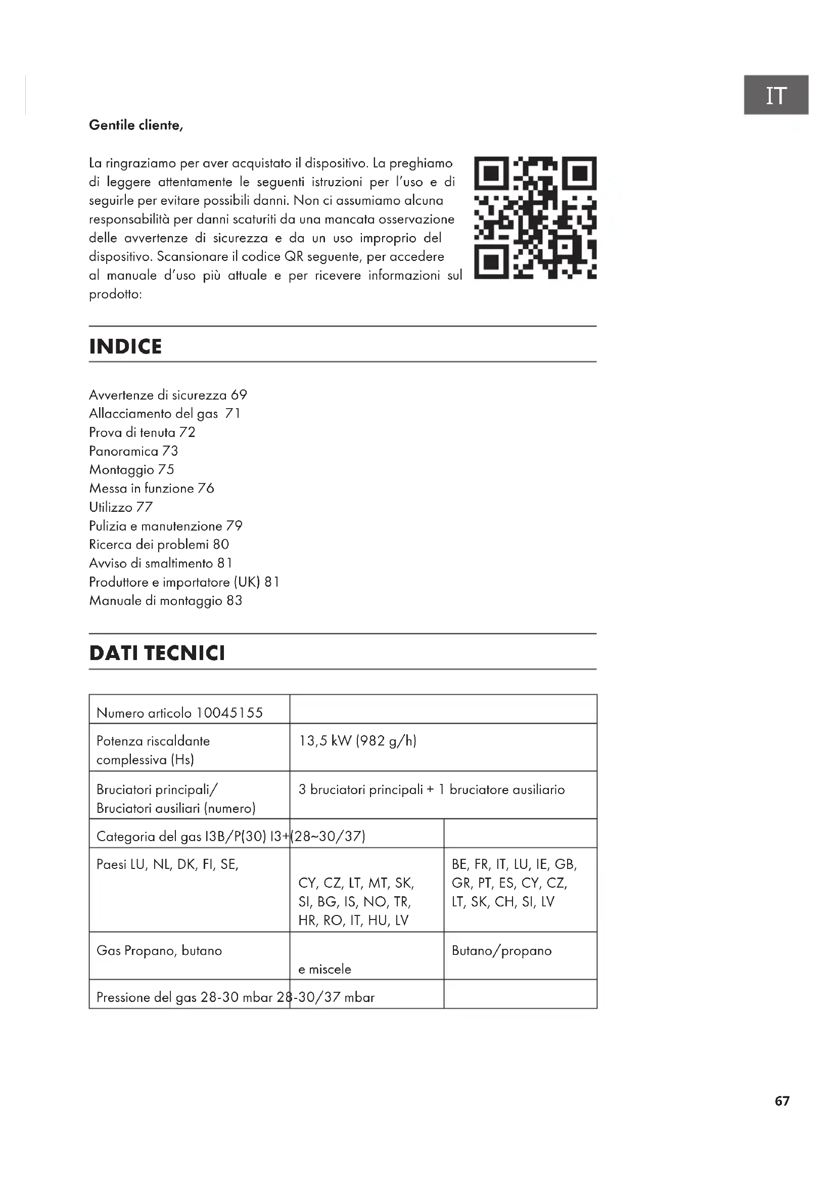 Gentile cliente, La ringraziamo per aver acquistato il dispositivo. La preghiamo di leggere attentamente le seguenti istruzioni per l’uso e di seguirle per evitare possibili danni. Non ci assumiamo alcuna responsabilità per danni scaturiti da una mancata osservazione delle avvertenze di sicurezza e da un uso improprio del dispositivo. Scansionare il codice QR seguente, per accedere al manuale d’uso più attuale e per ricevere informazioni sul prodotto: INDICE Avvertenze di sicurezza69 Allacciamento del gas 71 Prova di tenuta72 Panoramica73 Montaggio75 Messa in funzione76 Utilizzo77 Pulizia e manutenzione79 Ricerca dei problemi80 Avviso di smaltimento81 Produttore e importatore (UK)81 Manuale di montaggio83 DATI TECNICI Numero articolo 10045155 Potenza riscaldante complessiva (Hs) 13,5 kW (982 g/h) Bruciatori principali/ Bruciatori ausiliari (numero) 3 bruciatori principali + 1 bruciatore ausiliario Categoria del gas I3B/P(30) I3+(28~30/37) Paesi LU, NL, DK, FI, SE, CY, CZ, LT, MT, SK, SI, BG, IS, NO, TR, HR, RO, IT, HU, LV BE, FR, IT, LU, IE, GB, GR, PT, ES, CY, CZ, LT, SK, CH, SI, LV Gas Propano, butano e miscele Butano/propano Pressione del gas 28-30mbar 28-30/37mbar68