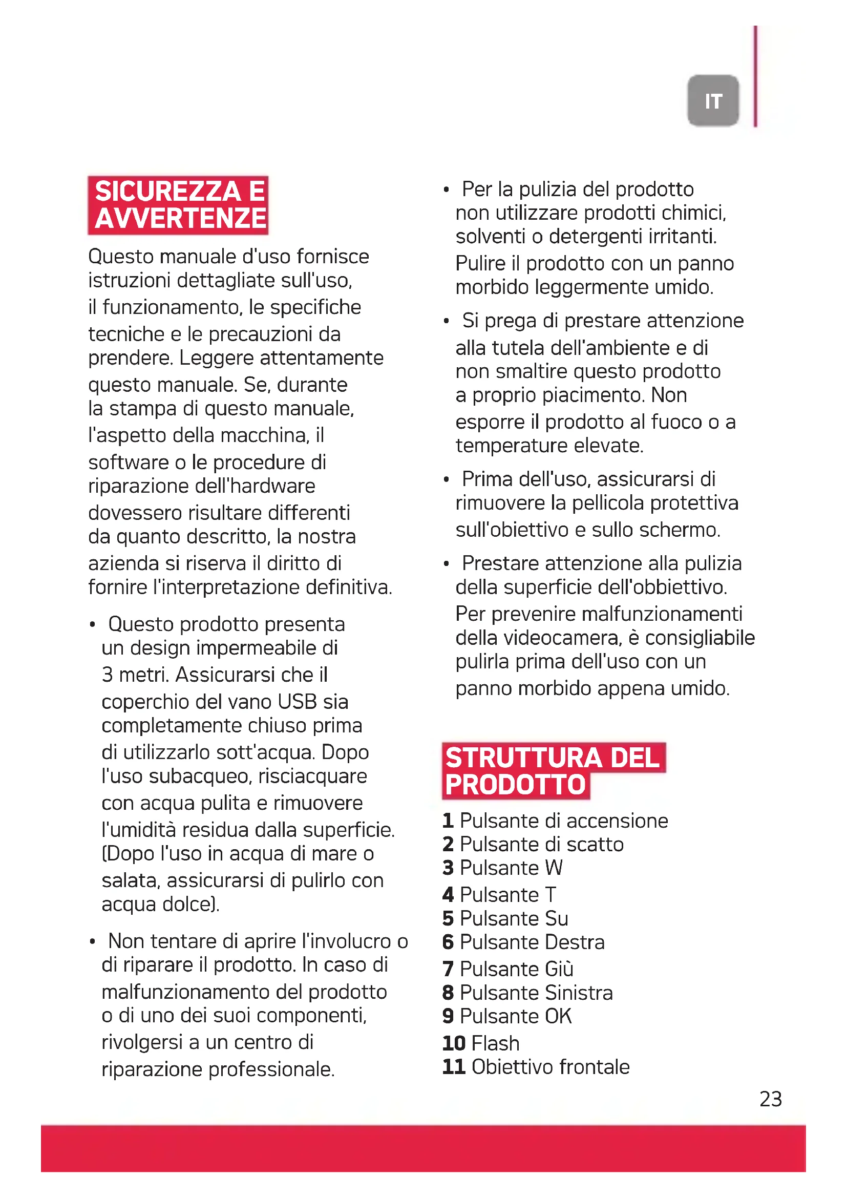 - Prestare attenzione alla pulizia della superficie dell'obbiettivo. Per prevenire malfunzionamenti della videocamera, è consigliabile pulirla prima dell'uso con un panno morbido appena umido. STRUTTURA DEL PRODOTTO 1 Pulsante di accensione 2 Pulsante di scatto 3 Pulsante W 4 Pulsante T 5 Pulsante Su 6 Pulsante Destra 7 Pulsante Giù 8 Pulsante Sinistra 9 Pulsante OK 10 Flash 11 Obiettivo frontaleIT