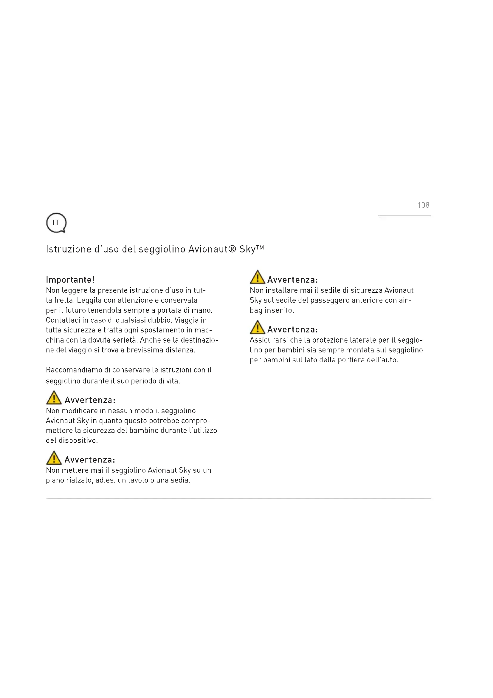 - Az alábbi garanciát a Lengyelországban bejegyzett KARWALA cég alkotta. A cég címe: KARWALA Szarlejka, ul. Lukaszewicza 172 42-130 Wreczyca Wielka, Polska (1) Az azonosító címkékkel vagy számmal nem rendelkező megvásárolt termékek idegen terméknek minősülnek. Mivel ezek a termékek nem azonosíthatók, nem vonatkozik rájuk a garancia. 107Importante! Non leggere la presente istruzione d’uso in tut- ta fretta. Leggila con attenzione e conservala per il futuro tenendola sempre a portata di mano. Contattaci in caso di qualsiasi dubbio. Viaggia in tutta sicurezza e tratta ogni spostamento in mac- china con la dovuta serietà. Anche se la destinazio- ne del viaggio si trova a brevissima distanza. Raccomandiamo di conservare le istruzioni con il seggiolino durante il suo periodo di vita. Avvertenza: Non modificare in nessun modo il seggiolino Avionaut Sky in quanto questo potrebbe compro- mettere la sicurezza del bambino durante l’utilizzo del dispositivo. Avvertenza: Non mettere mai il seggiolino Avionaut Sky su un piano rialzato, ad.es. un tavolo o una sedia. Istruzione d’uso del seggiolino Avionaut® Sky™ Avvertenza: Non installare mai il sedile di sicurezza Avionaut Sky sul sedile del passeggero anteriore con air- bag inserito. Avvertenza: Assicurarsi che la protezione laterale per il seggio- lino per bambini sia sempre montata sul seggiolino per bambini sul lato della portiera dell'auto.