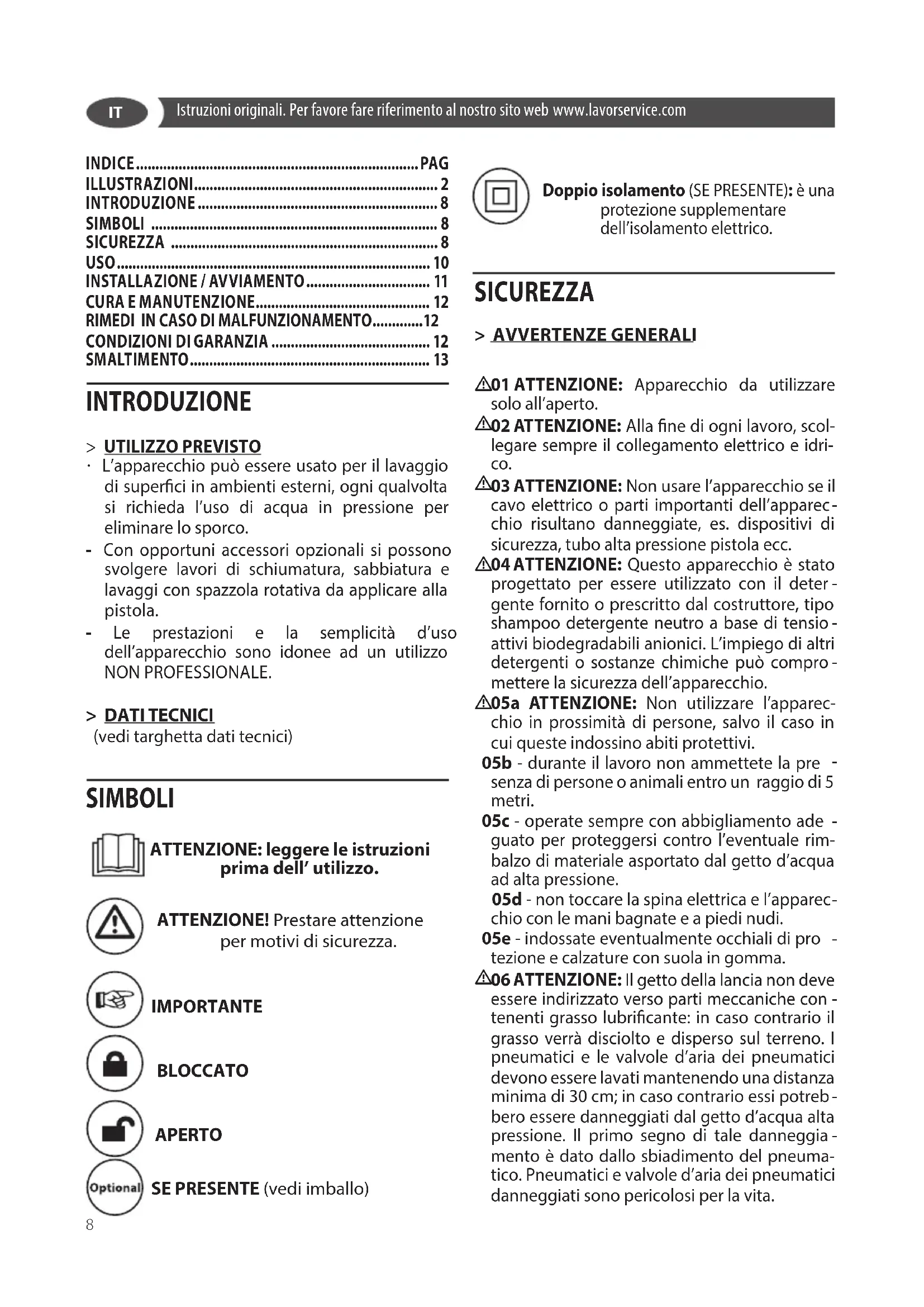 L’apparecchio può essere usato per il lavaggio di superci in ambienti esterni, ogni qualvolta si richieda l’uso di acqua in pressione per eliminare lo sporco. - Con opportuni accessori opzionali si possono svolgere lavori di schiumatura, sabbiatura e lavaggi con spazzola rotativa da applicare alla pistola. - Le prestazioni e la semplicità d’uso dell’apparecchio sono idonee ad un utilizzo NON PROFESSIONALE. > DATI TECNICI (vedi targhetta dati tecnici) SIMBOLI ATTENZIONE: leggere le istruzioni prima dell’ utilizzo. ATTENZIONE! Prestare attenzione per motivi di sicurezza. IMPORTANTE BLOCCATO APERTO SE PRESENTE (vedi imballo) Doppio isolamento (SE PRESENTE): è una protezione supplementare dell’isolamento elettrico. SICUREZZA > AVVERTENZE GENERALI