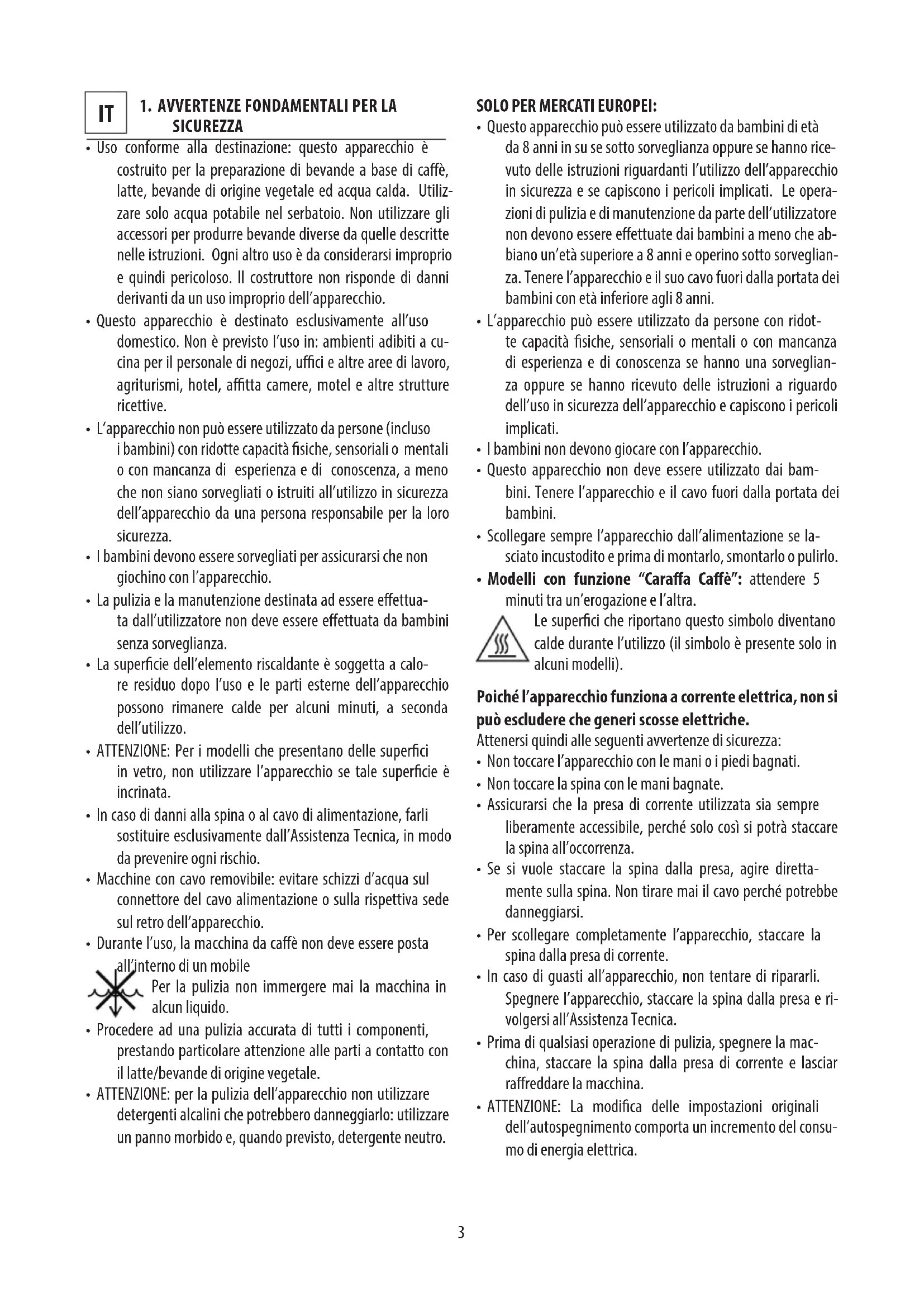 Leggere attentamente tutte le istruzioni a corredo prima di uti- lizzare l’apparecchio. Il mancato rispetto di queste istruzioni può essere fonte di lesioni e di danni all’apparecchio. Il costruttore non risponde per danni derivanti dal mancato ri- spetto di queste istruzioni per l’uso. Nota Bene: Queste avvertenze di sicurezza sono valide per tutte le macchine da caè De’Longhi. Conservare accuratamente questo fascicolo assieme alle istruzioni a corredo dell’apparecchio. Qualora l’apparecchio venga ceduto ad altre persone, consegna- re loro anche queste istruzioni per l’uso.
