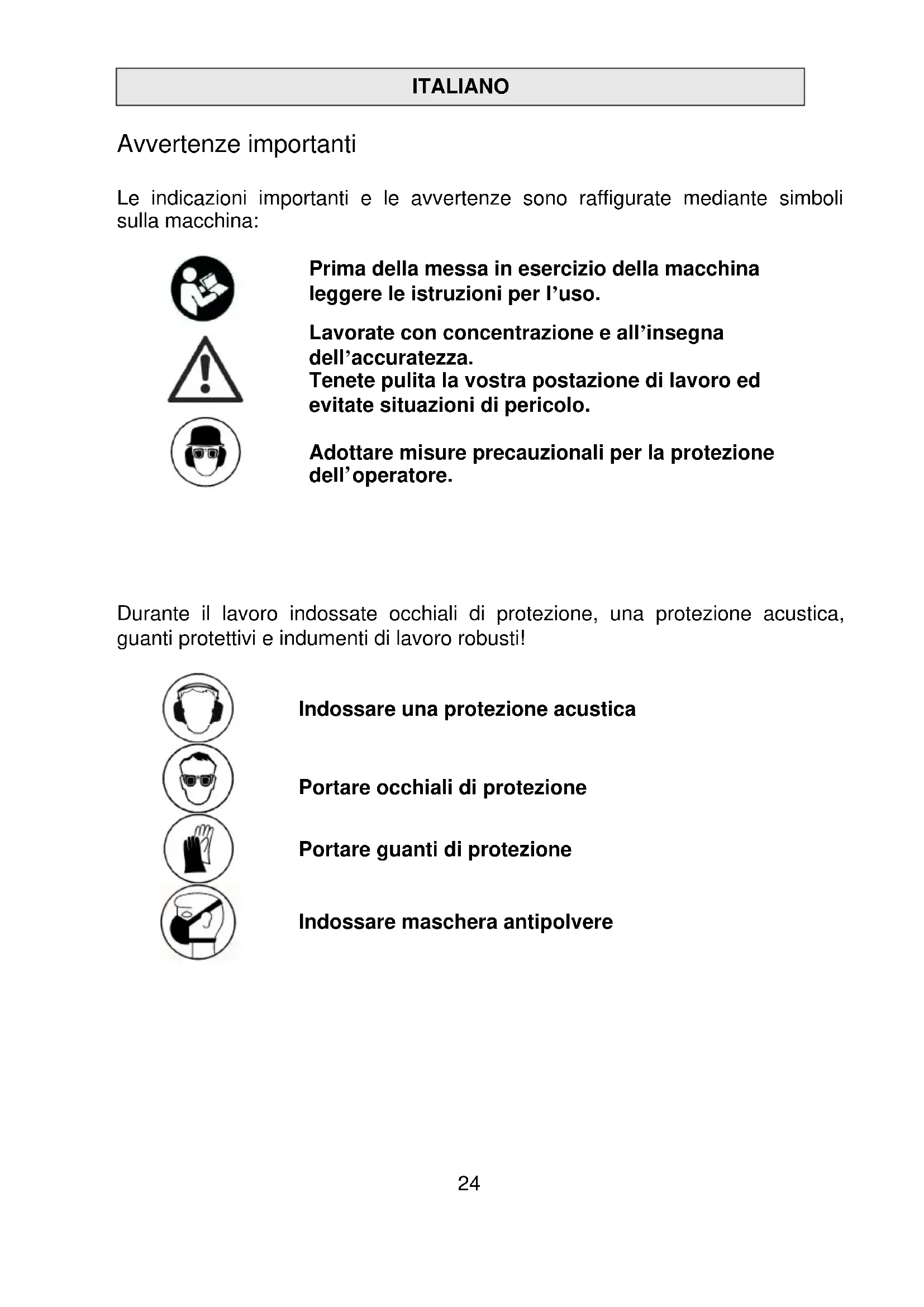 Prima della messa in esercizio della macchina leggere le istruzioni per l’uso. Lavorate con concentrazione e all’insegna dell’accuratezza. Tenete pulita la vostra postazione di lavoro ed evitate situazioni di pericolo.