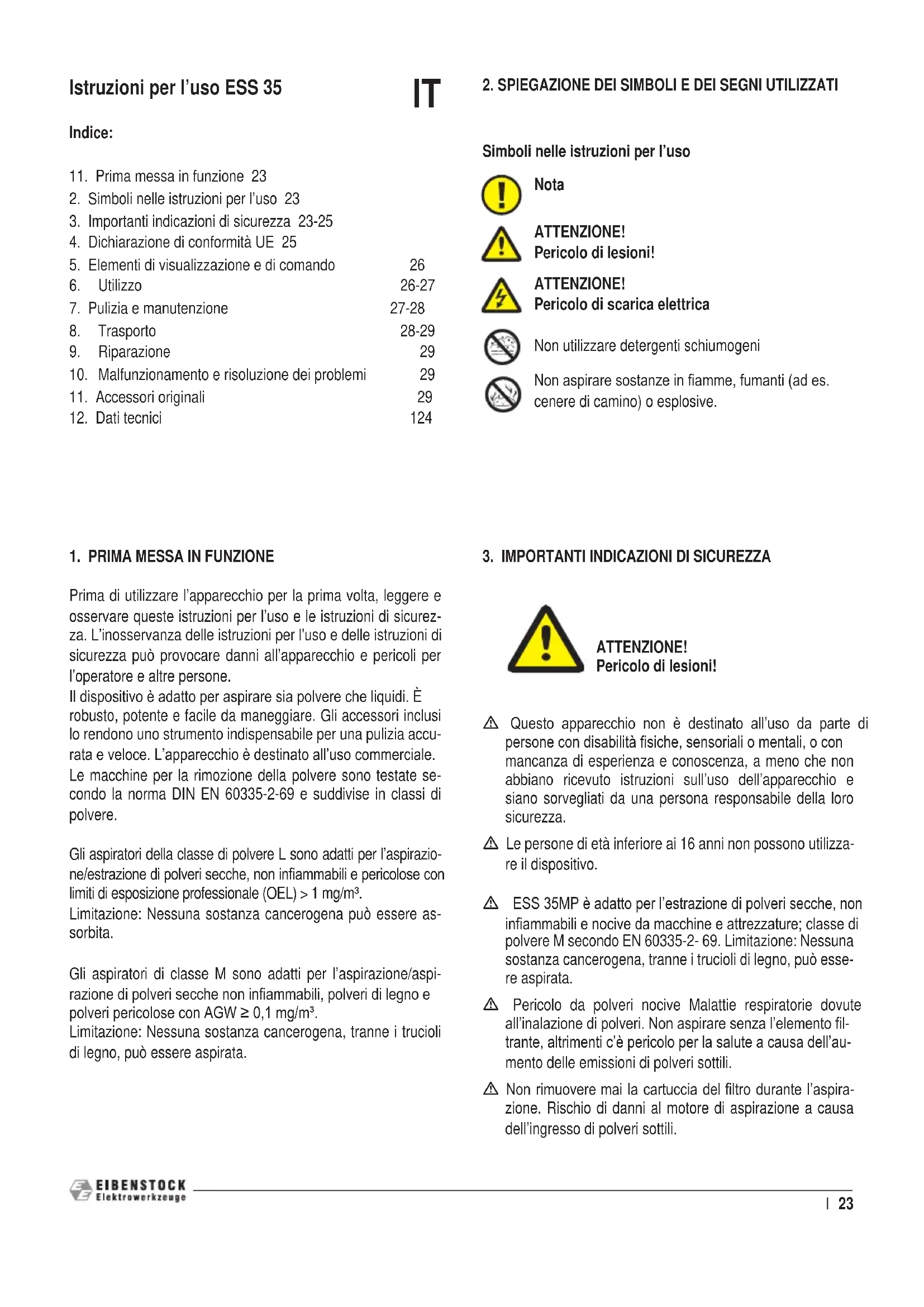 Prima di utilizzare l’apparecchio per la prima volta, leggere e osservare queste istruzioni per l’uso e le istruzioni di sicurez- za. L’inosservanza delle istruzioni per l'uso e delle istruzioni di sicurezza può provocare danni all’apparecchio e pericoli per l’operatore e altre persone. Il dispositivo è adatto per aspirare sia polvere che liquidi. È robusto, potente e facile da maneggiare. Gli accessori inclusi lo rendono uno strumento indispensabile per una pulizia accu- rata e veloce. L’apparecchio è destinato all’uso commerciale. Le macchine per la rimozione della polvere sono testate se- condo la norma DIN EN 60335-2-69 e suddivise in classi di polvere. Gli aspiratori della classe di polvere L sono adatti per l’aspirazio- ne/estrazione di polveri secche, non inammabili e pericolose con limiti di esposizione professionale (OEL) > 1 mg/m³. Limitazione: Nessuna sostanza cancerogena può essere as- sorbita. Gli aspiratori di classe M sono adatti per l’aspirazione/aspi- razione di polveri secche non inammabili, polveri di legno e polveri pericolose con AGW ≥ 0,1 mg/m³. Limitazione: Nessuna sostanza cancerogena, tranne i trucioli di legno, può essere aspirata. Istruzioni per l’uso ESS 35 Indice: