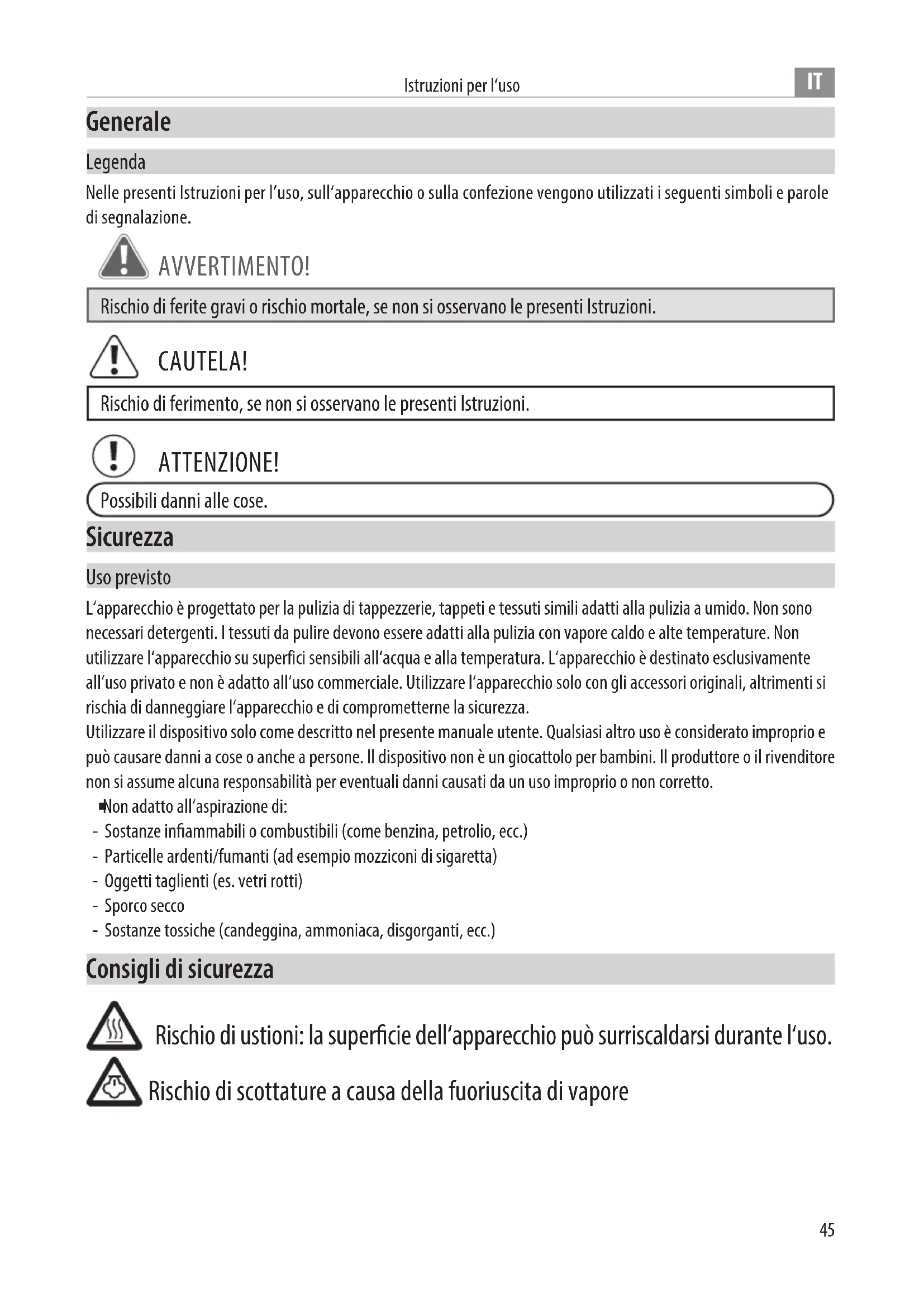 Generale Legenda Nelle presenti Istruzioni per l’uso, sull‘apparecchio o sulla confezione vengono utilizzati i seguenti simboli e parole di segnalazione. Sicurezza Uso previsto L‘apparecchio è progettato per la pulizia di tappezzerie, tappeti e tessuti simili adatti alla pulizia a umido. Non sono necessari detergenti. I tessuti da pulire devono essere adatti alla pulizia con vapore caldo e alte temperature. Non utilizzare l‘apparecchio su superfici sensibili all‘acqua e alla temperatura. L‘apparecchio è destinato esclusivamente all‘uso privato e non è adatto all‘uso commerciale. Utilizzare l‘apparecchio solo con gli accessori originali, altrimenti si rischia di danneggiare l‘apparecchio e di comprometterne la sicurezza. Utilizzare il dispositivo solo come descritto nel presente manuale utente. Qualsiasi altro uso è considerato improprio e può causare danni a cose o anche a persone. Il dispositivo non è un giocattolo per bambini. Il produttore o il rivenditore non si assume alcuna responsabilità per eventuali danni causati da un uso improprio o non corretto.