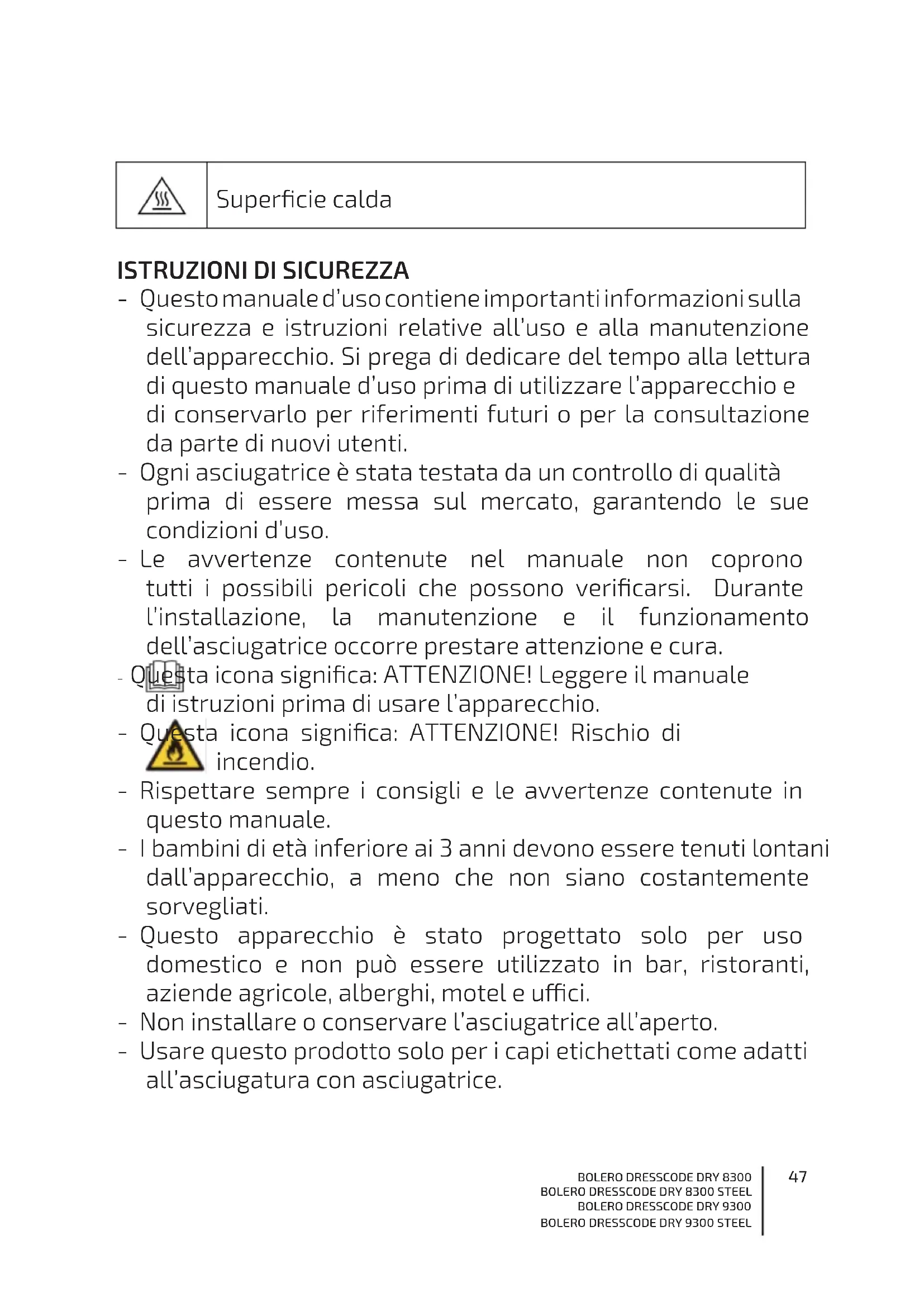 - Questo manuale d’uso contiene importanti informazioni sulla sicurezza e istruzioni relative all’uso e alla manutenzione dell’apparecchio. Si prega di dedicare del tempo alla lettura di questo manuale d’uso prima di utilizzare l’apparecchio e di conservarlo per riferimenti futuri o per la consultazione da parte di nuovi utenti. - Ogni asciugatrice è stata testata da un controllo di qualità prima di essere messa sul mercato, garantendo le sue condizioni d’uso. - Le avvertenze contenute nel manuale non coprono tutti i possibili pericoli che possono vericarsi. Durante l’installazione, la manutenzione e il funzionamento dell’asciugatrice occorre prestare attenzione e cura. - Questa icona signica: ATTENZIONE! Leggere il manuale di istruzioni prima di usare l’apparecchio. - Questa icona signica: ATTENZIONE! Rischio di incendio. - Rispettare sempre i consigli e le avvertenze contenute in questo manuale. - I bambini di età inferiore ai 3 anni devono essere tenuti lontani dall’apparecchio, a meno che non siano costantemente sorvegliati. - Questo apparecchio è stato progettato solo per uso domestico e non può essere utilizzato in bar, ristoranti, aziende agricole, alberghi, motel e uci. - Non installare o conservare l’asciugatrice all’aperto. - Usare questo prodotto solo per i capi etichettati come adatti all’asciugatura con asciugatrice.48