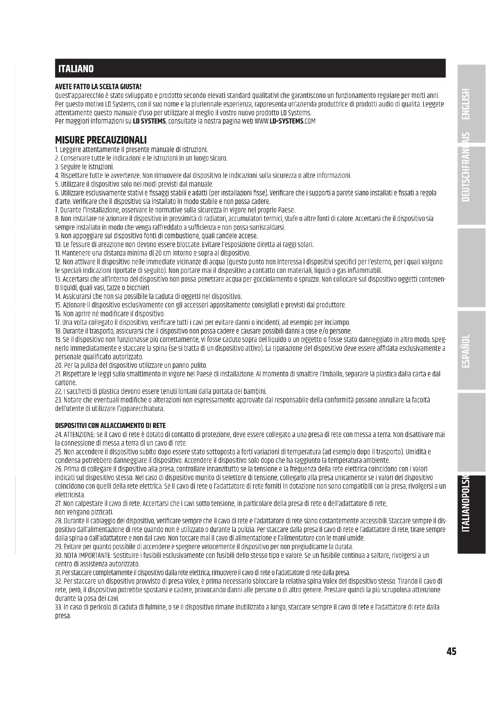 - Kit di montaggio su rack 19” incluso nella fornitura. Dotazione del modello LDU30xIEM Trasmettitore, ricevitore portatile, antenna BNC, alimentatore, 2 batterie AA, kit per montaggio su rack da 19", manuale d’uso Dotazione del modello LDU30xIEMHP Trasmettitore, ricevitore portatile, auricolari stereo, antenna BNC, alimentatore, 2 batterie AA, kit per montaggio su rack da 19", manuale d’uso47 DEUTSCHFRANCAIS ESPAÑOL ENGLISH ITALIANO POLSKI Nota L’impiego del sistema radiomicrofono può essere soggetto a licenza a seconda del Paese d’uso. Per informazioni dettagliate, rivolgersi alle autorità competenti del proprio Paese.