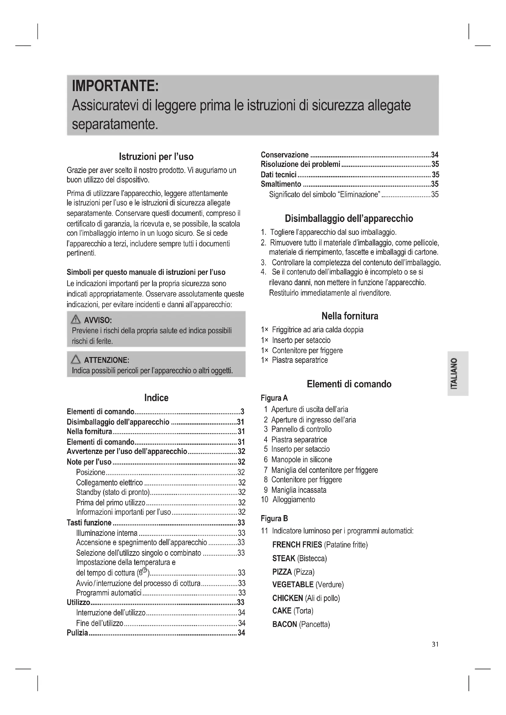 rilevano danni, non mettere in funzione l’apparecchio. Restituirlo immediatamente al rivenditore. Nella fornitura 1× Friggitrice ad aria calda doppia 1× Inserto per setaccio 1× Contenitore per friggere 1× Piastra separatrice Elementi di comando Figura A 1 Aperture di uscita dell’aria 2 Aperture di ingresso dell’aria 3 Pannello di controllo 4 Piastra separatrice 5 Inserto per setaccio 6 Manopole in silicone 7 Maniglia del contenitore per friggere 8 Contenitore per friggere 9 Maniglia incassata 10 Alloggiamento Figura B 11 Indicatore luminoso per i programmi automatici: FRENCH FRIES (Patatine fritte) STEAK (Bistecca) PIZZA (Pizza) VEGETABLE (Verdure) CHICKEN (Ali di pollo) CAKE (Torta) BACON (Pancetta)32 FISH (Pesce) SHRIMPS (Gamberetti) KEEP WARM (Tenere in caldo) 12 Pannelli di controllo per gli scomparti della friggitrice (scomparto