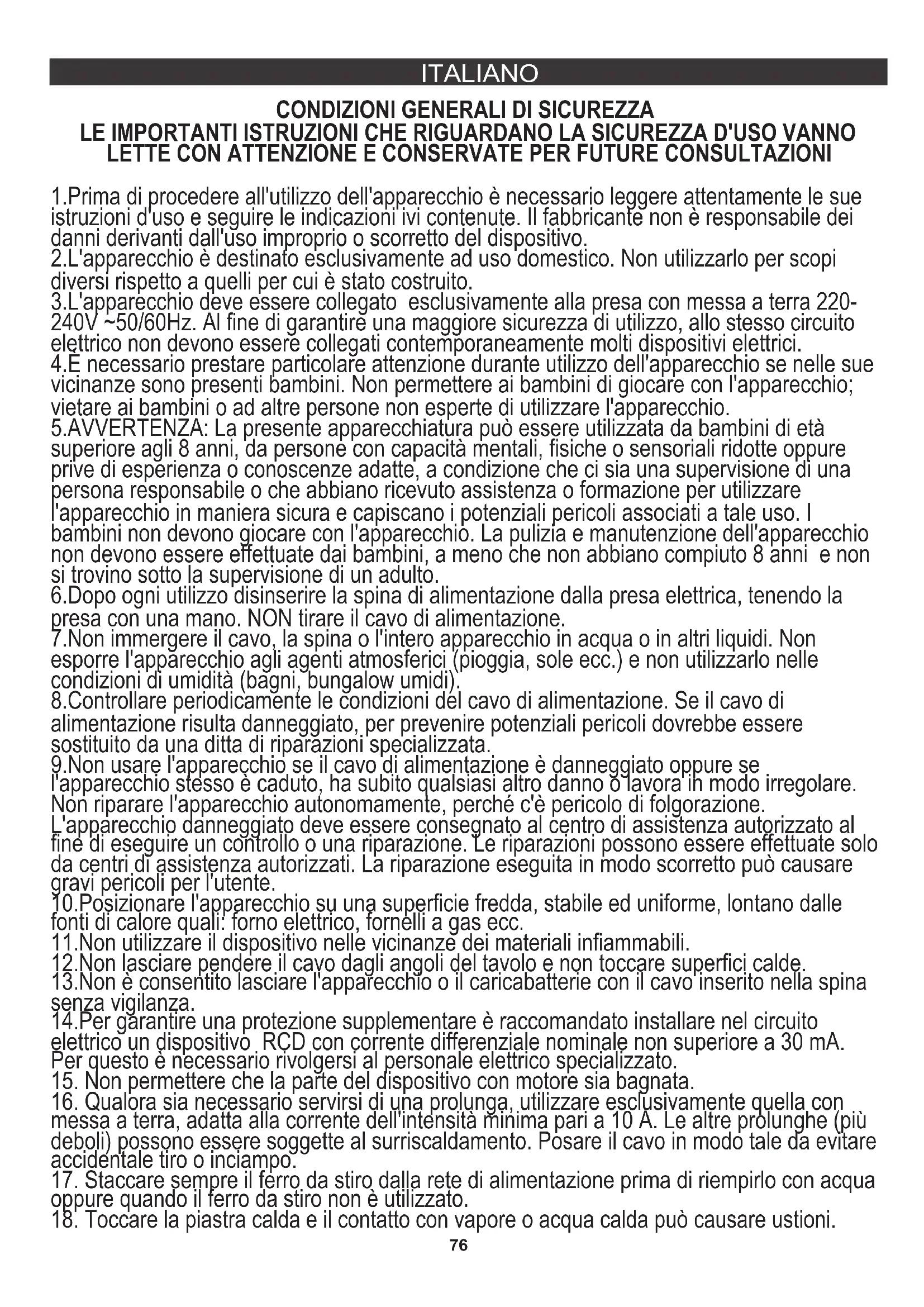 3.L'apparecchio deve essere collegato esclusivamente alla presa con messa a terra 220- 240V ~50/60Hz. Al fine di garantire una maggiore sicurezza di utilizzo, allo stesso circuito elettrico non devono essere collegati contemporaneamente molti dispositivi elettrici. 4.È necessario prestare particolare attenzione durante utilizzo dell'apparecchio se nelle sue vicinanze sono presenti bambini. Non permettere ai bambini di giocare con l'apparecchio; vietare ai bambini o ad altre persone non esperte di utilizzare l'apparecchio. 11.Non utilizzare il dispositivo nelle vicinanze dei materiali infiammabili. 12.Non lasciare pendere il cavo dagli angoli del tavolo e non toccare superfici calde. 6.Dopo ogni utilizzo disinserire la spina di alimentazione dalla presa elettrica, tenendo la presa con una mano. NON tirare il cavo di alimentazione. 10.Posizionare l'apparecchio su una superficie fredda, stabile ed uniforme, lontano dalle fonti di calore quali: forno elettrico, fornelli a gas ecc. 9.Non usare l'apparecchio se il cavo di alimentazione è danneggiato oppure se l'apparecchio stesso è caduto, ha subito qualsiasi altro danno o lavora in modo irregolare. Non riparare l'apparecchio autonomamente, perché c'è pericolo di folgorazione. L'apparecchio danneggiato deve essere consegnato al centro di assistenza autorizzato al fine di eseguire un controllo o una riparazione. Le riparazioni possono essere effettuate solo da centri di assistenza autorizzati. La riparazione eseguita in modo scorretto può causare gravi pericoli per l'utente. LE IMPORTANTI ISTRUZIONI CHE RIGUARDANO LA SICUREZZA D'USO VANNO LETTE CON ATTENZIONE E CONSERVATE PER FUTURE CONSULTAZIONI 5.AVVERTENZA: La presente apparecchiatura può essere utilizzata da bambini di età superiore agli 8 anni, da persone con capacità mentali, fisiche o sensoriali ridotte oppure prive di esperienza o conoscenze adatte, a condizione che ci sia una supervisione di una persona responsabile o che abbiano ricevuto assistenza o formazione per utilizzare l'apparecchio in maniera sicura e capiscano i potenziali pericoli associati a tale uso. I bambini non devono giocare con l'apparecchio. La pulizia e manutenzione dell'apparecchio non devono essere effettuate dai bambini, a meno che non abbiano compiuto 8 anni e non si trovino sotto la supervisione di un adulto. 14.Per garantire una protezione supplementare è raccomandato installare nel circuito elettrico un dispositivo RCD con corrente differenziale nominale non superiore a 30 mA. Per questo è necessario rivolgersi al personale elettrico specializzato.