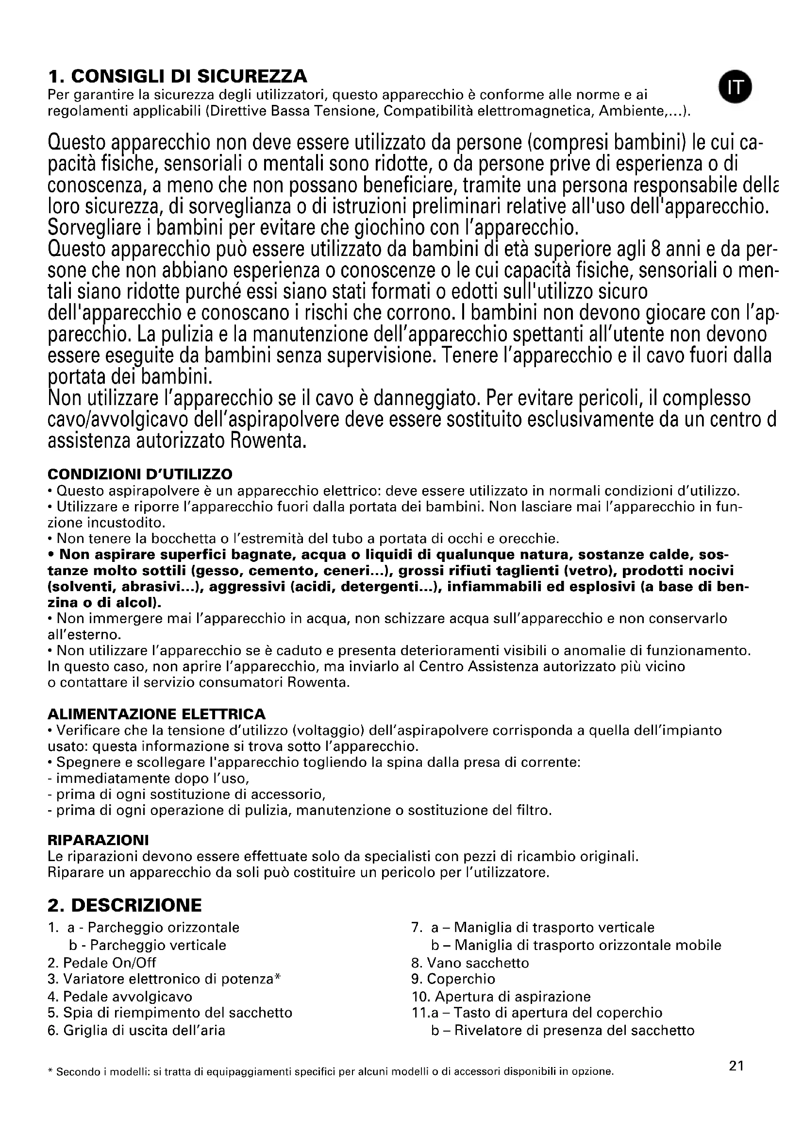 Per garantire la sicurezza degli utilizzatori, questo apparecchio è conforme alle norme e ai regolamenti applicabili (Direttive Bassa Tensione, Compatibilità elettromagnetica, Ambiente,…). Questo apparecchio non deve essere utilizzato da persone (compresi bambini) le cui ca- pacità fisiche, sensoriali o mentali sono ridotte, o da persone prive di esperienza o di conoscenza, a meno che non possano beneficiare, tramite una persona responsabile della loro sicurezza, di sorveglianza o di istruzioni preliminari relative all'uso dell'apparecchio. Sorvegliare i bambini per evitare che giochino con l’apparecchio. Questo apparecchio può essere utilizzato da bambini di età superiore agli 8 anni e da per- sone che non abbiano esperienza o conoscenze o le cui capacità fisiche, sensoriali o men- tali siano ridotte purché essi siano stati formati o edotti sull'utilizzo sicuro dell'apparecchio e conoscano i rischi che corrono. I bambini non devono giocare con l’ap- parecchio. La pulizia e la manutenzione dell’apparecchio spettanti all’utente non devono essere eseguite da bambini senza supervisione. Tenere l’apparecchio e il cavo fuori dalla portata dei bambini. Non utilizzare l’apparecchio se il cavo è danneggiato. Per evitare pericoli, il complesso cavo/avvolgicavo dell’aspirapolvere deve essere sostituito esclusivamente da un centro di assistenza autorizzato Rowenta.