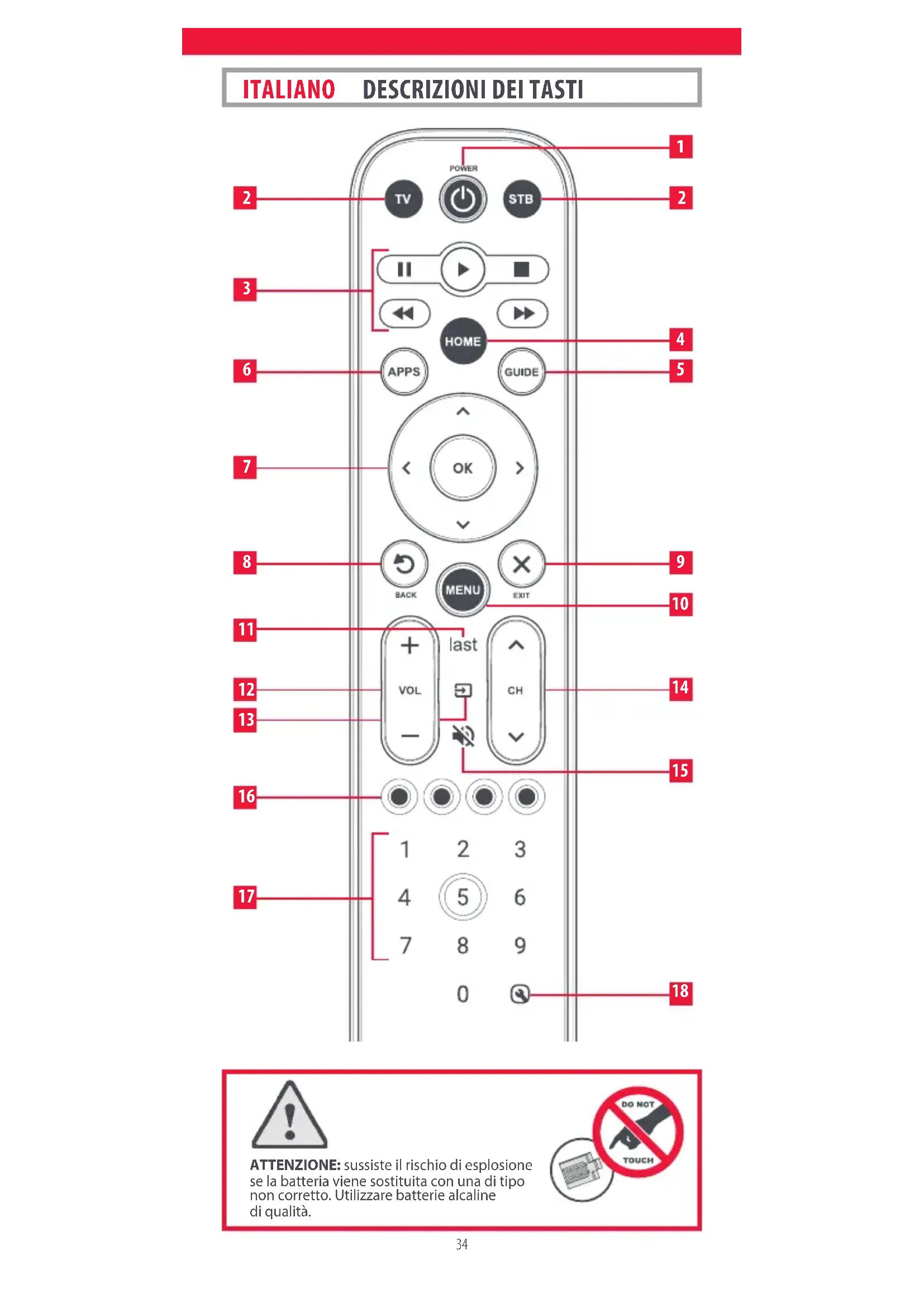 Tasti dei dispositivi Questi tasti servono per selezionare il dispositivo controllato da EazyClean. Una volta premuto il tasto TV, ad esempio, il telecomando controllerà il televisore. Per passare al controllo di un altro dispositivo, è suciente premere il tasto appropriato. I dispositivi che possono essere programmati per ogni tasto sono: TV: tutti i televisori a LED, LCD, plasma, OLED, ecc. STB: set-top-box tra cui satellitari, via cavo e Freeview.