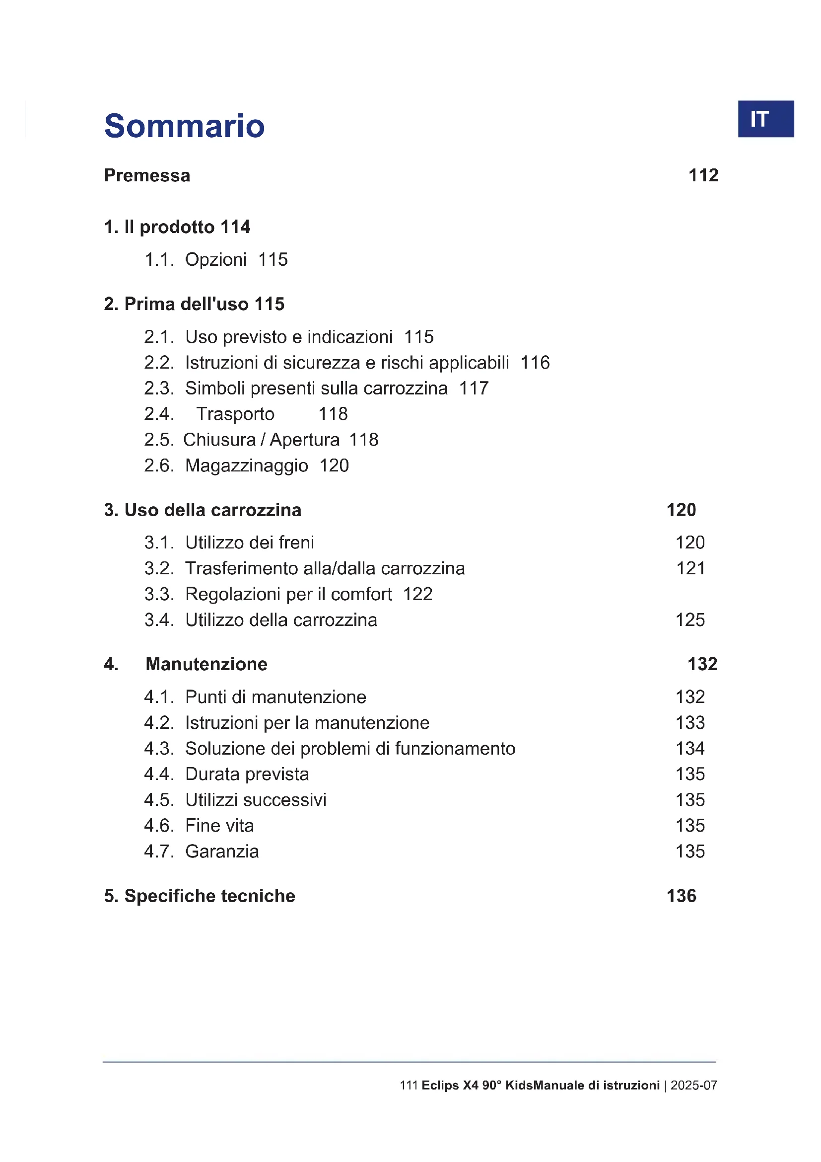 - Gruppi ruota danneggiati o spezzati. 4.4. Durata prevista La carrozzina è costruita in modo da permettere una durata media di vita di 5 anni. Tale valore aumenta o diminuisce a seconda della frequenza di utilizzo, delle condizioni di guida e della manutenzione. 4.5. Utilizzi successivi Prima di ogni utilizzo successivo, fare disinfettare, ispezionare e sottoporre a manutenzione la carrozzina secondo le istruzioni dei § 4.1. e § 4.2. . 4.6. Fine vita A ne vita, occorre smaltire la carrozzina conformemente alla legislazione ambientale locale. Il modo migliore per farlo consiste nello smontare la carrozzina per agevolare il trasporto dei componenti riciclabili. 4.7. Garanzia La garanzia di questo prodotto è soggetta ai termini e alle condizioni generali di ogni paese.136Manuale di istruzioni | 2025-07 Eclips X4 90° Kids