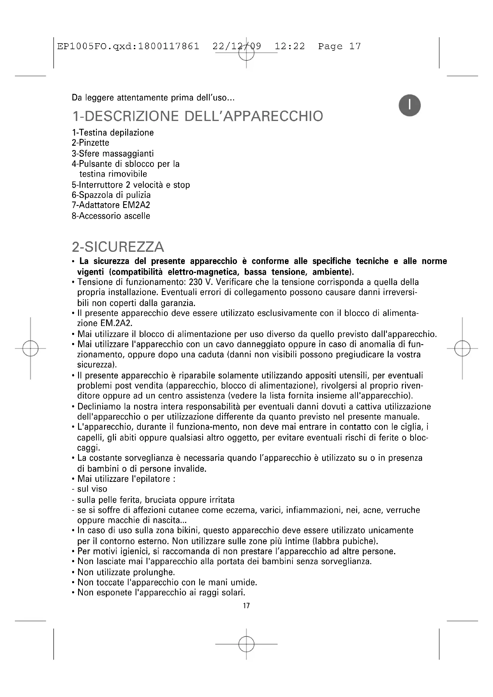 1-Testina depilazione 2-Pinzette 3-Sfere massaggianti 4-Pulsante di sblocco per la testina rimovibile 5-Interruttore 2 velocità e stop 6-Spazzola di pulizia 7-Adattatore EM2A2 8-Accessorio ascelle EP1005FO.qxd:1800117861 22/12/09 12:22 Page 17• Non utilizzate l'apparecchio a basse temperature.