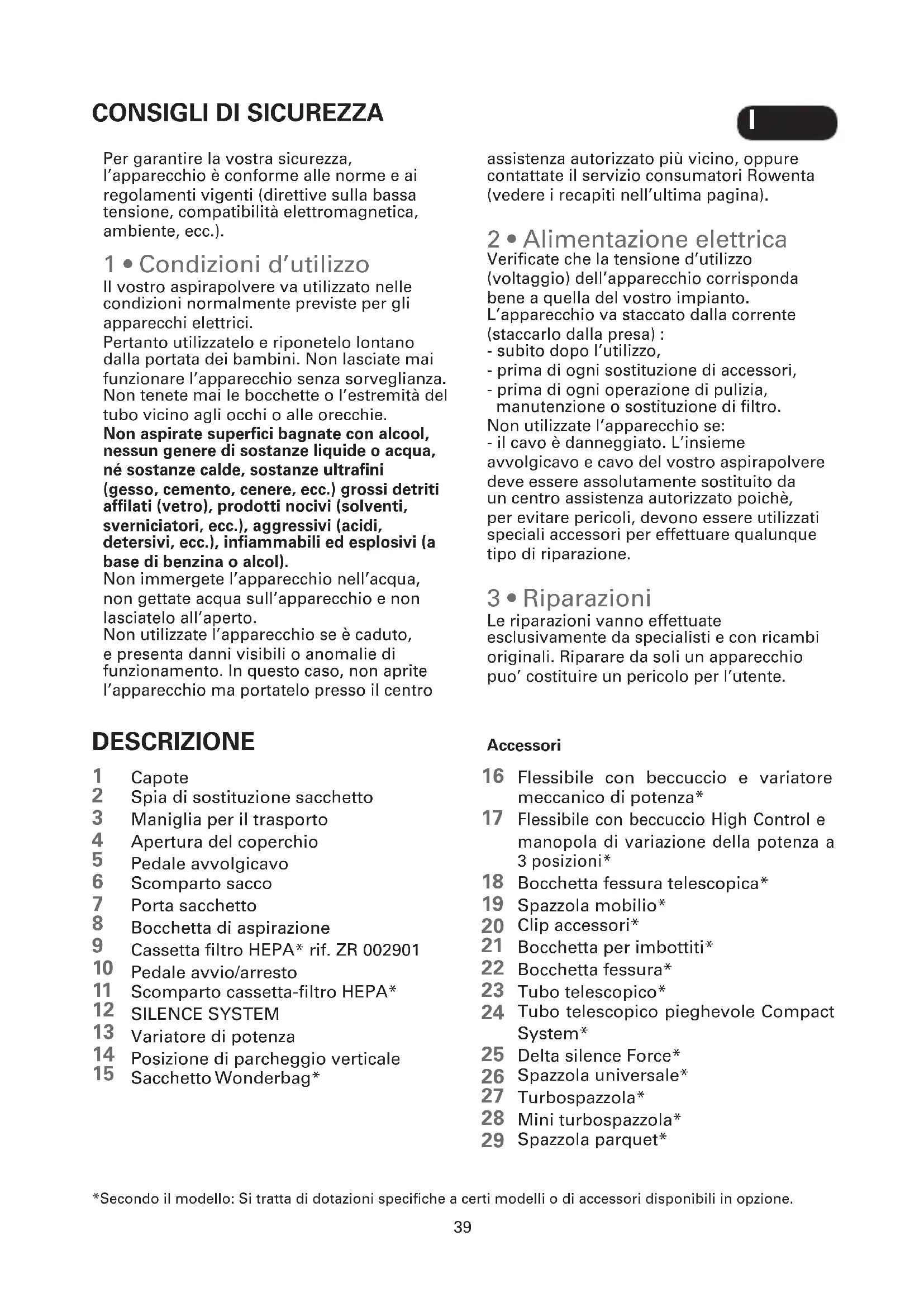 DESCRIZIONE Capote Spia di sostituzione sacchetto Maniglia per il trasporto Apertura del coperchio Pedale avvolgicavo Scomparto sacco Porta sacchetto Bocchetta di aspirazione Cassetta filtro HEPA* rif. ZR 002901 Pedale avvio/arresto Scomparto cassetta-filtro HEPA* SILENCE SYSTEM Variatore di potenza Posizione di parcheggio verticale Sacchetto Wonderbag* Flessibile con beccuccio e variatore meccanico di potenza* Flessibile con beccuccio High Control e manopola di variazione della potenza a 3 posizioni* Bocchetta fessura telescopica* Spazzola mobilio* Clip accessori* Bocchetta per imbottiti* Bocchetta fessura* Tubo telescopico* Tubo telescopico pieghevole Compact System* Delta silence Force* Spazzola universale* Turbospazzola* Mini turbospazzola* Spazzola parquet* *Secondo il modello: Si tratta di dotazioni specifiche a certi modelli o di accessori disponibili in opzione. Accessori