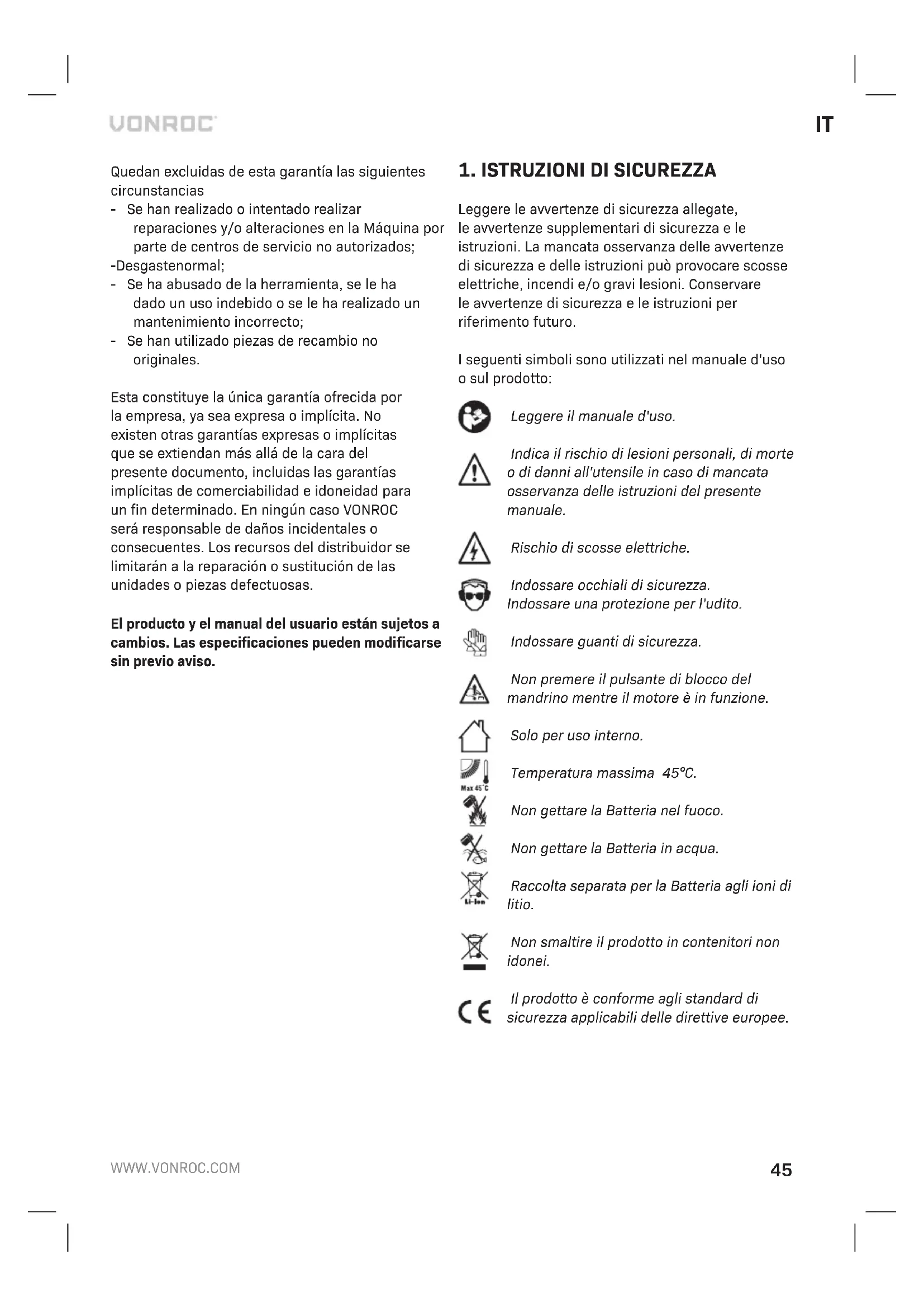 Rimuovere lo sporco molto persistente con un panno morbido inumidito con sapone. Non utilizzare solventi come benzina, alcol, ammoniaca, ecc. Tali sostanze chimiche danneggiano i componenti sintetici. GARANZIA I prodotti VONROC sono sviluppati secondo i più alti standard qualitativi e sono garantiti privi di difetti sia di materiale che di lavorazione per il periodo legalmente stabilito a partire dalla data di acquisto originale. Se durante questo periodo il prodotto dovesse presentare guasti dovuti a difetti di materiale e/o di lavorazione, contattare direttamente VONROC. Le seguenti circostanze sono escluse da questa garanzia: - La macchina è stata riparata o alterata da centri di assistenza non autorizzati; - Normale usura; - L'utensile è stato utilizzato in modo improprio o non corretto; - Sono stati utilizzati ricambi non originali. Questa costituisce l'unica garanzia espressa o implicita dell'azienda. Non esistono altre garanzie espresse o implicite che vadano al di là di quanto riportato nel presente documento, comprese le garanzie implicite di commerciabilità e di idoneità a uno scopo particolare. In nessun caso VONROC sarà responsabile di eventuali danni incidentali o consequenziali. I rimedi del rivenditore saranno limitati alla riparazione o alla sostituzione di unità o parti non conformi. Il prodotto e il manuale d'uso sono soggetti a modifiche. Le specifiche possono essere modificate senza ulteriore preavviso.