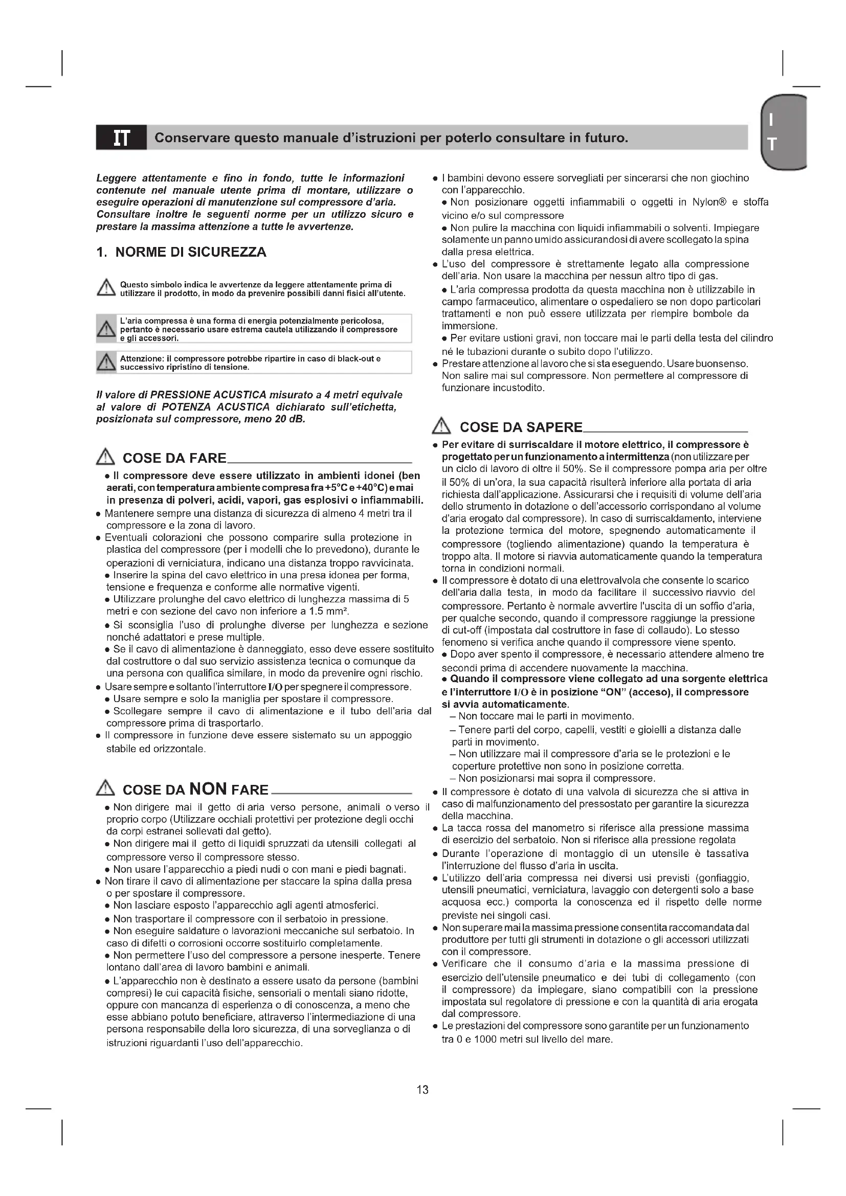● Per evitare di surriscaldare il motore elettrico, il compressore è progettato per un funzionamento a intermittenza (non utilizzare per un ciclo di lavoro di oltre il 50%. Se il compressore pompa aria per oltre il 50% di un’ora, la sua capacità risulterà inferiore alla portata di aria richiesta dall’applicazione. Assicurarsi che i requisiti di volume dell’aria dello strumento in dotazione o dell’accessorio corrispondano al volume d’aria erogato dal compressore). In caso di surriscaldamento, interviene la protezione termica del motore, spegnendo automaticamente il compressore (togliendo alimentazione) quando la temperatura è troppo alta. Il motore si riavvia automaticamente quando la temperatura torna in condizioni normali. ● Il compressore è dotato di una elettrovalvola che consente lo scarico dell'aria dalla testa, in modo da facilitare il successivo riavvio del compressore. Pertanto è normale avvertire l'uscita di un sofo d'aria, per qualche secondo, quando il compressore raggiunge la pressione di cut-off (impostata dal costruttore in fase di collaudo). Lo stesso fenomeno si verica anche quando il compressore viene spento. ● Dopo aver spento il compressore, è necessario attendere almeno tre secondi prima di accendere nuovamente la macchina. ● Quando il compressore viene collegato ad una sorgente elettrica e l’interruttore I/O è in posizione “ON” (acceso), il compressore si avvia automaticamente. – Non toccare mai le parti in movimento. – Tenere parti del corpo, capelli, vestiti e gioielli a distanza dalle parti in movimento. – Non utilizzare mai il compressore d’aria se le protezioni e le coperture protettive non sono in posizione corretta. – Non posizionarsi mai sopra il compressore. ● Il compressore è dotato di una valvola di sicurezza che si attiva in caso di malfunzionamento del pressostato per garantire la sicurezza della macchina. ● La tacca rossa del manometro si riferisce alla pressione massima di esercizio del serbatoio. Non si riferisce alla pressione regolata ● Durante l’operazione di montaggio di un utensile è tassativa l’interruzione del usso d’aria in uscita. ● L’utilizzo dell’aria compressa nei diversi usi previsti (gonaggio, utensili pneumatici, verniciatura, lavaggio con detergenti solo a base acquosa ecc.) comporta la conoscenza ed il rispetto delle norme previste nei singoli casi. ● Non superare mai la massima pressione consentita raccomandata dal produttore per tutti gli strumenti in dotazione o gli accessori utilizzati con il compressore. ● Verificare che il consumo d’aria e la massima pressione di esercizio dell’utensile pneumatico e dei tubi di collegamento (con il compressore) da impiegare, siano compatibili con la pressione impostata sul regolatore di pressione e con la quantità di aria erogata dal compressore. ● Le prestazioni del compressore sono garantite per un funzionamento tra 0 e 1000 metri sul livello del mare. Conservare questo manuale d’istruzioni per poterlo consultare in futuro. ITI