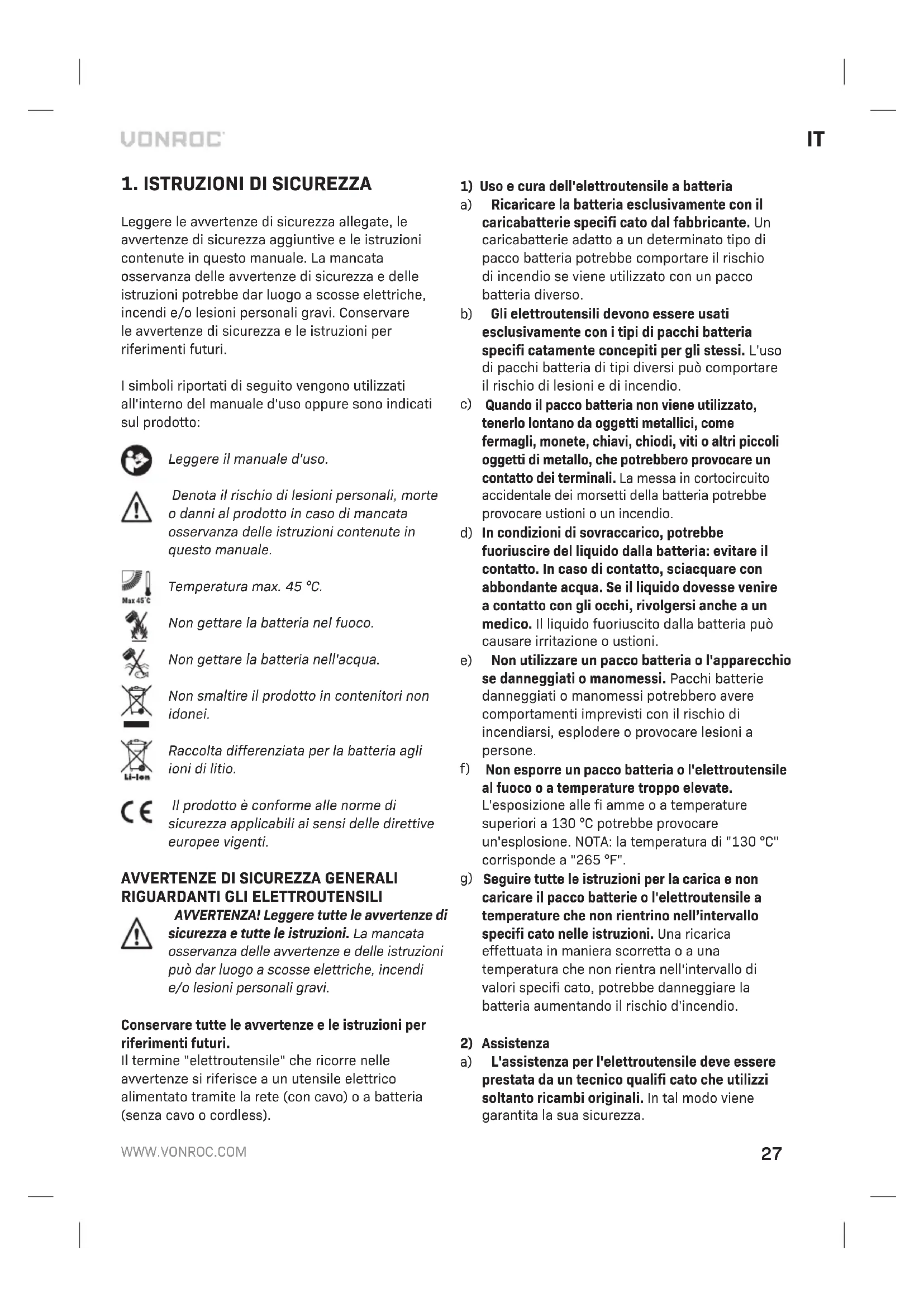 pericolose. Smaltire il prodotto in maniera responsabile presso un centro di smaltimento o riciclaggio dei rifi uti autorizzato. Solo per i Paesi CE Non smaltire gli apparecchi elettrici insieme ai rifi uti domestici. Secondo la Direttiva europea 2012/19/ UE sui rifi uti delle apparecchiature elettriche ed elettroniche e la relativa implementazione nelle normative locali, gli elettroutensili ormai inutilizzabili devono essere raccolti separatamente e smaltiti in modo ecologico. GARANZIA I prodotti VONROC sono sviluppati secondo gli standard di qualità più elevati e sono garantiti esenti da difetti sia per quanto riguarda i materiali che la lavorazione, per il periodo stabilito per legge a decorrere dalla data di acquisto iniziale. Se durante questo periodo il prodotto dovesse presentare dei difetti di materiali e/o di lavorazione, contattare direttamente VONROC. Le seguenti circostanze sono escluse dalla garanzia: