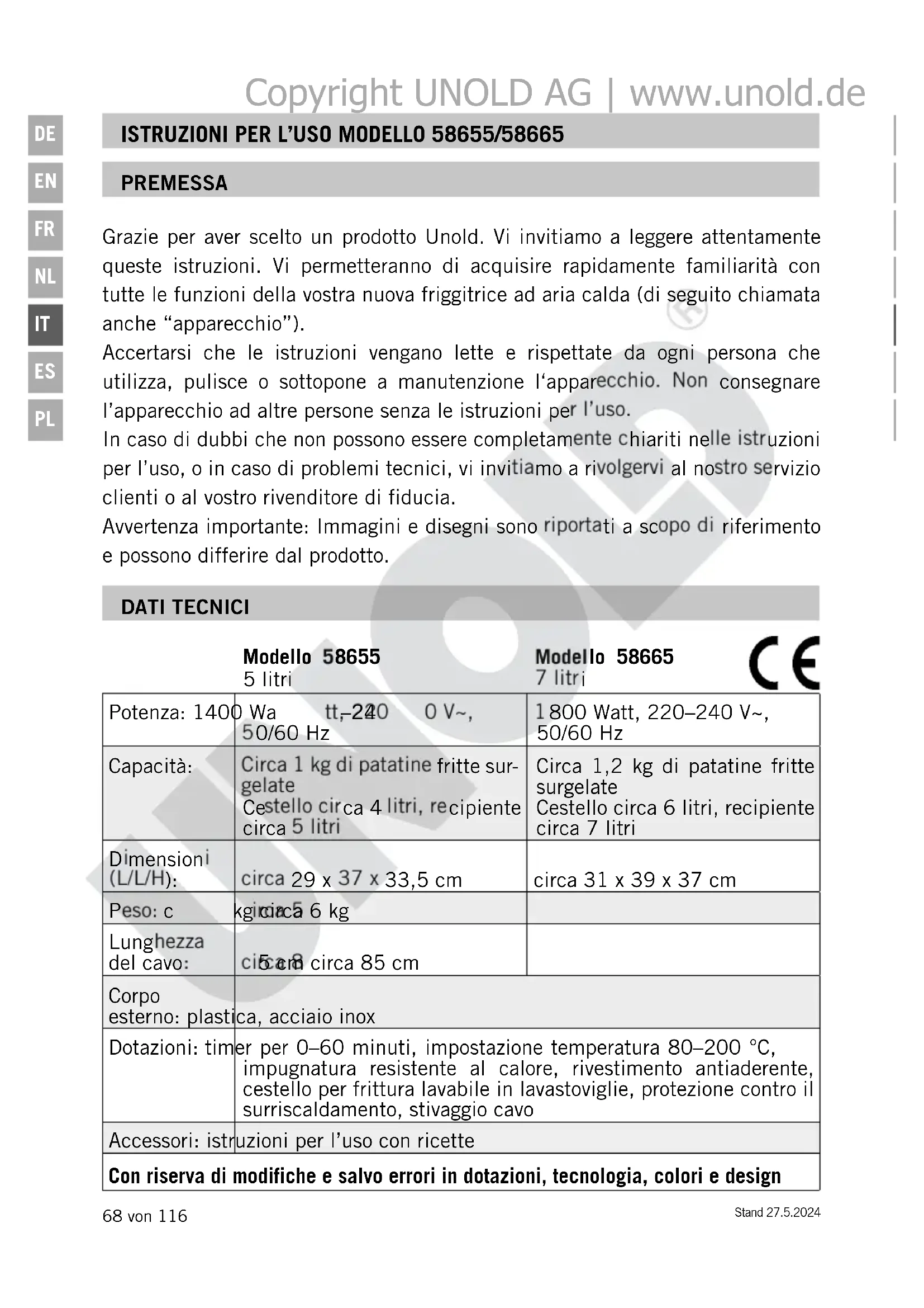 PREMESSA Grazie per aver scelto un prodotto Unold. Vi invitiamo a leggere attentamente queste istruzioni. Vi permetteranno di acquisire rapidamente familiarità con tutte le funzioni della vostra nuova friggitrice ad aria calda (di seguito chiamata anche “apparecchio”). Accertarsi che le istruzioni vengano lette e rispettate da ogni persona che utilizza, pulisce o sottopone a manutenzione l‘apparecchio. Non consegnare l’apparecchio ad altre persone senza le istruzioni per l’uso. In caso di dubbi che non possono essere completamente chiariti nelle istruzioni per l’uso, o in caso di problemi tecnici, vi invitiamo a rivolgervi al nostro servizio clienti o al vostro rivenditore di fiducia. Avvertenza importante: Immagini e disegni sono riportati a scopo di riferimento e possono differire dal prodotto. DATI TECNICI Modello 58655 5 litri Modello 58665 7 litri Potenza: 1400 Watt, 220–240 V~, 50/60 Hz 1800 Watt, 220–240 V~, 50/60 Hz Capacità: Circa 1 kg di patatine fritte sur- gelate Cestello circa 4 litri, recipiente circa 5 litri Circa 1,2 kg di patatine fritte surgelate Cestello circa 6 litri, recipiente circa 7 litri Dimensioni (L/L/H): circa 29 x 37 x 33,5 cm circa 31 x 39 x 37 cm Peso: circa 5 kg circa 6 kg Lunghezza del cavo: circa 85 cm circa 85 cm Corpo esterno: plastica, acciaio inox Dotazioni: timer per 0–60 minuti, impostazione temperatura 80–200 °C, impugnatura resistente al calore, rivestimento antiaderente, cestello per frittura lavabile in lavastoviglie, protezione contro il surriscaldamento, stivaggio cavo Accessori: istruzioni per l’uso con ricette Con riserva di modifiche e salvo errori in dotazioni, tecnologia, colori e design Copyright UNOLD AG | www.unold.deStand 27.5.2024 69 von 116