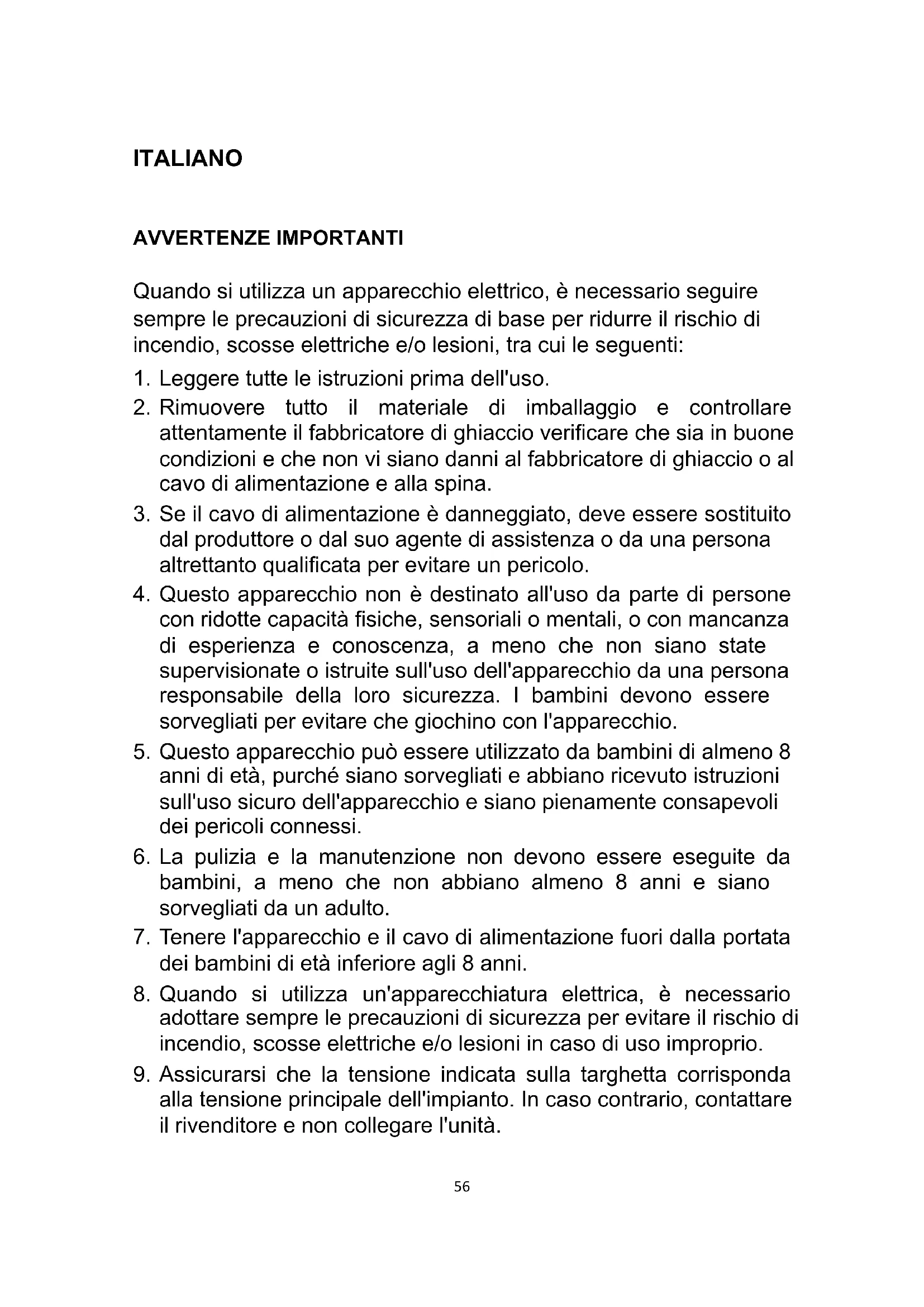 2. Per la produzione di ghiaccio è necessario utilizzare acqua o bevande potabili.
