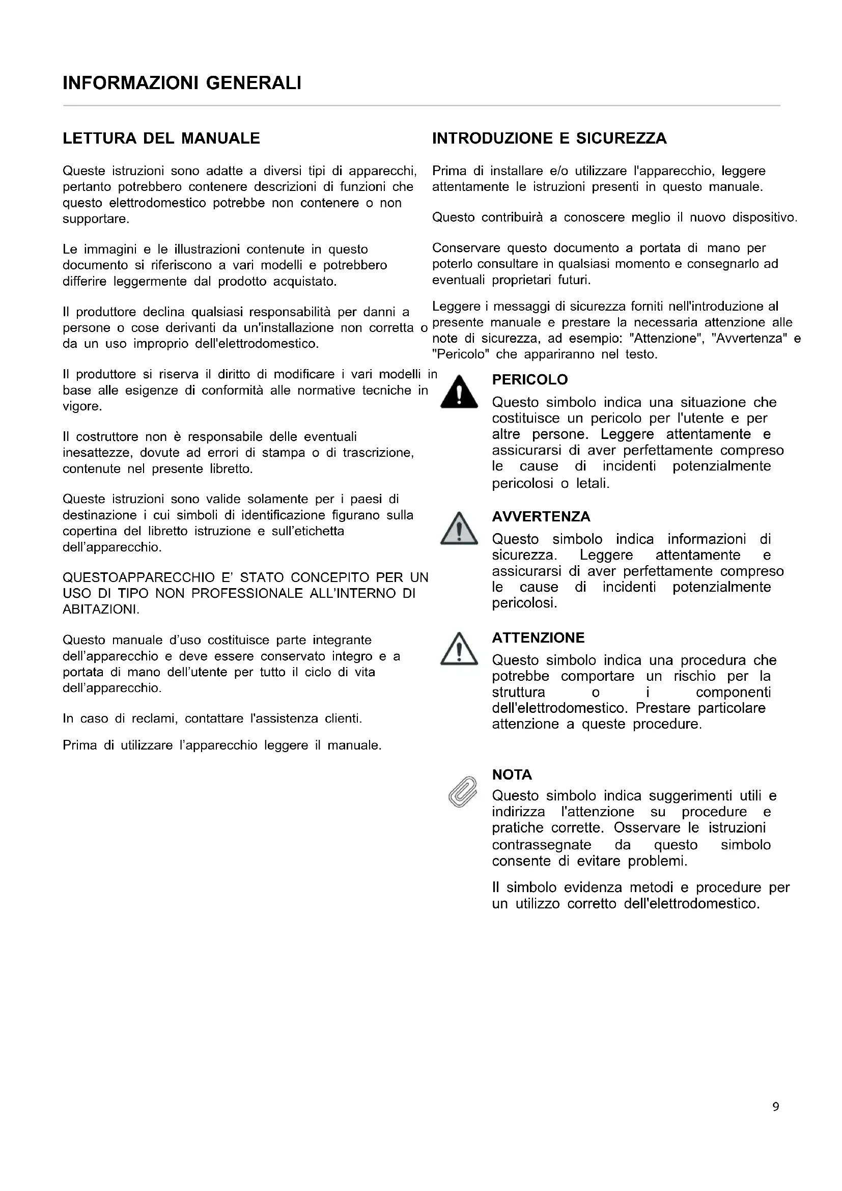 Prima di installare e/o utilizzare l'apparecchio, leggere attentamente le istruzioni presenti in questo manuale. Questo contribuirà a conoscere meglio il nuovo dispositivo. Conservare questo documento a portata di mano per poterlo consultare in qualsiasi momento e consegnarlo ad eventuali proprietari futuri. Leggere i messaggi di sicurezza forniti nell'introduzione al presente manuale e prestare la necessaria attenzione alle note di sicurezza, ad esempio: "Attenzione", "Avvertenza" e "Pericolo" che appariranno nel testo. PERICOLO Questo simbolo indica una situazione che costituisce un pericolo per l'utente e per altre persone. Leggere attentamente e assicurarsi di aver perfettamente compreso le cause di incidenti potenzialmente pericolosi o letali. AVVERTENZA Questo simbolo indica informazioni di sicurezza. Leggere attentamente e assicurarsi di aver perfettamente compreso le cause di incidenti potenzialmente pericolosi. ATTENZIONE Questo simbolo indica una procedura che potrebbe comportare un rischio per la struttura o i componenti dell'elettrodomestico. Prestare particolare attenzione a queste procedure. NOTA Questo simbolo indica suggerimenti utili e indirizza l'attenzione su procedure e pratiche corrette. Osservare le istruzioni contrassegnate da questo simbolo consente di evitare problemi. Il simbolo evidenza metodi e procedure per un utilizzo corretto dell'elettrodomestico. 9INFORMAZIONI GENERALI