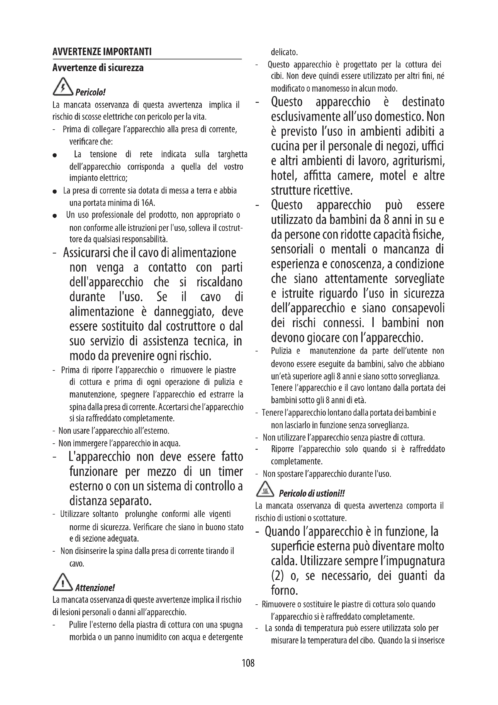 DOSES PARA: 8-10 waes PREPARAÇÃO: 10 min TEMPO DE COZEDURA: 15 min INGREDIENTES: - farinha 00 460 g - sal 1 colher de chá - fermento para bolos 3 g - açúcar 170 g - ovos 2 - leite morno 1345 ml - manteiga 80 g - extrato de baunilha 1 colher de chá - chocolate fundente 140 g - cacau em pó 60 g - canela 6 g PREPARAÇÃO: Insira as placas para waes, coloque o chocolate e a manteiga numa taça para micro-ondas e aqueça no forno à potência máxima durante 30 segundos. Misture até o chocolate e a manteiga derreterem completamente e o composto car liso. Deixe arrefecer ligeiramente. Bata com umas varas os ovos, o leite e a baunilha numa taça grande e incorpore a mistura de chocolate arrefecida até obter um composto liso. Peneire a farinha, o açúcar, o cacau em pó, a canela, o fermento e o sal juntos numa taça grande. Adicione a mistura de farinha e outros ingredientes aos ovos e bata tudo com umas varas até o composto car sucientemente liso. Regule os termóstatos para a posição desejada. Pré-aqueça a placa para waes. Quando o visor apresentar a mensagem “READY”, unte a placa para waes com manteiga derretida ou spray de cozinha antiaderente e deite uma medida do composto para duas formas da placa, utilizando uma colher, se necessário. Estenda o composto com uma espátula. Coza as waes até carem douradas e crocantes (5 min.). Repita até acabar o composto. Sirva de imediato.108 AVVERTENZE IMPORTANTI Avvertenze di sicurezza Pericolo! La mancata osservanza di questa avvertenza implica il rischio di scosse elettriche con pericolo per la vita. - Prima di collegare l’apparecchio alla presa di corrente, vericare che: ● La tensione di rete indicata sulla targhetta dell’apparecchio corrisponda a quella del vostro impianto elettrico; ● La presa di corrente sia dotata di messa a terra e abbia una portata minima di 16A. ● Un uso professionale del prodotto, non appropriato o non conforme alle istruzioni per l'uso, solleva il costrut- tore da qualsiasi responsabilità. - Assicurarsi che il cavo di alimentazione non venga a contatto con parti dell'apparecchio che si riscaldano durante l'uso. Se il cavo di alimentazione è danneggiato, deve essere sostituito dal costruttore o dal suo servizio di assistenza tecnica, in modo da prevenire ogni rischio. - Prima di riporre l’apparecchio o rimuovere le piastre di cottura e prima di ogni operazione di pulizia e manutenzione, spegnere l’apparecchio ed estrarre la spina dalla presa di corrente. Accertarsi che l’apparecchio si sia rareddato completamente. - Non usare l’apparecchio all’esterno. - Non immergere l’apparecchio in acqua. - L'apparecchio non deve essere fatto funzionare per mezzo di un timer esterno o con un sistema di controllo a distanza separato. - Utilizzare soltanto prolunghe conformi alle vigenti norme di sicurezza. Vericare che siano in buono stato e di sezione adeguata. - Non disinserire la spina dalla presa di corrente tirando il cavo. Attenzione! La mancata osservanza di queste avvertenze implica il rischio di lesioni personali o danni all’apparecchio. - Pulire l'esterno della piastra di cottura con una spugna morbida o un panno inumidito con acqua e detergente delicato. - Questo apparecchio è progettato per la cottura dei cibi. Non deve quindi essere utilizzato per altri ni, né modicato o manomesso in alcun modo. - Questo apparecchio è destinato esclusivamente all’uso domestico. Non è previsto l’uso in ambienti adibiti a cucina per il personale di negozi, uci e altri ambienti di lavoro, agriturismi, hotel, atta camere, motel e altre strutture ricettive. - Questo apparecchio può essere utilizzato da bambini da 8 anni in su e da persone con ridotte capacità siche, sensoriali o mentali o mancanza di esperienza e conoscenza, a condizione che siano attentamente sorvegliate e istruite riguardo l’uso in sicurezza dell’apparecchio e siano consapevoli dei rischi connessi. I bambini non devono giocare con l’apparecchio. - Pulizia e manutenzione da parte dell’utente non devono essere eseguite da bambini, salvo che abbiano un’età superiore agli 8 anni e siano sotto sorveglianza. Tenere l’apparecchio e il cavo lontano dalla portata dei bambini sotto gli 8 anni di età. - Tenere l’apparecchio lontano dalla portata dei bambini e non lasciarlo in funzione senza sorveglianza. - Non utilizzare l’apparecchio senza piastre di cottura. - Riporre l’apparecchio solo quando si è rareddato completamente. - Non spostare l’apparecchio durante l'uso. Pericolo di ustioni!! La mancata osservanza di questa avvertenza comporta il rischio di ustioni o scottature. - Quando l’apparecchio è in funzione, la supercie esterna può diventare molto calda. Utilizzare sempre l’impugnatura (2) o, se necessario, dei guanti da forno. - Rimuovere o sostituire le piastre di cottura solo quando l’apparecchio si è rareddato completamente. - La sonda di temperatura può essere utilizzata solo per misurare la temperatura del cibo. Quando la si inserisce109 nell’alimento, fare attenzione a non toccare le parti calde! Nota bene: Questo simbolo segnala raccomandazioni e informazioni importanti per l’utente. - Non cuocere alimenti avvolti in pellicole di plastica, di alluminio o in sacchetti di polietilene per evitare il rischio di incendio. - Dopo la pulizia, le piastre di cottura devono essere asciugate prima di reinstallarle nell'apparecchio. Questo apparecchio è conforme alla direttiva CEE 1935/2004 relativa a materiali e oggetti destinati a venire a contatto con alimenti. Smaltimento dell’apparecchio Non smaltire l’apparecchio insieme ai riuti domestici ma consegnarlo ad un centro di raccolta dierenziata uciale. DESCRIZIONE