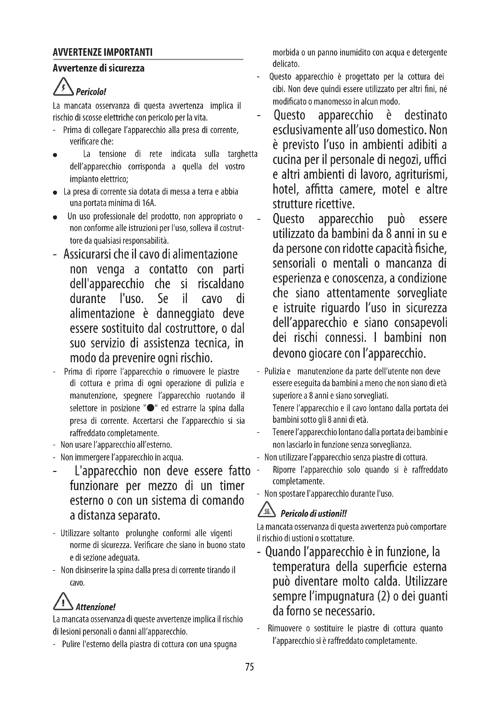 INGREDIENTES: - ananás 1 - mel q.b. - açúcar de cana q.b. - menta fresca q.b. - açúcar em pó q.b. - gelado de baunilha q.b. PREPARAÇÃO: Retire as folhas e a casca ao ananás. Corte o fruto às rodelas com 1-2 cm de espessura e polvilhe cada fatia com açúcarde canade ambos os lados. Insira a placa grill em baixo, a placa lisa em cima e coloque o aparelho no modo GRELHADOR DE PLACAS. Regule o seletor do termóstato inferior e superior para MED. Prima a tecla START/STOP para pré-aquecer a grelha. Quando os indicadores luminosos das placas superior e inferior se apagarem, pincele o ananás de ambos os lados com mel e coloque-o na grelha. Feche a grelha e coza durante 5-6 minutos. Uma vez cozidas, coloque as rodelas numa travessa, decore com folhas de menta fresca, polvilhe com açúcar em pó e sirva com bolas de gelado.75 AVVERTENZE IMPORTANTI Avvertenze di sicurezza Pericolo! La mancata osservanza di questa avvertenza implica il rischio di scosse elettriche con pericolo per la vita. - Prima di collegare l’apparecchio alla presa di corrente, vericare che: ● La tensione di rete indicata sulla targhetta dell’apparecchio corrisponda a quella del vostro impianto elettrico; ● La presa di corrente sia dotata di messa a terra e abbia una portata minima di 16A. ● Un uso professionale del prodotto, non appropriato o non conforme alle istruzioni per l'uso, solleva il costrut- tore da qualsiasi responsabilità. - Assicurarsi che il cavo di alimentazione non venga a contatto con parti dell'apparecchio che si riscaldano durante l'uso. Se il cavo di alimentazione è danneggiato deve essere sostituito dal costruttore, o dal suo servizio di assistenza tecnica, in modo da prevenire ogni rischio. - Prima di riporre l’apparecchio o rimuovere le piastre di cottura e prima di ogni operazione di pulizia e manutenzione, spegnere l’apparecchio ruotando il selettore in posizione "●" ed estrarre la spina dalla presa di corrente. Accertarsi che l’apparecchio si sia rareddato completamente. - Non usare l’apparecchio all’esterno. - Non immergere l’apparecchio in acqua. - L'apparecchio non deve essere fatto funzionare per mezzo di un timer esterno o con un sistema di comando a distanza separato. - Utilizzare soltanto prolunghe conformi alle vigenti norme di sicurezza. Vericare che siano in buono stato e di sezione adeguata. - Non disinserire la spina dalla presa di corrente tirando il cavo. Attenzione! La mancata osservanza di queste avvertenze implica il rischio di lesioni personali o danni all’apparecchio. - Pulire l'esterno della piastra di cottura con una spugna morbida o un panno inumidito con acqua e detergente delicato. - Questo apparecchio è progettato per la cottura dei cibi. Non deve quindi essere utilizzato per altri ni, né modicato o manomesso in alcun modo. - Questo apparecchio è destinato esclusivamente all’uso domestico. Non è previsto l’uso in ambienti adibiti a cucina per il personale di negozi, uci e altri ambienti di lavoro, agriturismi, hotel, atta camere, motel e altre strutture ricettive. - Questo apparecchio può essere utilizzato da bambini da 8 anni in su e da persone con ridotte capacità siche, sensoriali o mentali o mancanza di esperienza e conoscenza, a condizione che siano attentamente sorvegliate e istruite riguardo l’uso in sicurezza dell’apparecchio e siano consapevoli dei rischi connessi. I bambini non devono giocare con l’apparecchio. - Pulizia e manutenzione da parte dell’utente non deve essere eseguita da bambini a meno che non siano di età superiore a 8 anni e siano sorvegliati. Tenere l’apparecchio e il cavo lontano dalla portata dei bambini sotto gli 8 anni di età. - Tenere l’apparecchio lontano dalla portata dei bambini e non lasciarlo in funzione senza sorveglianza. - Non utilizzare l’apparecchio senza piastre di cottura. - Riporre l’apparecchio solo quando si è rareddato completamente. - Non spostare l’apparecchio durante l'uso. Pericolo di ustioni!! La mancata osservanza di questa avvertenza può comportare il rischio di ustioni o scottature. - Quando l’apparecchio è in funzione, la temperatura della supercie esterna può diventare molto calda. Utilizzare sempre l’impugnatura (2) o dei guanti da forno se necessario. - Rimuovere o sostituire le piastre di cottura quanto l’apparecchio si è rareddato completamente.76 Nota bene: Questo simbolo segnala raccomandazioni e informazioni importanti per l’utente. - Non cuocere alimenti avvolti in pellicole di plastica, di alluminio o in sacchetti di polietilene per evitare il rischio di incendio. Questo apparecchio è conforme alla direttiva CEE 1935/2004 relativa a materiali ed oggetti destinati a venire a contatto con i prodotti alimentari. Smaltimento dell’apparecchio Non smaltire l’apparecchio insieme ai riuti domestici ma consegnarlo ad un centro di raccolta dierenziata uciale. DESCRIZIONE