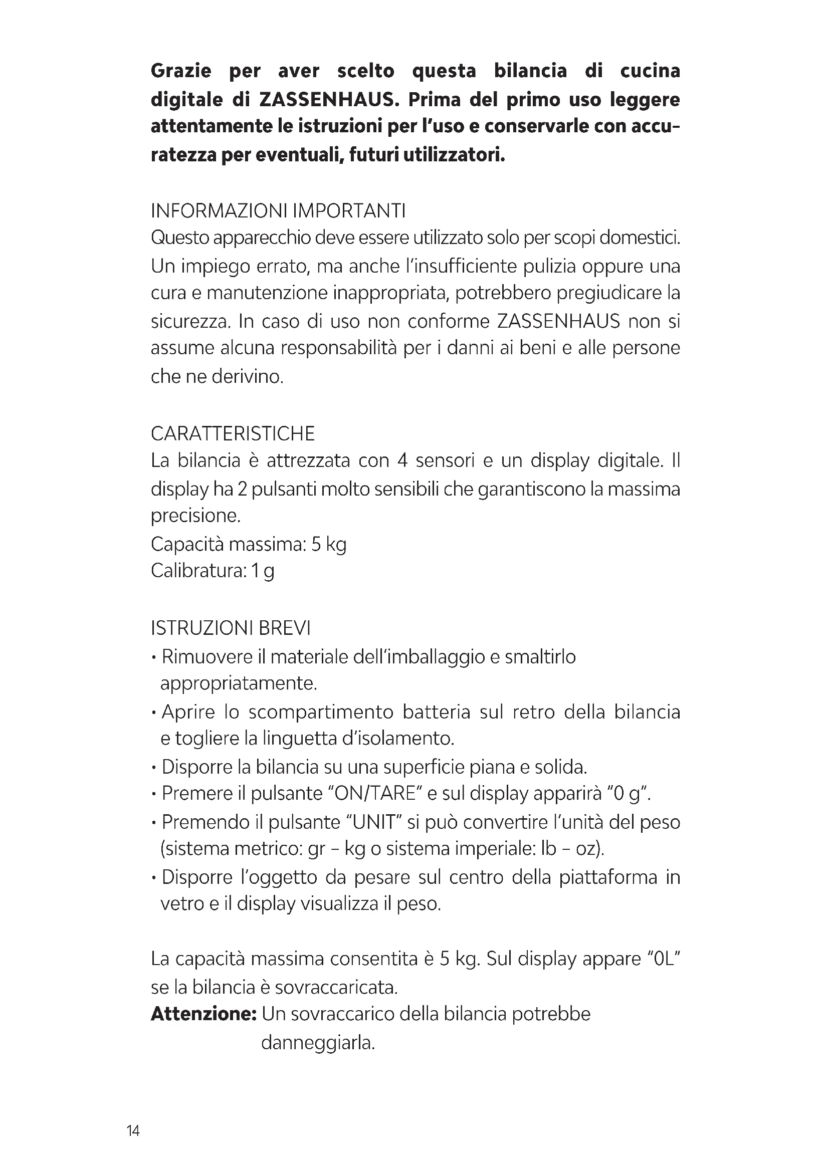 BALANCE BA Digital Waage "Balance" 073xxx.qxp_Layout 1 19.10.22 12:08 Seite 1314 Grazie per aver scelto questa bilancia di cucina digitale di ZASSENHAUS. Prima del primo uso leggere attentamente le istruzioni per l’uso e conservarle con accu- ratezza per eventuali, futuri utilizzatori. INFORMAZIONI IMPORTANTI Questo apparecchio deve essere utilizzato solo per scopi domestici. Un impiego errato, ma anche l’insufficiente pulizia oppure una cura e manutenzione inappropriata, potrebbero pregiudicare la sicurezza. In caso di uso non conforme ZASSENHAUS non si assume alcuna responsabilità per i danni ai beni e alle persone che ne derivino. CARATTERISTICHE La bilancia è attrezzata con 4 sensori e un display digitale. Il display ha 2 pulsanti molto sensibili che garantiscono la massima precisione. Capacità massima: 5 kg Calibratura: 1 g ISTRUZIONI BREVI