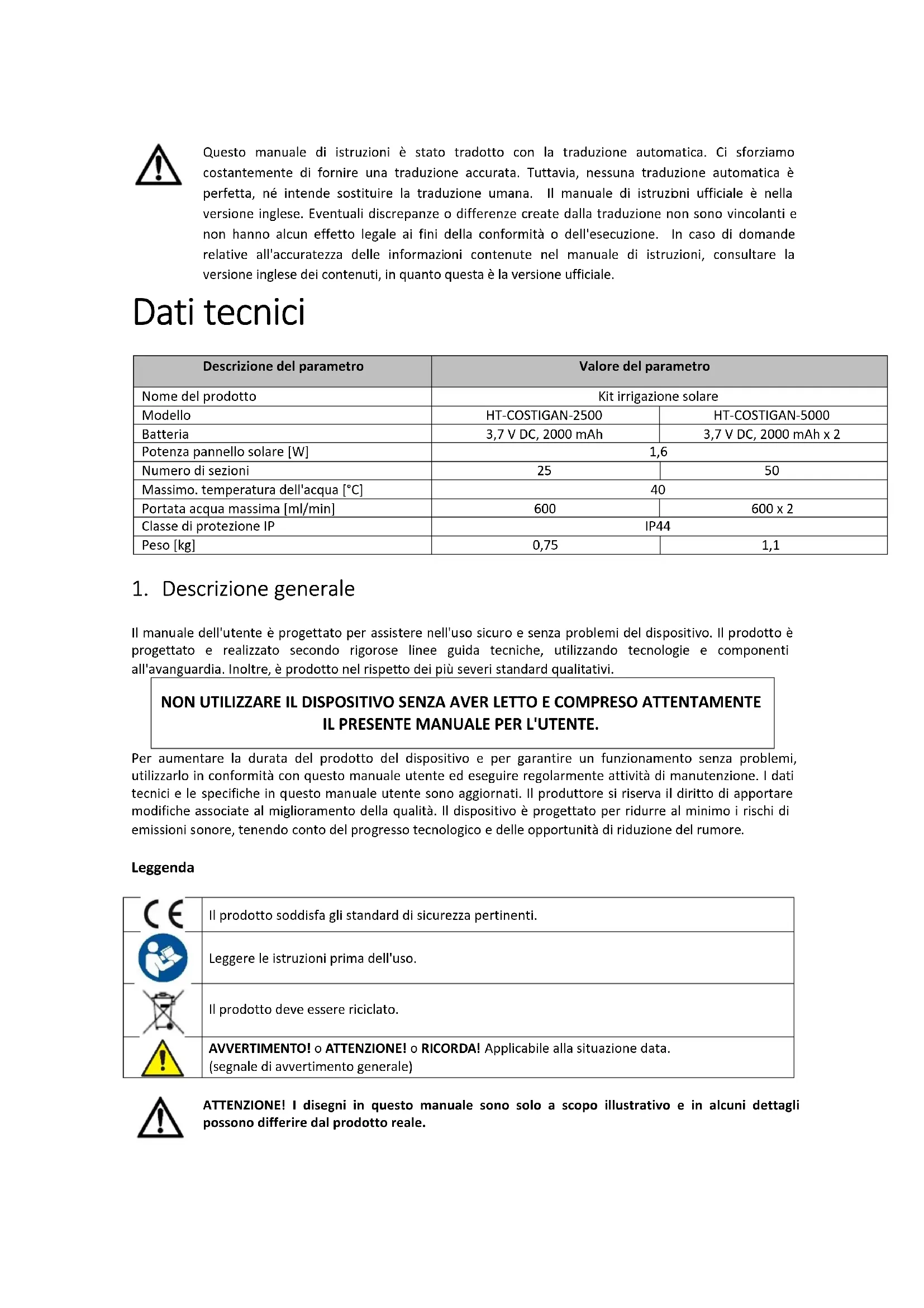Batteria scarica : se la batteria è scarica, lasciare che il pannello solare carichi la pompa per almeno 6-8 ore alla luce diretta del sole e non attivare spesso l'irrigazione. Basso livello dell'acqua : se non c'è abbastanza acqua nel contenitore dell'acqua, l'irrigazione verrà disattivata, riempire nuovamente l'acqua nel contenitore. Funzione ciclo : questo sistema di irrigazione è stato progettato con una funzione ciclo per il funzionamento dopo il tramonto. Basta impostare l'ora di funzionamento della pompa per la prima volta e la pompa funzionerà a ogni ciclo. 3.4. Pulizia e manutenzione a) Utilizzare solo detergenti non corrosivi per pulire la superficie. b) Conservare l'unità in un luogo fresco e asciutto, al riparo dall'umidità e dall'esposizione diretta alla luce solare. c) Non spruzzare il dispositivo con un getto d'acqua o immergerlo in acqua. d) Il dispositivo deve essere regolarmente ispezionato per verificarne l'efficienza tecnica e individuare eventuali danni. e) Per la pulizia utilizzare un panno morbido. f) Non utilizzare oggetti appuntiti e/o metallici per la pulizia (ad es. una spazzola metallica o una spatola metallica) perché potrebbero danneggiare il materiale della superficie dell'apparecchio. g) Non pulire il dispositivo con una sostanza acida, agenti di uso medico, diluenti, carburante, oli o altre sostanze chimiche perché potrebbe danneggiare il dispositivo. h) Il pannello solare deve essere pulito regolarmente per ottimizzare la ricarica delle celle. RIMOZIONE SICURA DELLE BATTERIE E DELLE BATTERIE RICARICABILI: Nei dispositivi sono installate batterie da 3,7 V CC, 2000 mAh. Rimuovere le batterie usate dal dispositivo utilizzando la stessa procedura con cui le hai installate. Riciclare le batterie con l'organizzazione o la società appropriata. SMALTIMENTO DEI DISPOSITIVI USATI: Non smaltire questo dispositivo nei rifiuti urbani. Consegnarlo a un punto di riciclaggio e raccolta di dispositivi elettrici ed elettrici. Controllare il simbolo sul prodotto, sul manuale di istruzioni e sulla confezione. Le materie plastiche utilizzate per costruire il dispositivo possono essere riciclate in conformità con i loro contrassegni. Scegliendo di riciclare, contribuisci in modo significativo alla protezione del nostro ambiente. Contattare le autorità locali per informazioni sull'impianto di riciclaggio locale.Este manual de instrucciones ha sido traducido automáticamente. Nos esforzamos constantemente por ofrecer una traducción precisa. Sin embargo, ninguna traducción automática es perfecta. Tampoco pretende sustituir a la traducción realizada por un ser humano. El manual de instrucciones oficial es la versión inglesa. Cualquier discrepancia o diferencia en la traducción no es vinculante ni tiene ningún efecto legal a efectos de cumplimiento o ejecución. En caso de duda sobre la exactitud de la información incluida en las instrucciones de uso, consulte la versión inglesa de estos contenidos, ya que esta es la versión oficial. Características técnicas Descripción del parámetro Valor del parámetro Nombre del producto Sistema de riego solar Modelo HT-COSTIGAN-2500 HT-COSTIGAN-5000 Batería 3,7 V DC, 2000 mAh 3,7 V DC, 2000 mAh x 2 Potencia del panel solar [W] 1,6 Número de secciones