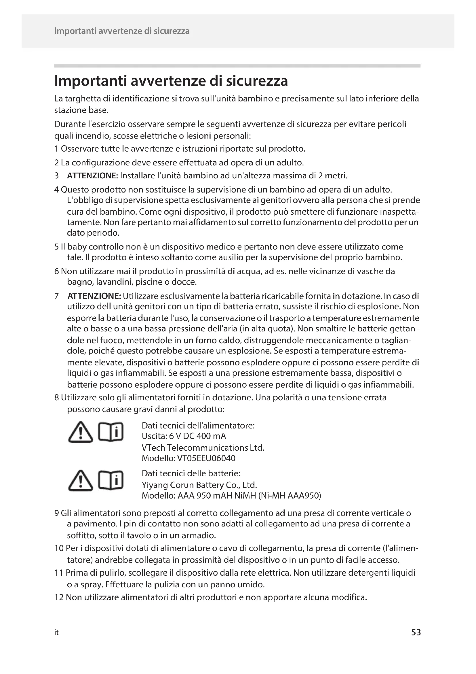 dole nel fuoco, mettendole in un forno caldo, distruggendole meccanicamente o taglian- dole, poiché questo potrebbe causare un'esplosione. Se esposti a temperature estrema- mente elevate, dispositivi o batterie possono esplodere oppure ci possono essere perdite di liquidi o gas infiammabili. Se esposti a una pressione estremamente bassa, dispositivi o batterie possono esplodere oppure ci possono essere perdite di liquidi o gas infiammabili. 8 Utilizzare solo gli alimentatori forniti in dotazione. Una polarità o una tensione errata possono causare gravi danni al prodotto: 9 Gli alimentatori sono preposti al corretto collegamento ad una presa di corrente verticale o a pavimento. I pin di contatto non sono adatti al collegamento ad una presa di corrente a soffitto, sotto il tavolo o in un armadio. 10 Per i dispositivi dotati di alimentatore o cavo di collegamento, la presa di corrente (l'alimen- tatore) andrebbe collegata in prossimità del dispositivo o in un punto di facile accesso. 11 Prima di pulirlo, scollegare il dispositivo dalla rete elettrica. Non utilizzare detergenti liquidi o a spray. Effettuare la pulizia con un panno umido. 12 Non utilizzare alimentatori di altri produttori e non apportare alcuna modifica. Dati tecnici dell'alimentatore: Uscita: 6 V DC 400 mA VTech Telecommunications Ltd. Modello: VT05EEU06040 Dati tecnici delle batterie: Yiyang Corun Battery Co., Ltd. Modello: AAA 950 mAH NiMH (Ni-MH AAA950)Gigaset BABY100 Audio / ALL DE de / A31008-N1225-B101-1-43 / BABY100_it.fm / 5/22/25 Template Module, Version 2.2, 15.11.2022 / Template Basiseinstellungen - 29.11.2022 Importanti avvertenze di sicurezza
