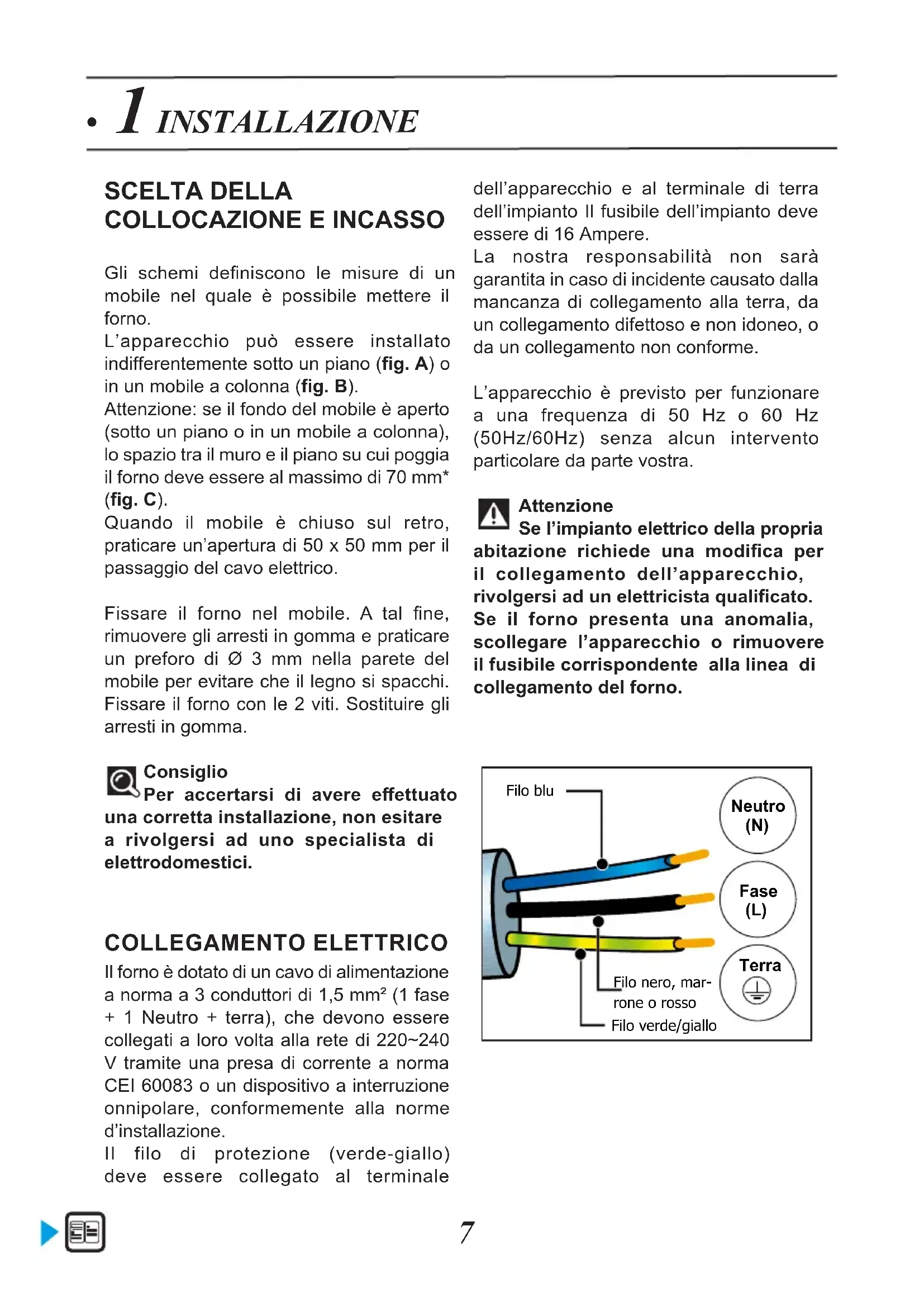 Gli schemi deniscono le misure di un mobile nel quale è possibile mettere il forno.L’apparecchio può essere installato indifferentemente sotto un piano (g. A) o in un mobile a colonna (g. B). Attenzione: se il fondo del mobile è aperto (sotto un piano o in un mobile a colonna), lo spazio tra il muro e il piano su cui poggia il forno deve essere al massimo di 70 mm* (g. C).Quando il mobile è chiuso sul retro, praticare un’apertura di 50 x 50 mm per il passaggio del cavo elettrico. Fissare il forno nel mobile. A tal ne, rimuovere gli arresti in gomma e praticare un preforo di Ø 3 mm nella parete del mobile per evitare che il legno si spacchi. Fissare il forno con le 2 viti. Sostituire gli arresti in gomma.Consiglio Per accertarsi di avere eettuato una corretta installazione, non esitare a rivolgersi ad uno specialista di elettrodomestici. COLLEGAMENTO ELETTRICO Il forno è dotato di un cavo di alimentazione a norma a 3 conduttori di 1,5 mm² (1 fase + 1 Neutro + terra), che devono essere collegati a loro volta alla rete di 220~240 V tramite una presa di corrente a norma CEI 60083 o un dispositivo a interruzione onnipolare, conformemente alla norme d’installazione.II filo di protezione (verde-giallo) deve essere collegato al terminale dell’apparecchio e al terminale di terra dell’impianto Il fusibile dell’impianto deve essere di 16 Ampere.La nostra responsabilità non sarà garantita in caso di incidente causato dalla mancanza di collegamento alla terra, da un collegamento difettoso e non idoneo, o da un collegamento non conforme.L’apparecchio è previsto per funzionare a una frequenza di 50 Hz o 60 Hz (50Hz/60Hz) senza alcun intervento particolare da parte vostra.Attenzione Se l’impianto elettrico della propria abitazione richiede una modica per il collegamento dell’apparecchio, rivolgersi ad un elettricista qualicato. Se il forno presenta una anomalia, scollegare l’apparecchio o rimuovere il fusibile corrispondente alla linea di collegamento del forno. Filo blu Neutro (N) Fase (L) Filo nero, mar-rone o rosso Filo verde/giallo Terra8