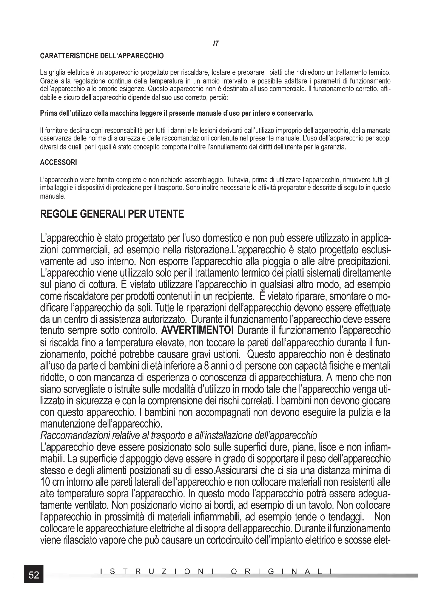 La griglia elettrica è un apparecchio progettato per riscaldare, tostare e preparare i piatti che richiedono un trattamento termico. Grazie alla regolazione continua della temperatura in un ampio intervallo, è possibile adattare i parametri di funzionamento dell’apparecchio alle proprie esigenze. Questo apparecchio non è destinato all’uso commerciale. Il funzionamento corretto, affi - dabile e sicuro dell’apparecchio dipende dal suo uso corretto, perciò: Prima dell’utilizzo della macchina leggere il presente manuale d’uso per intero e conservarlo. Il fornitore declina ogni responsabilità per tutti i danni e le lesioni derivanti dall’utilizzo improprio dell’apparecchio, dalla mancata osservanza delle norme di sicurezza e delle raccomandazioni contenute nel presente manuale. L’uso dell’apparecchio per scopi diversi da quelli per i quali è stato concepito comporta inoltre l’annullamento dei diritti dell’utente per la garanzia. ACCESSORI L’apparecchio viene fornito completo e non richiede assemblaggio. Tuttavia, prima di utilizzare l’apparecchio, rimuovere tutti gli imballaggi e i dispositivi di protezione per il trasporto. Sono inoltre necessarie le attività preparatorie descritte di seguito in questo manuale.