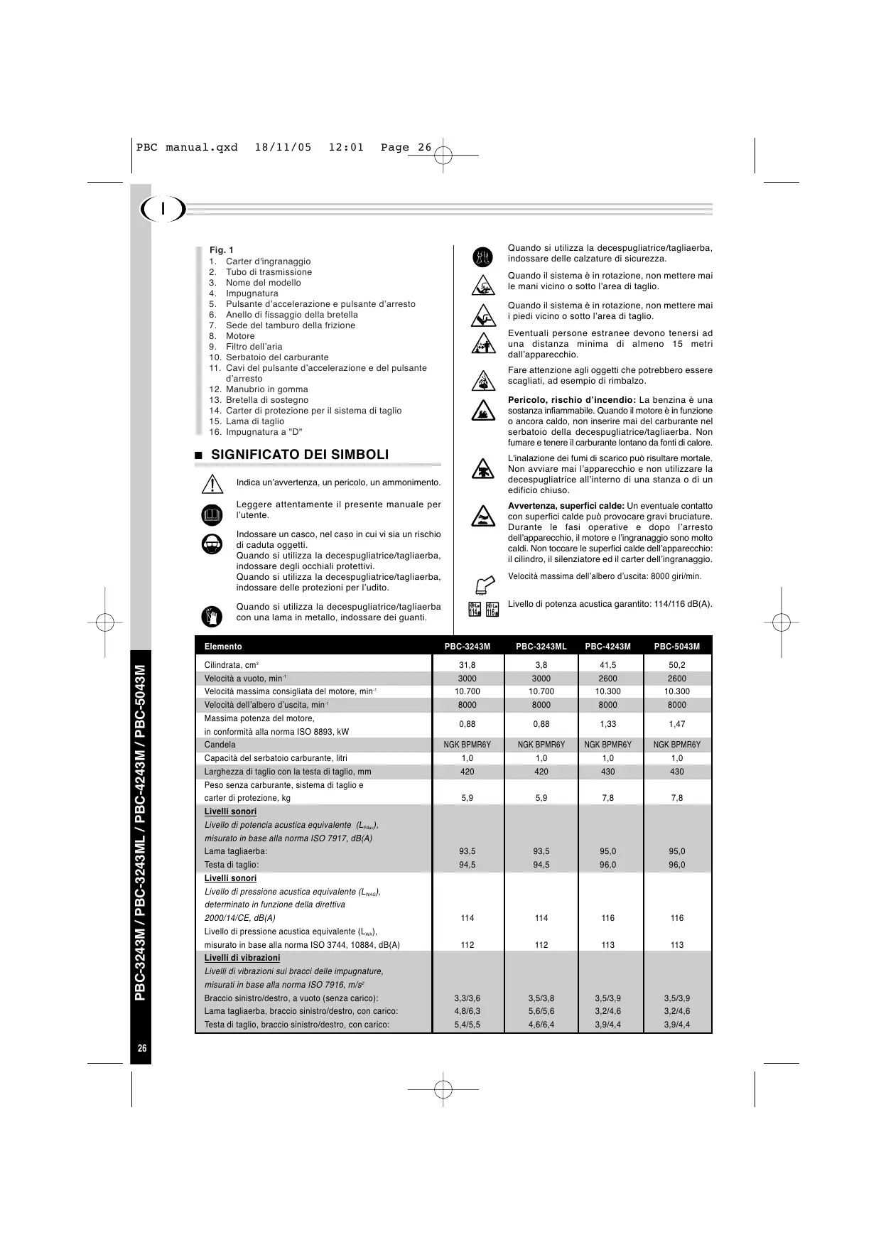 Cilindrata, cm3 Velocità a vuoto, min-1 Velocità massima consigliata del motore, min-1 Velocità dell’albero d’uscita, min-1 Massima potenza del motore, in conformità alla norma ISO 8893, kW Candela Capacità del serbatoio carburante, litri Larghezza di taglio con la testa di taglio, mm Peso senza carburante, sistema di taglio e carter di protezione, kg Livelli sonori Livello di potencia acustica equivalente (LPAav), misurato in base alla norma ISO 7917, dB(A) Lama tagliaerba: Testa di taglio: Livelli sonori Livello di pressione acustica equivalente (LWAG), determinato in funzione della direttiva 2000/14/CE, dB(A) Livello di pressione acustica equivalente (LWA), misurato in base alla norma ISO 3744, 10884, dB(A) Livelli di vibrazioni Livelli di vibrazioni sui bracci delle impugnature, misurati in base alla norma ISO 7916, m/s2 Braccio sinistro/destro, a vuoto (senza carico): Lama tagliaerba, braccio sinistro/destro, con carico: Testa di taglio, braccio sinistro/destro, con carico: PBC-3243M PBC-3243ML PBC-4243M PBC-5043M 31,8