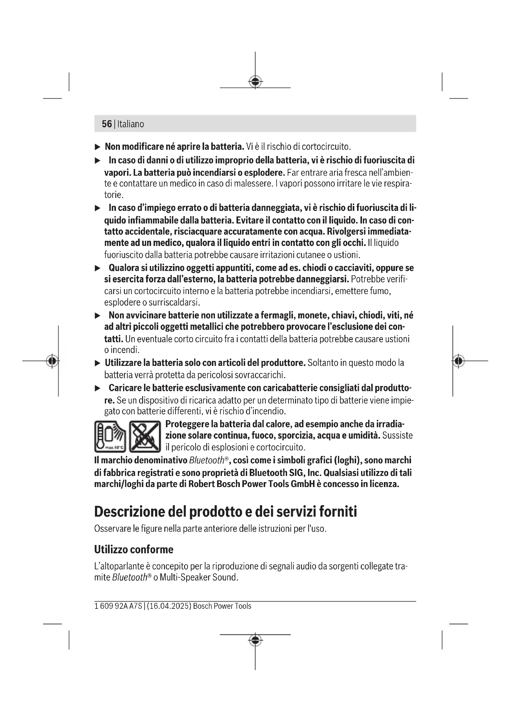 I LED degli indicatori del livello di carica della batteria, oltre al livello di carica della batte- ria, possono anche indicarne il rischio di guasto. Per attivare questa funzione, tenere premuto per 3 secondo il tasto dell’indicatore del li- vello di carica della batteria . Il processo di analisi della batteria viene segnalato da una sequenza lampeggiante dell’indicatore del livello di carica della batteria. Il risultato verrà visualizzato sull’indicatore del livello di carica della batteria. 1 LED: la batteria corre un elevato rischio di guasto. Potenza e auto- nomia potrebbero già essere state ridotte. Si consiglia di sostituire la batteria. 5 LED: la batteria è in buone condizioni, con un rischio di guasto bas- so. Attenzione: la valutazione del rischio di guasto della batteria funziona a due livelli e offre una valutazione semplificata. La batteria viene valutata come in buone condizioni oppure presenta un rischio di guasto elevato. Non viene visualizzata alcuna percentuale delle condizioni della batteria. Copertura della batteria In assenza di cavi collegati alla presa USB Type‑C®(15), è possibile proteggere altopar- lante e batteria da polvere e spruzzi d’acqua tramite l’apposita copertura(11). Posizionare la copertura della batteria(11) e chiuderla con le levette di bloccaggio(10). 1 609 92A A7S | (16.04.2025) Bosch Power ToolsItaliano | 61 Per sostituire la batteria o per l’utilizzo con l’alimentatore, aprire le levette di bloccaggio(10) della copertura della batteria e rimuoverla(11). Avvertenze per l’impiego ottimale della batteria Proteggere la batteria ricaricabile da umidità ed acqua. Conservare la batteria esclusivamente nel campo di temperatura fra −20 °C e 50°C. Non lasciare la batteria all’interno dell’auto, ad es. nel periodo estivo. Pulire di tanto in tanto le fessure di ventilazione della batteria ricaricabile con un pennel- lo morbido, pulito ed asciutto. Una sensibile riduzione della durata del funzionamento dopo l’operazione di ricarica sta ad indicare che la batteria ricaricabile dovrà essere sostituita. Attenersi alle indicazioni relative allo smaltimento. Funzionamento con alimentatore u Attenersi alla tensione di rete. La tensione riportata sulla targhetta identificativa dell’alimentatore deve corrispondere a quella della sorgente di alimentazione. u Per il funzionamento con la rete elettrica, utilizzare esclusivamente un alimenta- tore USBType‑C® con Power Delivery (USB‑PD). L’alimentatore dovrà soddisfare i requisiti esposti nel capitolo «Dati tecnici» per quanto riguarda tensione di usci- ta, corrente minima in uscita e potenza in uscita. Attenersi alle istruzioni d’uso dell’alimentatore. Utilizzando altri tipi di alimentatore, l’altoparlante potrebbe dan- neggiarsi. In caso di potenza eccessivamente ridotta dell’alimentatore, l’altoparlante si disattiverà. Aprire la copertura della presa USB Type‑C®(15). Utilizzando un cavo adatto, collegare l’alimentatore alla presa USB Type‑C®(15) dell’altoparlante. Collegare l’alimentatore alla rete elettrica. Quando si rimuove il cavo dell’alimentatore, richiudere la copertura della presa USB Type‑C®(15) per proteggerla da contaminazioni. Utilizzo u Proteggere l’altoparlante dal contatto diretto con l’acqua. Le infiltrazioni d’acqua all’interno dell’altoparlante aumentano il rischio di folgorazione. u Tenere la copertura della batteria e la copertura della presa USB Type‑C® il più possibile chiuse. Le coperture chiuse proteggono l’altoparlante da acqua e polvere. Bosch Power Tools 1 609 92A A7S | (16.04.2025)62 | Italiano Modalità Audio Accensione e spegnimento e regolazione del volume Per accendere l’altoparlante, premere il tasto ON/OFF(2) finché l’indicatore di stato(3) non si accende brevemente con luce verde. Per spegnere l’altoparlante, premere il tasto ON/OFF(2) finché l’indicatore di stato(3) si spegne. L’altoparlante si spegne automaticamente dopo 20minuti se durante questo periodo di tempo non è stato possibile stabilire un collegamento tramite Bluetooth® o Multi-Speaker Sound. Per regolare il volume, premere brevemente e ripetutamente il tasto per l’aumento del volume(5) o il tasto per la riduzione del volume(7) fino a raggiungere il volume deside- rato. All’accensione dell’altoparlante, il volume è sempre impostato su un valore basso. Panoramica delle funzioni audio L’altoparlante dispone delle seguenti funzioni audio: – Riproduzione da dispositivi connessi tramite Bluetooth® (impostazione predefinita) – Riproduzione tramite Multi-Speaker Sound – Trasferimento della riproduzione attuale via Bluetooth® tramite Multi-Speaker Sound ad altri dispositivi con questa funzione La funzione audio attuale è riconoscibile dall’indicatore di stato(3): – Blu: riproduzione di un segnale Bluetooth® – Azzurro: riproduzione di un Multi-Speaker Stream – Lilla: trasferimento della riproduzione attuale tramite Multi-Speaker Sound Riproduzione/gestione di sorgenti audio esterne tramite Bluetooth® All’accensione dell’altoparlante, la riproduzione sarà per impostazione predefinita trami- te Bluetooth®. Per passare da un’altra funzione audio a Bluetooth®, premere brevemente il tasto Bluetooth®(1). – Per stabilire una nuova connessione: avviare una ricerca delle connessioni se non sono disponibili sorgenti audio memorizzate o è necessario interrompere una connes- sione esistente a una sorgente audio tramite Bluetooth® e cercare una nuova sorgente audio. A tale scopo, premere il tasto Bluetooth®(1) per più di 0,5s. Durante la ricerca, l’indicatore di stato(3) lampeggia velocemente con luce blu. Attivare la nuova connessione tramite la sorgente audio esterna. Nel caso di uno smartphone, ciò è generalmente possibile nelle impostazioni del menu Bluetooth®. L’altoparlante verrà visualizzato come dispositivo disponibile con il nome di GPB18V‑1Cxxxx. A tale riguardo, attenersi alle