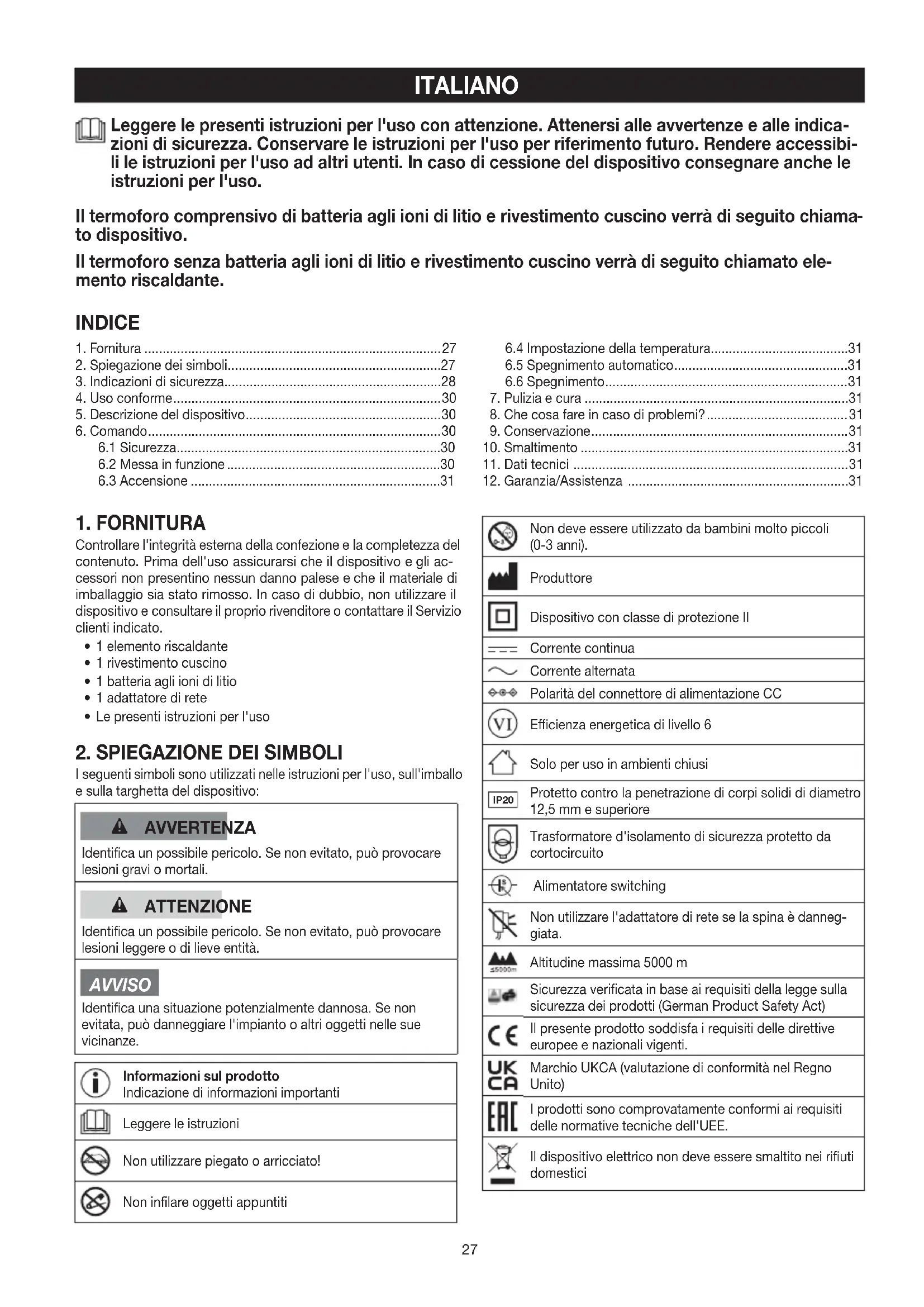 Iseguenti simboli sono utilizzati nelle istruzioni per l'uso, sull'imballo esulla targhetta del dispositivo: AVVERTENZA Identifica un possibile pericolo. Se non evitato, può provocare lesioni gravi o mortali. ATTENZIONE Identifica un possibile pericolo. Se non evitato, può provocare lesioni leggere o di lieve entità. AVVISO Identifica una situazione potenzialmente dannosa. Se non evitata, può danneggiare l'impianto o altri oggetti nelle sue vicinanze. Informazioni sul prodotto Indicazione di informazioni importanti Leggere le istruzioni Non utilizzare piegato oarricciato! Non infilare oggetti appuntiti Non deve essere utilizzato da bambini molto piccoli (0-3anni). Produttore Dispositivo con classe di protezione II Corrente continua Corrente alternata Polarità del connettore di alimentazione CC Ecienza energetica di livello 6 Solo per uso in ambienti chiusi IP20 Protetto contro la penetrazione di corpi solidi di diametro 12,5 mm e superiore Trasformatore d'isolamento di sicurezza protetto da cortocircuito Alimentatore switching Non utilizzare l'adattatore di rete se la spina è danneg- giata. Altitudine massima 5000 m Sicurezza verificata in base ai requisiti della legge sulla sicurezza dei prodotti (German Product Safety Act) Il presente prodotto soddisfa irequisiti delle direttive europee enazionali vigenti. Marchio UKCA (valutazione di conformità nel Regno Unito) Iprodotti sono comprovatamente conformi ai requisiti delle normative tecniche dell'UEE. Il dispositivo elettrico non deve essere smaltito nei rifiuti domestici INDICE Leggere le presenti istruzioni per l'uso con attenzione. Attenersi alle avvertenze e alle indica- zioni di sicurezza. Conservare le istruzioni per l'uso per riferimento futuro. Rendere accessibi- li le istruzioni per l'uso ad altri utenti. In caso di cessione del dispositivo consegnare anche le istruzioni per l'uso. Il termoforo comprensivo di batteria agli ioni di litio e rivestimento cuscino verrà di seguito chiama