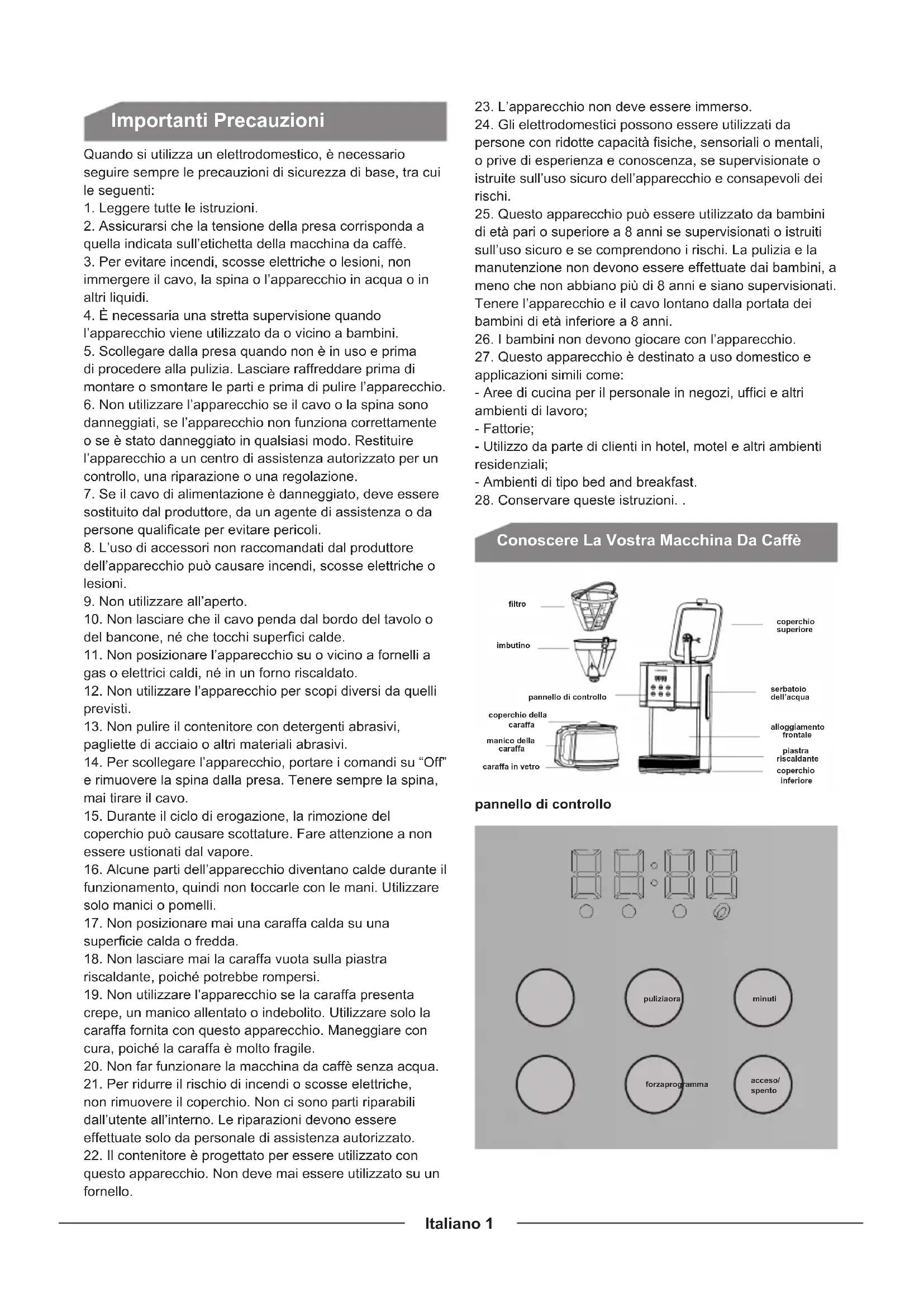 si vous utilisez des cafés fortement torréés.Italiano 1 Importanti Precauzioni Quando si utilizza un elettrodomestico, è necessario seguire sempre le precauzioni di sicurezza di base, tra cui le seguenti: