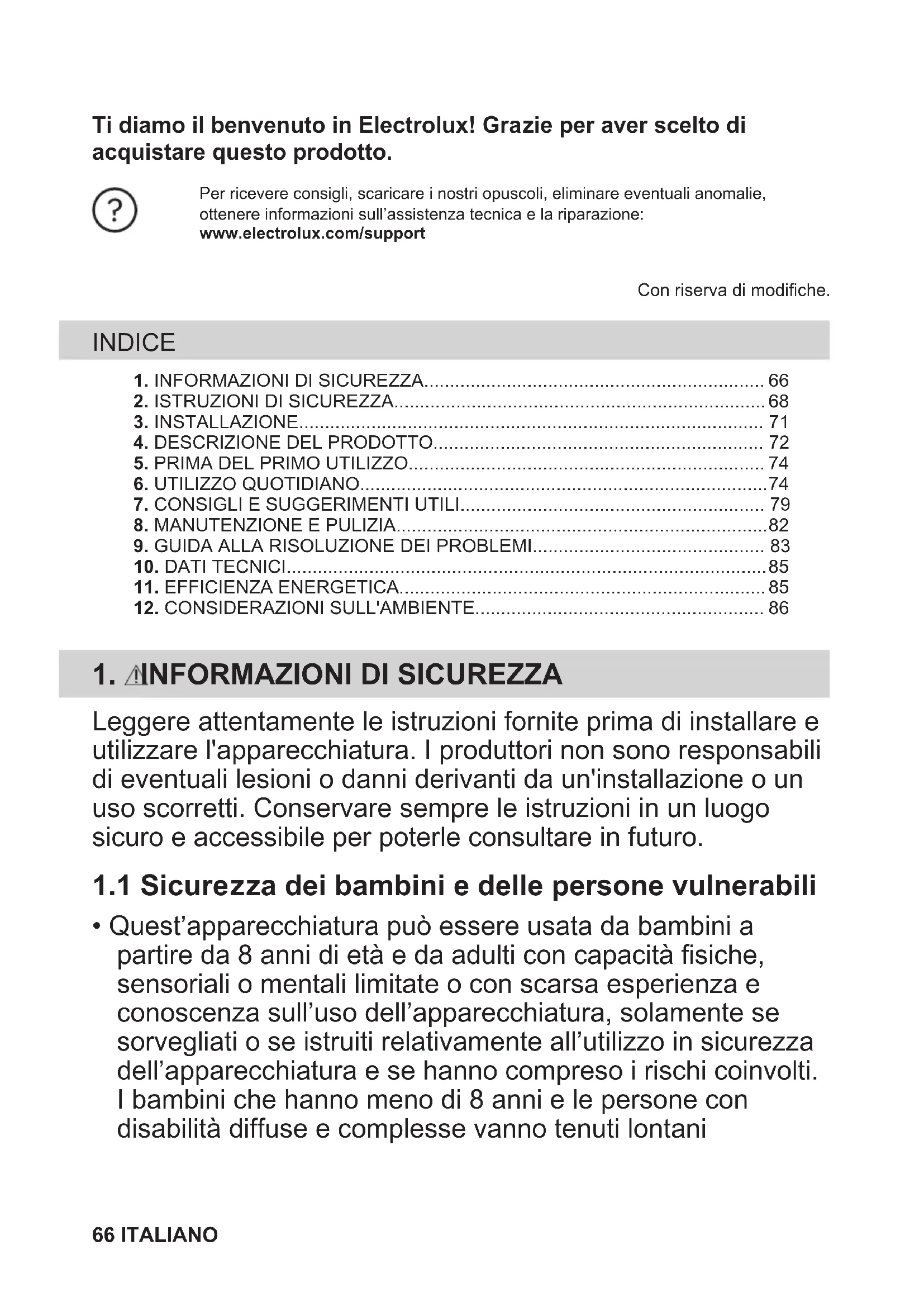 - Quest’apparecchiatura può essere usata da bambini a partire da 8 anni di età e da adulti con capacità fisiche, sensoriali o mentali limitate o con scarsa esperienza e conoscenza sull’uso dell’apparecchiatura, solamente se sorvegliati o se istruiti relativamente all’utilizzo in sicurezza dell’apparecchiatura e se hanno compreso i rischi coinvolti. I bambini che hanno meno di 8 anni e le persone con disabilità diffuse e complesse vanno tenuti lontani 66 ITALIANOdall’elettrodomestico, a meno che non vi sia una supervisione continua.