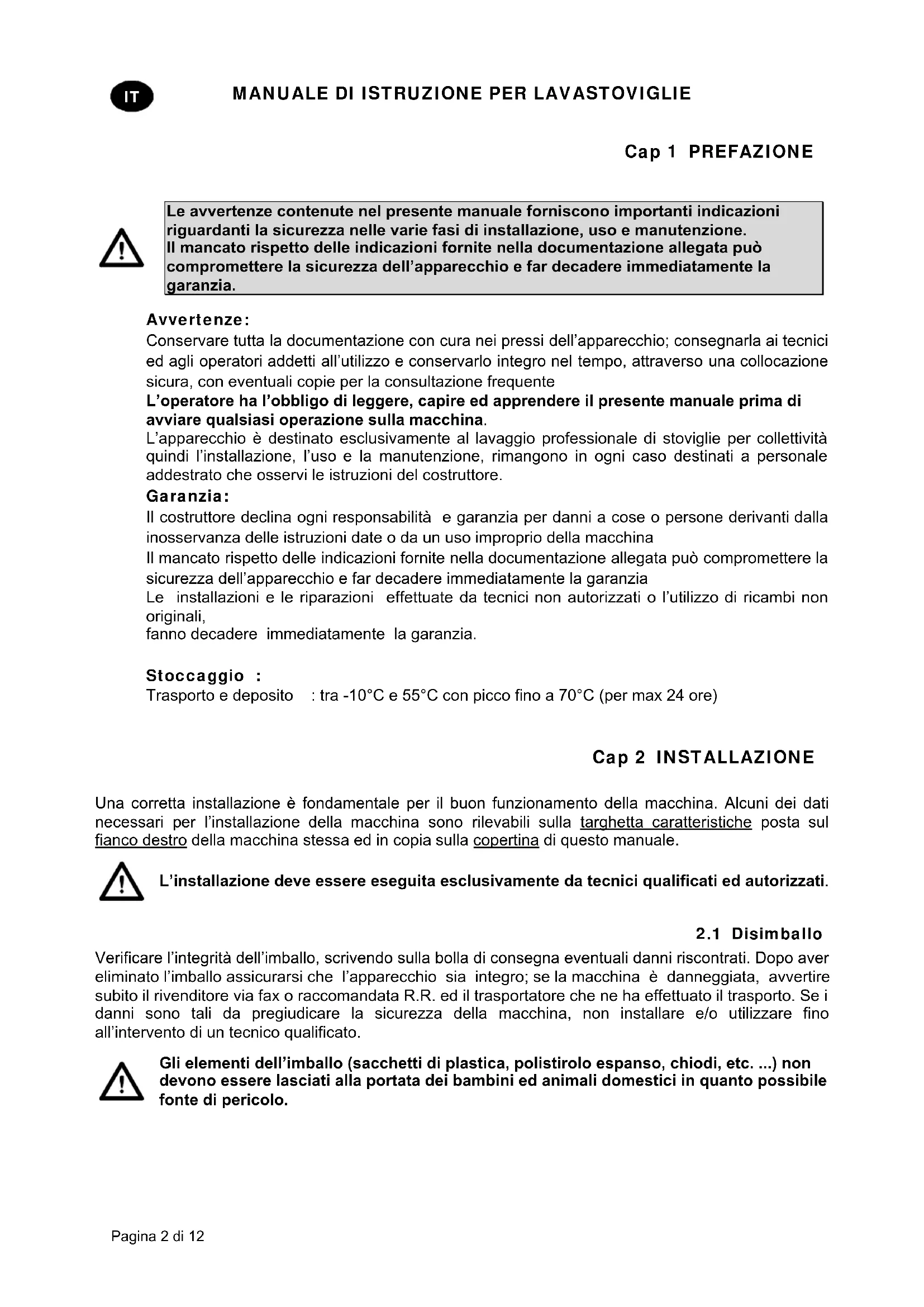 Le avvertenze contenute nel presente manuale forniscono importanti indicazioni riguardanti la sicurezza nelle varie fasi di installazione, uso e manutenzione. Il mancato rispetto delle indicazioni fornite nella documentazione allegata può compromettere la sicurezza dell’apparecchio e far decadere immediatamente la garanzia. Avvertenze: Conservare tutta la documentazione con cura nei pressi dell’apparecchio; consegnarla ai tecnici ed agli operatori addetti all’utilizzo e conservarlo integro nel tempo, attraverso una collocazione sicura, con eventuali copie per la consultazione frequente L’operatore ha l’obbligo di leggere, capire ed apprendere il presente manuale prima di avviare qualsiasi operazione sulla macchina. L’apparecchio è destinato esclusivamente al lavaggio professionale di stoviglie per collettività quindi l’installazione, l’uso e la manutenzione, rimangono in ogni caso destinati a personale addestrato che osservi le istruzioni del costruttore. Garanzia: Il costruttore declina ogni responsabilità e garanzia per danni a cose o persone derivanti dalla inosservanza delle istruzioni date o da un uso improprio della macchina Il mancato rispetto delle indicazioni fornite nella documentazione allegata può compromettere la sicurezza dell’apparecchio e far decadere immediatamente la garanzia Le installazioni e le riparazioni effettuate da tecnici non autorizzati o l’utilizzo di ricambi non originali, fanno decadere immediatamente la garanzia. Stoccaggio : Trasporto e deposito : tra -10°C e 55°C con picco fino a 70°C (per max 24 ore) Cap 2 INSTALLAZIONE