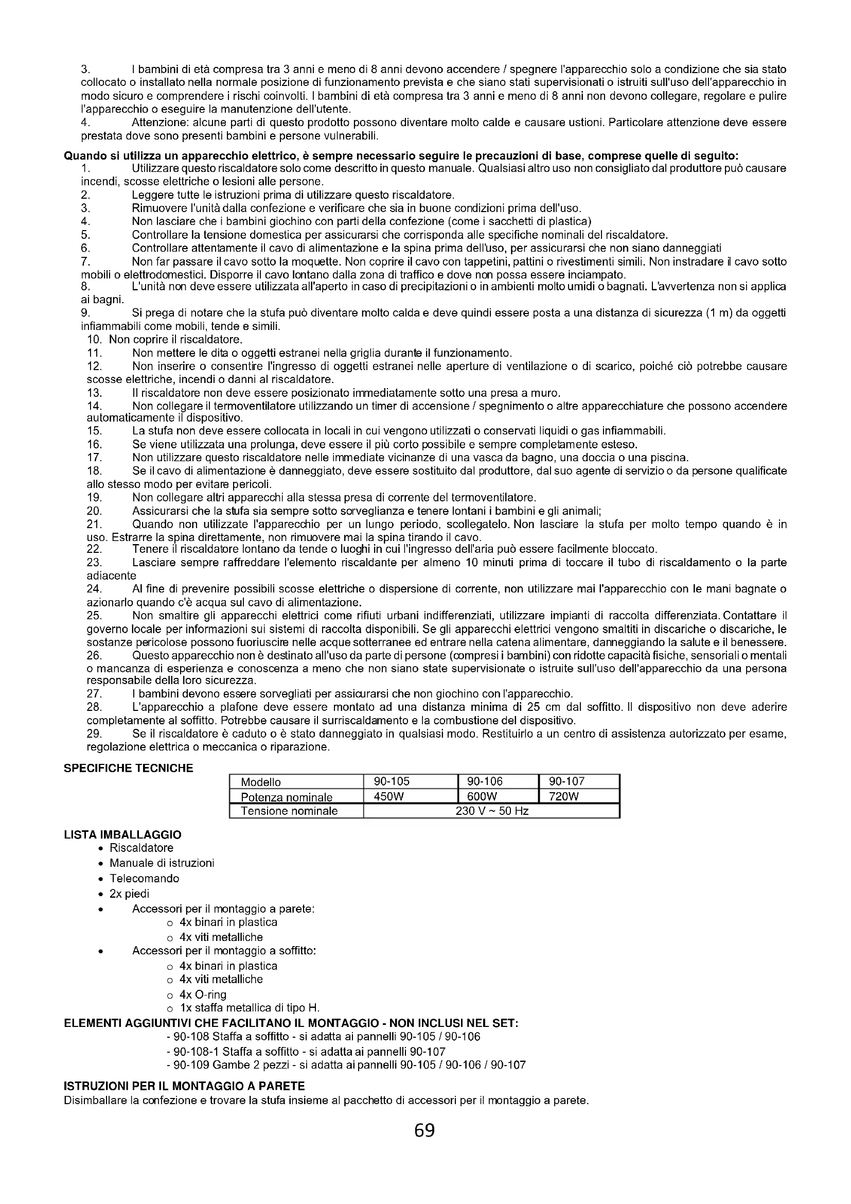 28. L'apparecchio a plafone deve essere montato ad una distanza minima di 25 cm dal soffitto. Il dispositivo non deve aderire completamente al soffitto. Potrebbe causare il surriscaldamento e la combustione del dispositivo. 29. Se il riscaldatore è caduto o è stato danneggiato in qualsiasi modo. Restituirlo a un centro di assistenza autorizzato per esame, regolazione elettrica o meccanica o riparazione. SPECIFICHE TECNICHE Modello 90-105 90-106 90-107 Potenza nominale 450W 600W 720W Tensione nominale 230 V ~ 50 Hz LISTA IMBALLAGGIO