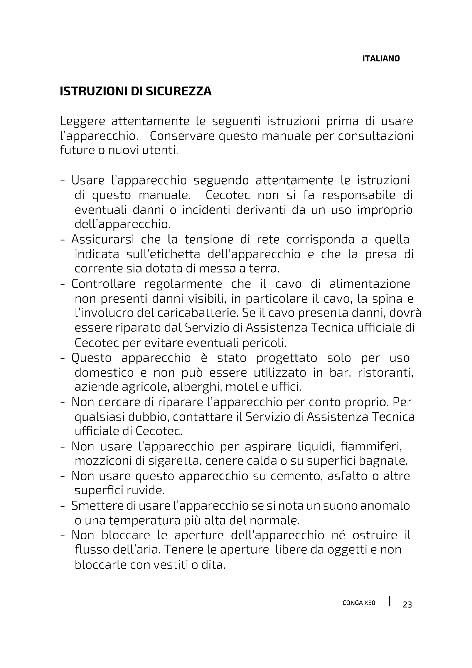Leggere attentamente le seguenti istruzioni prima di usare l’apparecchio. Conservare questo manuale per consultazioni future o nuovi utenti. - Usare l’apparecchio seguendo attentamente le istruzioni di questo manuale. Cecotec non si fa responsabile di eventuali danni o incidenti derivanti da un uso improprio dell’apparecchio. - Assicurarsi che la tensione di rete corrisponda a quella indicata sull’etichetta dell’apparecchio e che la presa di corrente sia dotata di messa a terra. - Controllare regolarmente che il cavo di alimentazione non presenti danni visibili, in particolare il cavo, la spina e l’involucro del caricabatterie. Se il cavo presenta danni, dovrà essere riparato dal Servizio di Assistenza Tecnica uciale di Cecotec per evitare eventuali pericoli. - Questo apparecchio è stato progettato solo per uso domestico e non può essere utilizzato in bar, ristoranti, aziende agricole, alberghi, motel e uci. - Non cercare di riparare l’apparecchio per conto proprio. Per qualsiasi dubbio, contattare il Servizio di Assistenza Tecnica uciale di Cecotec. - Non usare l’apparecchio per aspirare liquidi, ammiferi, mozziconi di sigaretta, cenere calda o su superci bagnate. - Non usare questo apparecchio su cemento, asfalto o altre superci ruvide. - Smettere di usare l’apparecchio se si nota un suono anomalo o una temperatura più alta del normale. - Non bloccare le aperture dell’apparecchio né ostruire il usso dell’aria. Tenere le aperture libere da oggetti e non bloccarle con vestiti o dita.24 CONGA X50 ITALIANO - Spegnere e scollegare l’apparecchio dall’alimentazione quando non viene utilizzato per un certo periodo di tempo, prima di pulirlo, prima di montare o smontare i componenti e prima di rimuovere la batteria. Togliere la spina per scollegare l’apparecchio, non tirare il cavo. - ATTENZIONE: l’apparecchio si compone di parti rotanti che possono impigliarsi. Usare la massima cautela. - Non sommergere il cavo, la spina o qualsiasi altra parte dell’apparecchio in acqua o all’interno di qualsiasi altro liquido, né esporre i componenti elettrici all’acqua. Vericare di avere le mani completamente asciutte prima di toccare la presa o accendere l’apparecchio. - Questo apparecchio può essere usato da bambini a partire da 8 anni e da persone con ridotte capacità siche, sensoriali o mentali o con mancanza di esperienza e conoscenza, a condizione che siano supervisionati o istruiti sull’uso dell’apparecchio in modo sicuro e che comprendano i pericoli che questo presenta. I bambini non devono giocare con l’apparecchio. La pulizia e la manutenzione non devono essere eettuate da bambini senza supervisione. - Non toccare la spina né la presa di corrente con le mani bagnate. - Non esporre l’apparecchio alla luce diretta del sole, fuoco, acqua o umidità. - Non sedersi o appoggiare oggetti appuntiti o pesanti sull’apparecchio. - Prima di mettere in funzione il robot aspirapolvere, preparare la stanza e fare attenzione a rimuovere oggetti e cavi che possano inuire sul suo funzionamento. - Mantenere l’apparecchio lontano da indumenti, tende e materiali simili. - Collocare l’apparecchio su di una supercie piana e stabile.25 CONGA X50 ITALIANO Evitare di collocarlo su superci instabili da cui potrebbe cadere (ad esempio su tavoli o sedie). - Prima di metterlo in funzione, vericare che tutte le connessioni, sia quelle del robot aspirapolvere che quelle della base di ricarica, siano in buono stato. - Evitare di mettere il robot aspirapolvere in funzione a temperature estremamente alte o basse. - L’apparecchio deve essere utilizzato solo con la batteria e la base di ricarica fornite o con una unità di ricarica compatibile approvata da Cecotec. - Prima di procedere alla pulizia o alla manutenzione, accertarsi che l’apparecchio non sia collegato a una presa di corrente. - Prima della pulizia, accertarsi che la base di ricarica non sia collegata a una presa di corrente. Istruzioni relative alla batteria - L’apparecchio viene fornito con una batteria agli ioni di litio; non bruciarla né esporla ad alte temperature, poiché potrebbe esplodere. - Le batterie possono presentare fughe in condizioni estreme. Se la batteria perde, non toccare il liquido. Se il liquido entra in contatto con la pelle, lavare immediatamente con acqua e sapone. Se il liquido entra in contatto con gli occhi, sciacquare immediatamente gli occhi con abbondante acqua pulita per almeno 10 minuti e consultare un medico. Indossare i guanti quando si maneggia la batteria e smaltirla immediatamente in conformità con le normative locali. - Evitare il contatto tra le batterie e piccoli oggetti metallici come graette, monete, chiavi, chiodi o viti. - Non alterare la batteria in alcun modo. - Le batterie devono essere rimosse dall’apparecchio per uno26 CONGA X50 ITALIANO smaltimento sicuro. - Tenere le batterie che rischiano di essere ingerite fuori dalla portata dei bambini. - L’ingestione di batterie può causare ustioni, perforazione dei tessuti molli e morte. Le pile possono causare gravi ustioni entro due ore dall’ingestione. - In caso di ingestione delle batterie, rivolgersi immediatamente a un medico. - ATTENZIONE: per ricaricare la batteria, utilizzare esclusivamente la stazione di ricarica fornita con l’apparecchio. - Le batterie non ricaricabili non devono essere ricaricate. - I terminali di alimentazione delle batterie non devono essere cortocircuitati. - Se l’apparecchio deve essere conservato per un lungo periodo di tempo, è consigliabile rimuovere la batteria. - Questo apparecchio contiene batterie che possono essere sostituite solo da personale qualicato. - Le batterie devono essere inserite nella posizione corretta. Fare attenzione alle polarità quando si sostituiscono le pile.