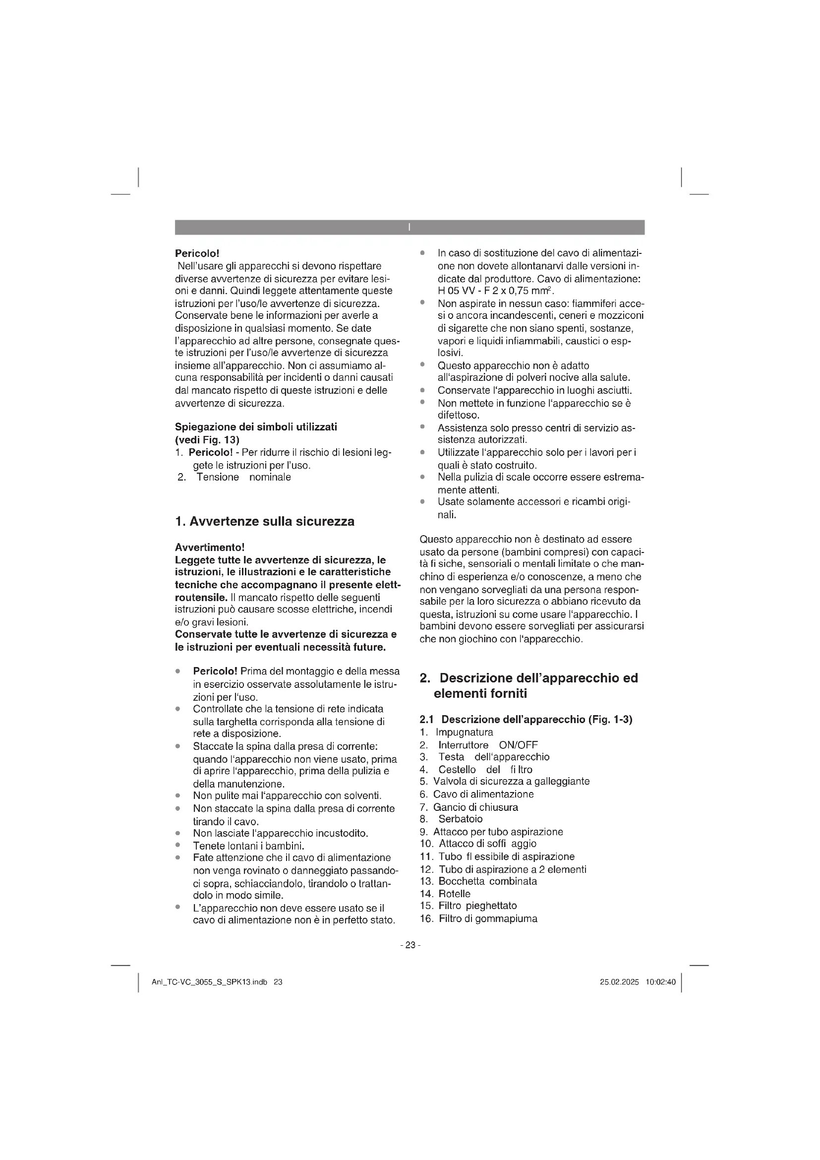 Istruzioni per l’uso originali L’apparecchio è dotato di una catena (z) sul fondo del serbatoio. Serve a ridurre lo sviluppo di cari- che elettrostatiche durante l‘utilizzo.