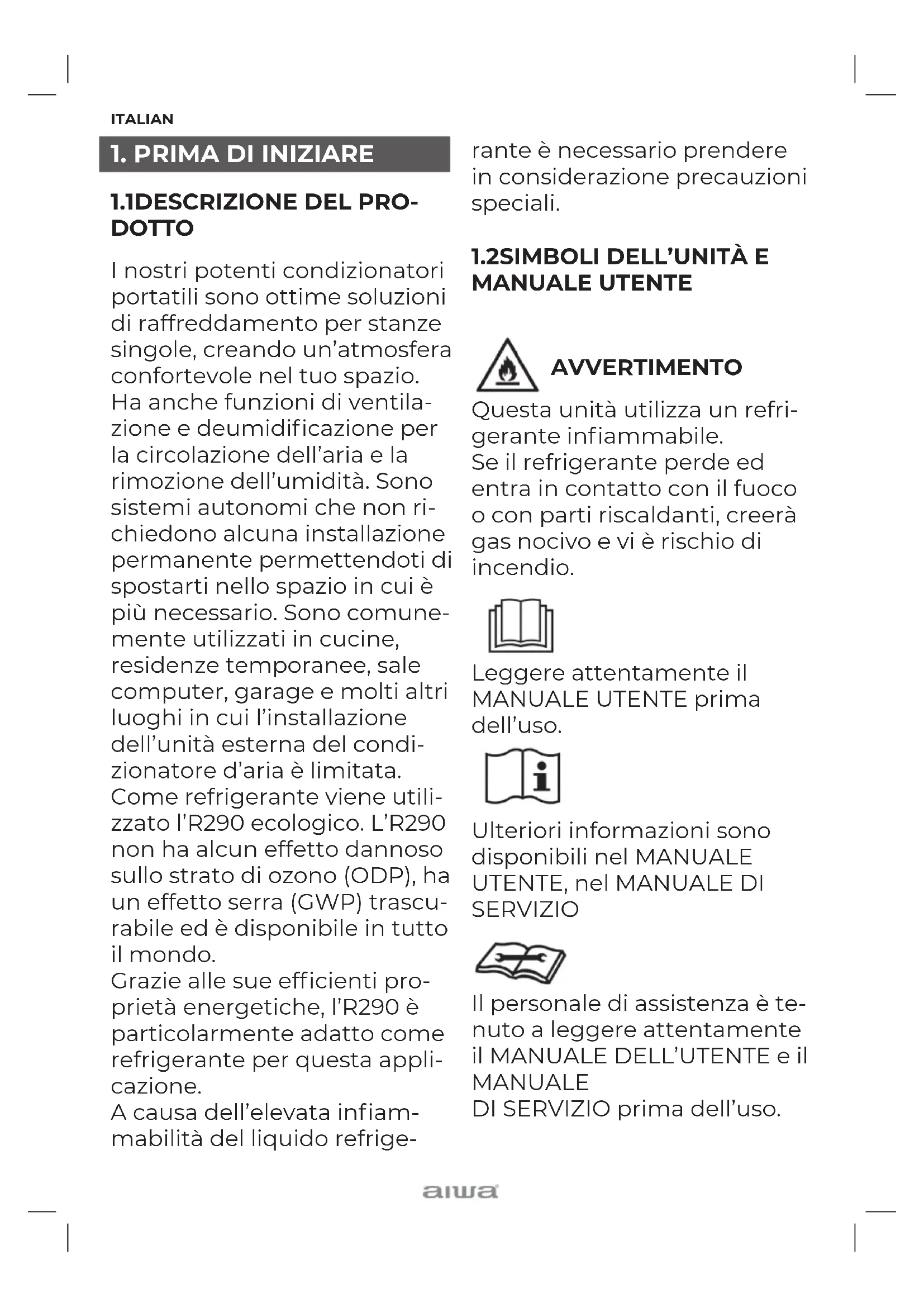 TIVE ATTENZIONE- per ridurre il rischio di incendio, scossa elettrica o lesioni a persone o cose: ■Si prega di lasciare il condi- zionatore portatile in posi- zione verticale per almeno 24 ore prima di collegarlo. ■Se il cavo di alimentazione è danneggiato, deve essere sostituito dal produttore, dal suo agente di assistenza o da persone similmente qua- licate per evitare pericoli. ■L’apparecchio deve essere scollegato dalla fonte di alimentazione durante il servizio. ■Utilizzare sempre l’unità da una fonte di alimentazione con tensione, frequenza e potenza uguali a quelle indicate sulla targhetta identicativa del prodotto. ■Utilizzare sempre una presa di corrente dotata di messa a terra. ■Scollegare il cavo di alimen- tazione durante la pulizia o quando non in uso. ■Non operare con le mani bagnate. Evitare che l’acqua si rovesci sull’unità. ■Non immergere o esporre l’unità alla pioggia, all’umi- dità o a qualsiasi altro liquido. ■Non lasciare l’unità in fun- zione incustodita. Non incli- nare o capovolgere l’ unità. ■Non scollegare mentre l’unità è in funzione. ■Non scollegare tirando il cavo di alimentazione. ■Non utilizzare una prolunga o un adattatore. ■Non posizionare oggetti sull’unità. ■Non salire o sedersi su- ll’unità.ITALIAN ■Non inserire le dita o altri oggetti nell’uscita dell’aria. ■Non toccare la presa d’aria o le alette di alluminio de- ll’unità. ■Non utilizzare l’unità se è caduta, è danneggiata o mostra segni di malfunzio- namento del prodotto. ■Non pulire l’apparecchio con prodotti chimici. ■Assicurarsi che l’unità sia lontana da fuoco, oggetti inammabili o esplosivi. ■L’unità deve essere installata in conformità con le norma- tive nazionali sul cablaggio. ■Non utilizzare mezzi per accelerare il processo di sbrinamento o per pulire, diversi da quelli consigliati dal produttore. ■L’apparecchio deve essere conservato in una stanza senza fonti operative con- tinue (ad esempio: amme libere, un apparecchio a gas funzionante o una stufa elettrica funzionante). ■L’apparecchio deve essere conservato in modo da evi- tare che si verichino danni meccanici. ■Non spezzare né bruciare, neanche dopo l’uso. ■Tenere presente che i re- frigeranti potrebbero non contenere odori. ■Le tubazioni devono essere protette da danni sici e non devono essere installate in uno spazio non ventilato, se tale spazio è inferiore a 9 m². ■È necessario rispettare la normativa nazionale sul gas. ■Mantenere le aperture di ventilazione necessarie libere da ostruzioni. ■L’apparecchio deve essere conservato in un’area ben ventilata in cui la dimen- sione della stanza corris- ponde all’area specicata per il funzionamento. AVVERTIMENTO Qualsiasi persona coinvolta nei lavori o nell’apertura di un circuito refrigerante deve essere in possesso di un cer- ticato valido e aggiornato rilasciato da un’autorità di valutazione accreditata dal settore, che autorizza la sua competenza a maneggiare i refrigeranti in modo sicuro in conformità con una specica di valutazione riconosciuta dal settore. AVVERTIMENTO La manutenzione deve essere eseguita solo come raccomandato dal produttore dell’apparecchiatura. La ma- nutenzione e la riparazioneITALIAN che richiedono l’assistenza di altro personale qualicato devono essere eseguite sotto la supervisione della persona competente nell’uso di refri- geranti inammabili. Se non capisci qualcosa o hai bisogno di aiuto, contatta i servizi del rivenditore.