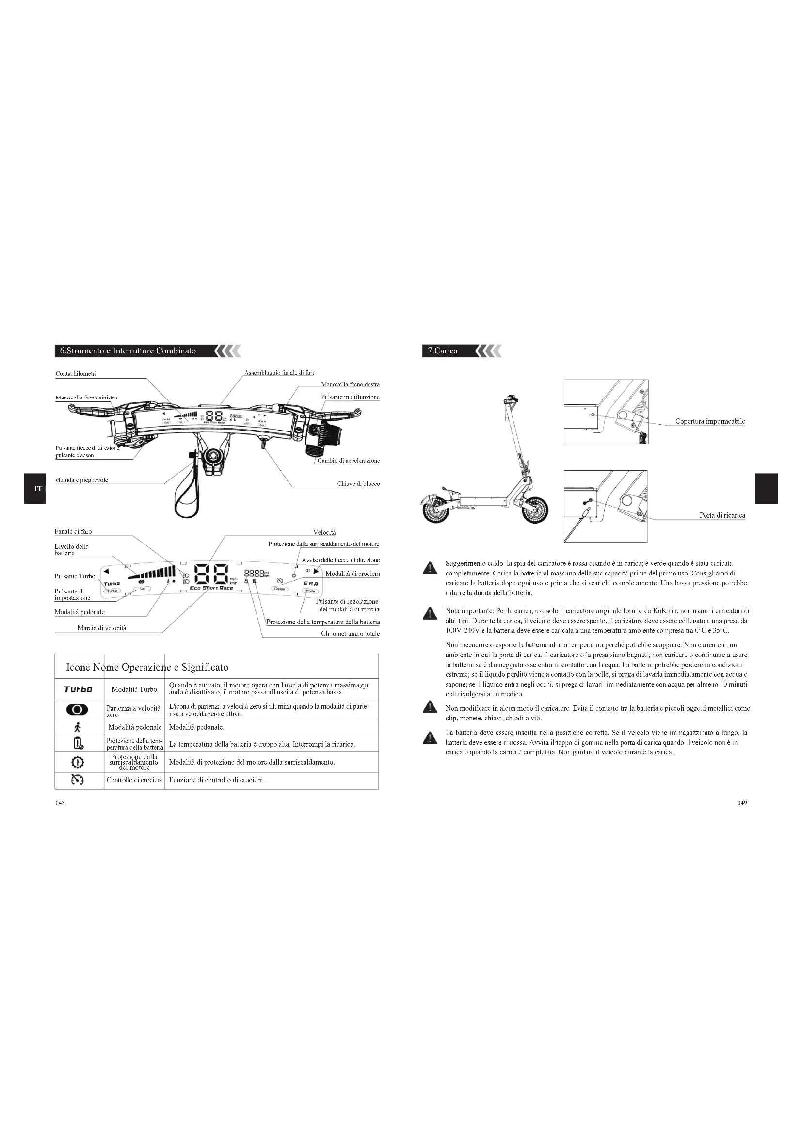 IT IT Suggerimento caldo: la spia del caricatore è rossa quando è in carica; è verde quando è stata caricata completamente. Carica la batteria al massimo della sua capacità prima del primo uso. Consigliamo di caricare la batteria dopo ogni uso e prima che si scarichi completamente. Una bassa pressione potrebbe ridurre la durata della batteria. 7.Carica Nota importante: Per la carica, usa solo il caricatore originale fornito da KuKirin, non usare i caricatori di altri tipi. Durante la carica, il veicolo deve essere spento, il caricatore deve essere collegato a una presa da 100V-240V e la batteria deve essere caricata a una temperatura ambiente compresa tra 0°C e 35°C. Non incenerire o esporre la batteria ad alta temperatura perché potrebbe scoppiare. Non caricare in un ambiente in cui la porta di carica, il caricatore o la presa siano bagnati; non caricare o continuare a usare la batteria se è danneggiata o se entra in contatto con l'acqua. La batteria potrebbe perdere in condizioni estreme; se il liquido perdito viene a contatto con la pelle, si prega di lavarla immediatamente con acqua e sapone; se il liquido entra negli occhi, si prega di lavarli immediatamente con acqua per almeno 10 minuti e di rivolgersi a un medico. Non modificare in alcun modo il caricatore. Evita il contatto tra la batteria e piccoli oggetti metallici come clip, monete, chiavi, chiodi o viti. La batteria deve essere inserita nella posizione corretta. Se il veicolo viene immagazzinato a lungo, la batteria deve essere rimossa. Avvita il tappo di gomma nella porta di carica quando il veicolo non è in carica o quando la carica è completata. Non guidare il veicolo durante la carica. 6.Strumento e Interruttore Combinato Fanale di faroVelocitàAvviso delle frecce di direzioneProtezione dalla surriscaldamento del motoreModalità di crocieraPulsante di impostazioneModalità pedonalePulsante TurboPulsante di regolazione del modalità di marcia Marcia di velocitàLivello della batteriaChilometraggio totaleContachilometriManovella freno destraPulsante frecce di direzione, pulsante clacsonGuindale pieghevoleManovella freno sinistraAssemblaggio fanale di faroCambio di accelerazioneChiave di bloccoPulsante multifunzioneProtezione della temperatura della batteria Modalità Turbo Controllo di crociera Partenza a velocità zero Modalità pedonale Protezione dalla surriscaldamento del motore Quando è attivato, il motore opera con l'uscita di potenza massima,qu- ando è disattivato, il motore passa all'uscita di potenza bassa. L'icona di partenza a velocità zero si illumina quando la modalità di parte- nza a velocità zero è attiva. Modalità pedonale. Modalità di protezione del motore dalla surriscaldamento. Funzione di controllo di crociera. Icone Nome Operazione e Significato La temperatura della batteria è troppo alta. Interrompi la ricarica. Protezione della tem-peratura della batteria Porta di ricarica Copertura impermeabile001 002 003 004 005 006 007