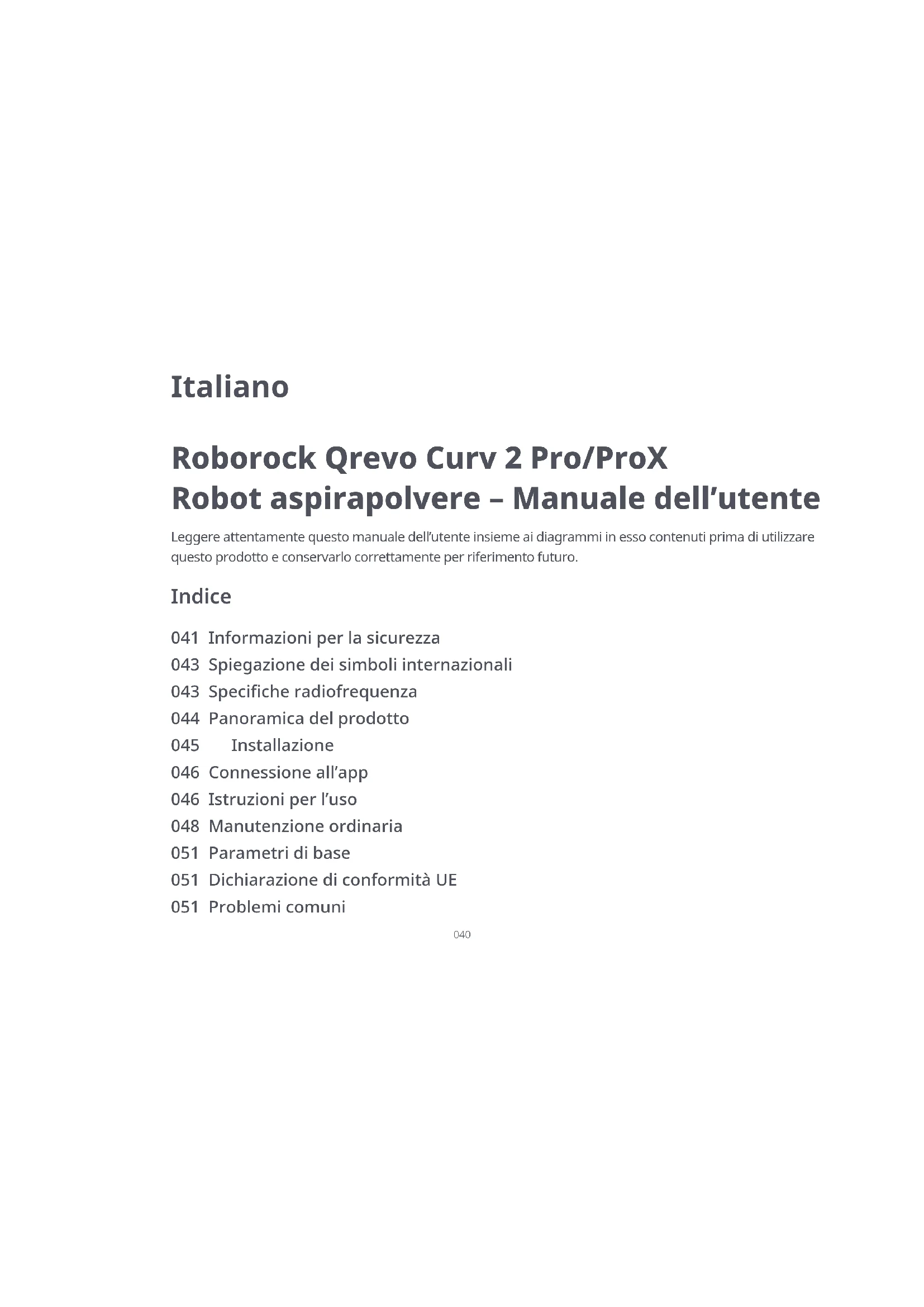 Pulire in base alle necessità. accertarsi che il sacchetto per la polvere monouso sia adeguatamente installato, per evitare che i rifiuti fuoriescano e danneggino la stazione di ricarica. Nota: D8-6: Sensori di caduta D8-7: Sensore tappeto051 Parametri di base Modello RRE0VSP Batteria Batteria agli ioni di litio 14,4 V/6400 mAh (TYP) Ingresso nominale 20 VCC 1,5 A Robot il numero di serie si trova su un adesivo sul fondo del robot. Nota: Stazione di ricarica con svuotamento, lavaggio e riempimento Modello EWFD49HRR Tensione di ingresso nominale 220-240 VCA Frequenza nominale 50-60 Hz Ingresso nominale (raccolta polvere) 3 A Ingresso nominale (Lavaggio del panno con acqua calda) 5,7 A Ingresso nominale (ricarica e asciugatura) 0,6 A Uscita nominale 20 VCC 1,5 A Dichiarazione di conformità UE Con la presente, Beijing Roborock Technology Co., Ltd. dichiara che l’apparecchiatura radio tipo RRE0VSP è conforme alla direttiva 2014/53/UE. Il testo completo della dichiarazione di conformità UE è disponibile presso il seguente indirizzo Internet: https://global.roborock.com/ pages/compliance Visita i collegamenti seguenti per visualizzare le interfacce di rete esposte al prodotto, i servizi esposti tramite le interfacce di rete e le informazioni sui sensori esterni. https://global.roborock.com/pages/ compliance Problemi comuni Scansionare il codice QR sottostante per visualizzare i problemi comuni.052 Roborock Qrevo Curv 2 Pro/ProX Español Lea atentamente este manual del usuario con diagramas antes de utilizar el robot aspirador y consérvelo para futuras consultas. Índice Manual del usuario del robot aspirador 053 Información de seguridad 055 Descripción de símbolos internacionales 055 Especificaciones de radiofrecuencia 056 Descripción general del producto 057 Instalación 058 Conexión a la aplicación 058 Instrucciones de uso 060 Mantenimiento rutinario 063 Parámetros básicos 063 Declaración de conformidad de la Unión Europea 063 Problemas comunes053 Restricciones Información de seguridad ADVERTENCIAS