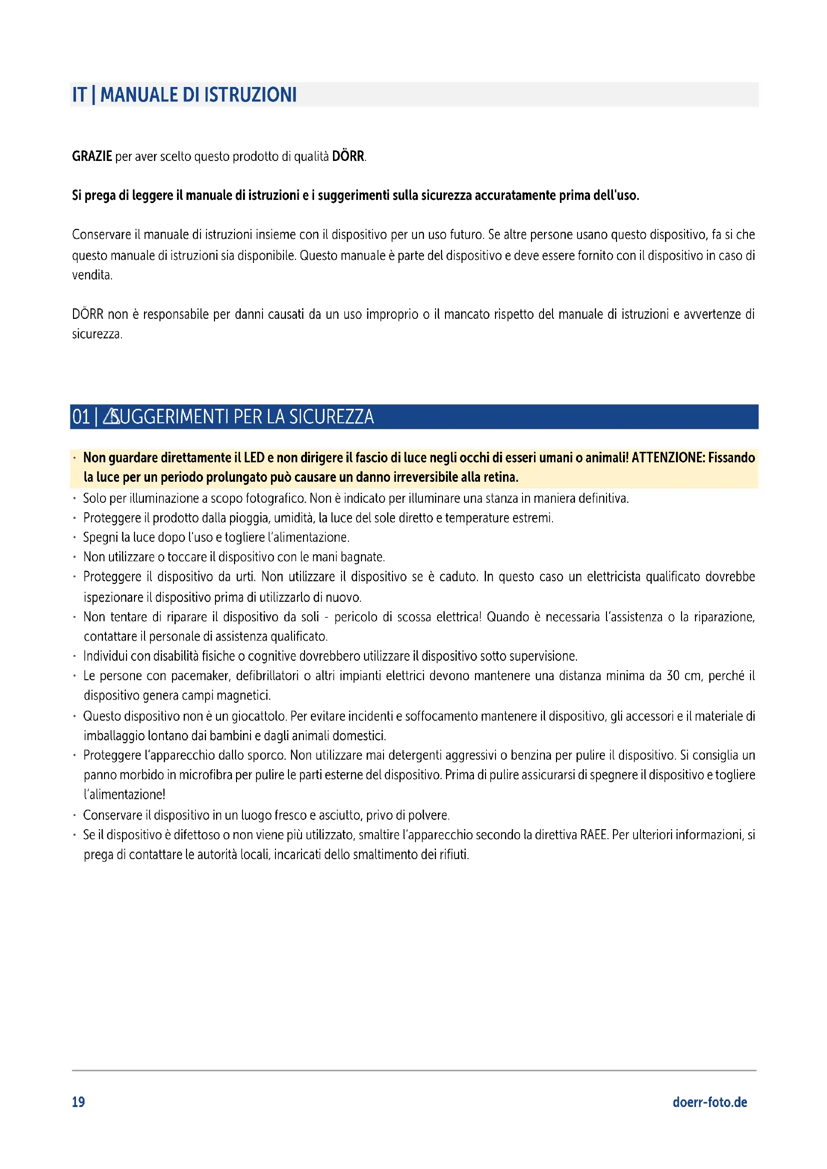 GRAZIE per aver scelto questo prodotto di qualità DÖRR. Si prega di leggere il manuale di istruzioni e i suggerimenti sulla sicurezza accuratamente prima dell'uso. Conservare il manuale di istruzioni insieme con il dispositivo per un uso futuro. Se altre persone usano questo dispositivo, fa si che questo manuale di istruzioni sia disponibile. Questo manuale è parte del dispositivo e deve essere fornito con il dispositivo in caso di vendita. DÖRR non è responsabile per danni causati da un uso improprio o il mancato rispetto del manuale di istruzioni e avvertenze di sicurezza.