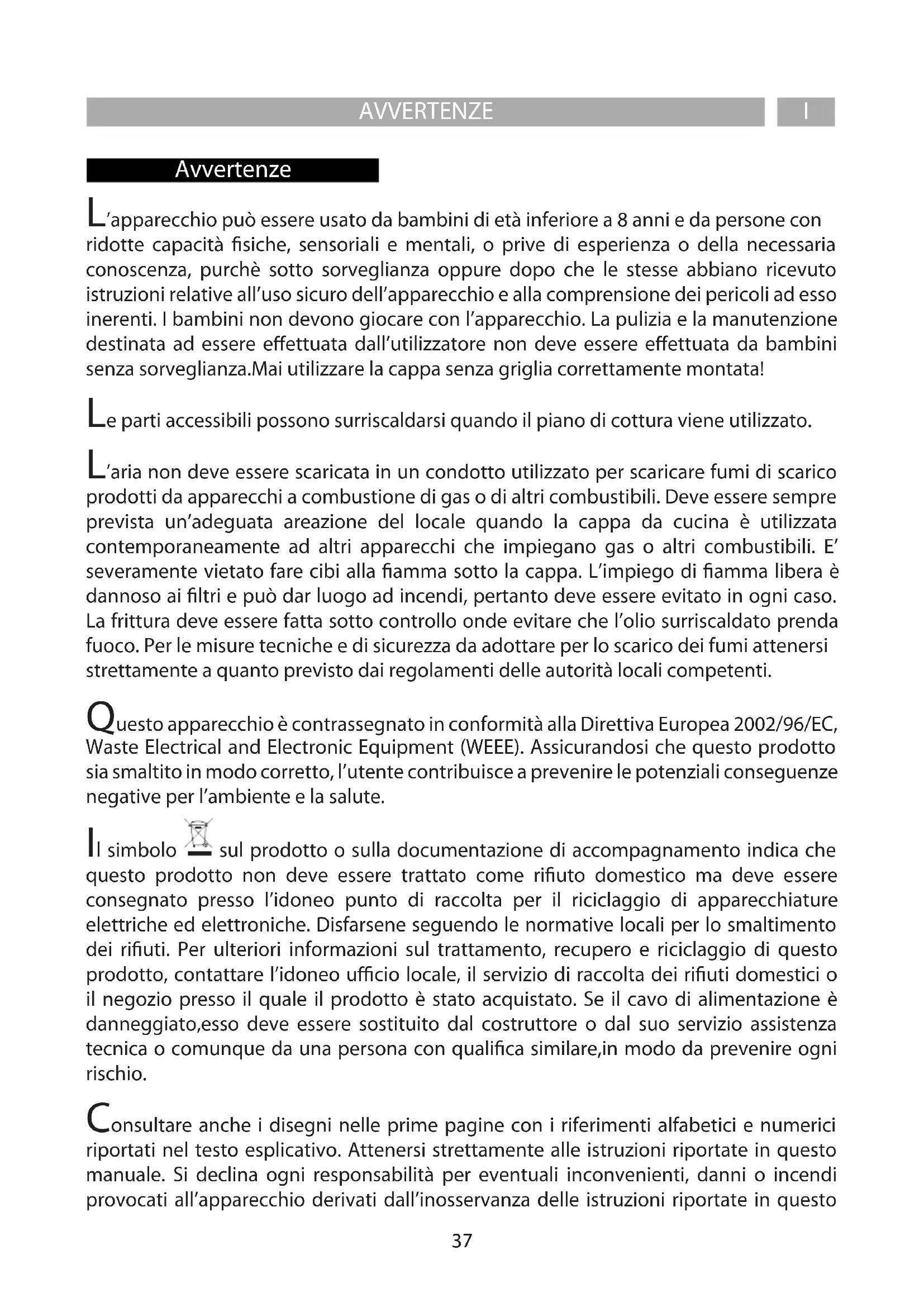 Avvertenze L’apparecchio può essere usato da bambini di età inferiore a 8 anni e da persone con ridotte capacità siche, sensoriali e mentali, o prive di esperienza o della necessaria conoscenza, purchè sotto sorveglianza oppure dopo che le stesse abbiano ricevuto istruzioni relative all’uso sicuro dell’apparecchio e alla comprensione dei pericoli ad esso inerenti. I bambini non devono giocare con l’apparecchio. La pulizia e la manutenzione destinata ad essere eettuata dall’utilizzatore non deve essere eettuata da bambini senza sorveglianza.Mai utilizzare la cappa senza griglia correttamente montata! Le parti accessibili possono surriscaldarsi quando il piano di cottura viene utilizzato. L’aria non deve essere scaricata in un condotto utilizzato per scaricare fumi di scarico prodotti da apparecchi a combustione di gas o di altri combustibili. Deve essere sempre prevista un’adeguata areazione del locale quando la cappa da cucina è utilizzata contemporaneamente ad altri apparecchi che impiegano gas o altri combustibili. E’ severamente vietato fare cibi alla amma sotto la cappa. L’impiego di amma libera è dannoso ai ltri e può dar luogo ad incendi, pertanto deve essere evitato in ogni caso. La frittura deve essere fatta sotto controllo onde evitare che l’olio surriscaldato prenda fuoco. Per le misure tecniche e di sicurezza da adottare per lo scarico dei fumi attenersi strettamente a quanto previsto dai regolamenti delle autorità locali competenti. Questo apparecchio è contrassegnato in conformità alla Direttiva Europea 2002/96/EC, Waste Electrical and Electronic Equipment (WEEE). Assicurandosi che questo prodotto sia smaltito in modo corretto, l’utente contribuisce a prevenire le potenziali conseguenze negative per l’ambiente e la salute. Il simbolo sul prodotto o sulla documentazione di accompagnamento indica che questo prodotto non deve essere trattato come riuto domestico ma deve essere consegnato presso l’idoneo punto di raccolta per il riciclaggio di apparecchiature elettriche ed elettroniche. Disfarsene seguendo le normative locali per lo smaltimento dei riuti. Per ulteriori informazioni sul trattamento, recupero e riciclaggio di questo prodotto, contattare l’idoneo ucio locale, il servizio di raccolta dei riuti domestici o il negozio presso il quale il prodotto è stato acquistato. Se il cavo di alimentazione è danneggiato,esso deve essere sostituito dal costruttore o dal suo servizio assistenza tecnica o comunque da una persona con qualica similare,in modo da prevenire ogni rischio. Consultare anche i disegni nelle prime pagine con i riferimenti alfabetici e numerici riportati nel testo esplicativo. Attenersi strettamente alle istruzioni riportate in questo manuale. Si declina ogni responsabilità per eventuali inconvenienti, danni o incendi provocati all’apparecchio derivati dall’inosservanza delle istruzioni riportate in questomanuale. Si raccomanda di non ssare la cappa su una parete che non possa sostenerne il peso ad esempio di carton gesso e di non incassarla all’interno di un mobile. La cappa deve avere una distanza minima dal piano cottura di 50 cm in caso di cucine elettriche e di 65 cm in caso di cucine a gas o miste. Se le istruzioni di installazione del dispositivo di cottura a gas specicano una distanza maggiore, bisogna tenerne conto. La cappa è fornita di una uscita d‘aria superiore B per lo scarico dei fumi verso l’esterno (Versione aspirante A- tubo di scarico non fornito). Nel caso non sia possibile scaricare i fumi e vapori della cottura verso l‘esterno, si può utilizzare la cappa in versione ltrante F montando 1 ltro ai carboni attivi F, i fumi e vapori vengono riciclati attraverso la sgrigliatura superiore G. Assicurarsi che nelle vicinanze della cappa ci sia un punto di accesso alla rete di alimentazione elettrica e che l’impianto si provvisto di un dierenziale da 30 mA La tensione di rete deve corrispondere alla tensione riportata sull’etichetta caratteristiche situate all’interno della cappa.La cappa è dotata di cavo elettrico lungo 1250 mm con spina o senza : se provvisto di spina allacciare la cappa ad una presa conforme alle norme vigenti posta in zona accessibile, se sprovvisto (collegamento diretto alla rete) applicare un interruttore bipolare a norme con una distanza dei contatti in apertura non inferiore a 3mm (accessibile),questa installazione e il collegamento elettrico devono essere fatte a Norma da un tecnico specializzato. Si raccomanda di accendere sempre la cappa almeno alla prima velocità quando è in funzione il piano cottura. Test sulle performance del prodotto eseguiti in conformità al regolamento (EU) No 65/2014 - Ref: IEC 61591 Il massimo delle performance si ottiene posizionando i pannelli mobili, se presenti, in posizione aperta. AVVERTENZE
