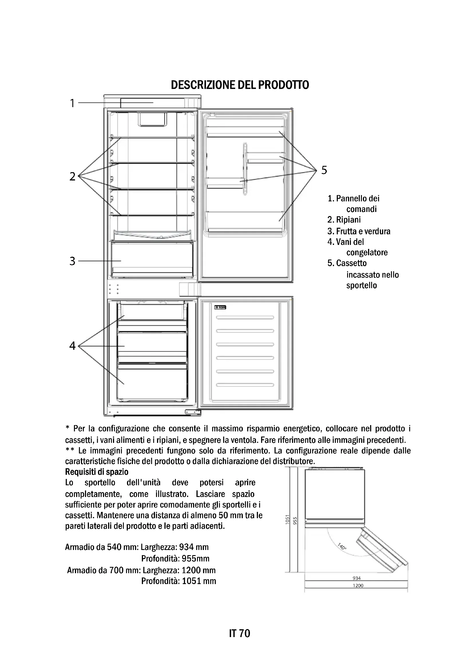 - Per la configurazione che consente il massimo risparmio energetico, collocare nel prodotto i cassetti, i vani alimenti e i ripiani, e spegnere la ventola. Fare riferimento alle immagini precedenti. ** Le immagini precedenti fungono solo da riferimento. La configurazione reale dipende dalle caratteristiche fisiche del prodotto o dalla dichiarazione del distributore. Requisiti di spazio Lo sportello dell'unità deve potersi aprire completamente, come illustrato. Lasciare spazio sufficiente per poter aprire comodamente gli sportelli e i cassetti. Mantenere una distanza di almeno 50 mm tra le pareti laterali del prodotto e le parti adiacenti. Armadio da 540 mm: Larghezza: 934 mm Profondità: 955mm Armadio da 700 mm: Larghezza: 1200 mm Profondità: 1051 mm