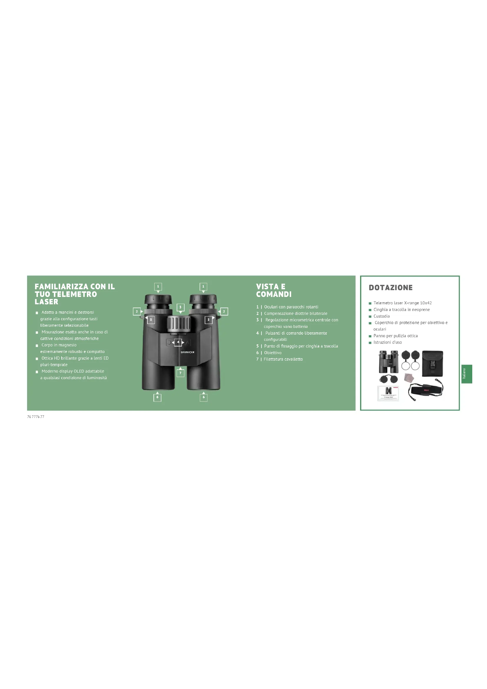 TUO TELEMETRO LASER Adatto a mancini e destrorsi grazie alla configurazione tasti liberamente selezionabile Misurazione esatta anche in caso di cattive condizioni atmosferiche Corpo in magnesio estremamente robusto e compatto Ottica HD brillante grazie a lenti ED pluri-temprate Moderno display OLED adattabile a qualsiasi condizione di luminosità VISTA E COMANDI 1 | Oculari con paraocchi rotanti 2 | Compensazione diottrie bilaterale 3 | Regolazione micrometrica centrale con coperchio vano batteria 4 | Pulsanti di comando liberamente configurabili 5 | Punto di fissaggio per cinghia a tracolla 6 | Obiettivo 7 | Filettatura cavalletto DOTAZIONE Telemetro laser X-range 10x42 Cinghia a tracolla in neoprene Custodia Coperchio di protezione per obiettivo e oculari Panno per pulizia ottica Istruzioni d’uso78 7978 79 Italiano SPIEGAZIONE DEI SIMBOLI E AVVERTENZE DI SICU- REZZA Le presenti istruzioni per l'uso appartengono al telemetro laser X-range MINOX 10x42 (di seguito detto solo “X-range” o “Bi- nocolo”). Sono parte del prodotto e contengono informazioni importanti su messa in funzione, uso e smaltimento. Leggi at- tentamente le istruzioni d'uso, in particolare le avvertenze di sicurezza, prima di utilizzare il binocolo. La mancata osservanza delle presenti istruzioni d’uso può provocare danni al binocolo. Le istruzioni d'uso si basano sulle norme e disposizioni vigenti nell'Unione Europea. All’estero, osserva anche le direttive e le norme specifiche del Paese. Conserva le istruzioni per l'uso per poterle utilizzare in un momento successivo. Se cedi il binocolo X-range a terzi, consegna anche le presenti istruzioni d'uso. Utilizza il binocolo solo come descritto nelle presenti istruzioni d’uso. Qualsiasi altro utilizzo è da considerarsi non conforme e può provocare danni materiali. Il produttore o rivenditore decli- na qualsiasi responsabilità per danni provocati da uso scorretto o non conforme e per modifiche non consentite. L'azienda produttrice si è impegnata da ogni punto di vista a re- digere le presenti istruzioni d'uso in modo quanto più completo e accurato possibile. Non si può però garantire l'assenza di eventuali errori od omissioni nel corso del processo tipografico. È possibile che gli accessori ricevuti si discostino leggermen- te da quelli descritti. Questo pacchetto può essere modificato senza preavviso. I simboli e le parole chiave seguenti vengono utilizzati nelle presenti istruzioni d'uso, sul dispositivo o sulla confezione. PERICOLO! Questo simbolo/parola chiave segnala un pericolo con un livello di rischio elevato che, se non evitato, provoca la mor- te o lesioni gravi. ATTENZIONE! Questa parola chiave segnala possibili danni materiali. Non guardare MAI con il binocolo direttamente nel sole o in fonti laser, perché ciò può provocare dan- ni irreparabili all'occhio. Tieni il tuo binocolo fuori dalla portata dei bambi- ni. Sussiste il rischio che possano ingerire pezzi piccoli o di strangolamento con la cinghia a tracol- la. Non toccare le superfici metalliche se il binocolo è fortemente riscaldato o rareddato. Dopo l'uso applica sempre i cappucci protettivi. In tal modo le lenti sono protette dai danni e il tuo binocolo non crea pericolo d'incendio dovuto alla concentrazione della luce solare. Avvertenze di sicurezza supplementari relative a laser e batterie Il prodotto utilizza un raggio laser invisibile. N.B. quanto segue: Non orientare mai il laser sugli occhi. Non orientare mai il laser sulle persone. Non guardare con dispositivi ottici nel laser. Togli le tue dita dal pulsante di misurazione quando non eettui nessuna misurazione. Questo evita un'attivazione accidentale del laser. NON smon- tare, modificare o riparare il binocolo. Il laser può essere pe- ricoloso per la tua salute. ATTENZIONE! Questo prodotto è stato testato ed è conforme agli standard seguenti: PRODOTTO LASER DI CLASSE