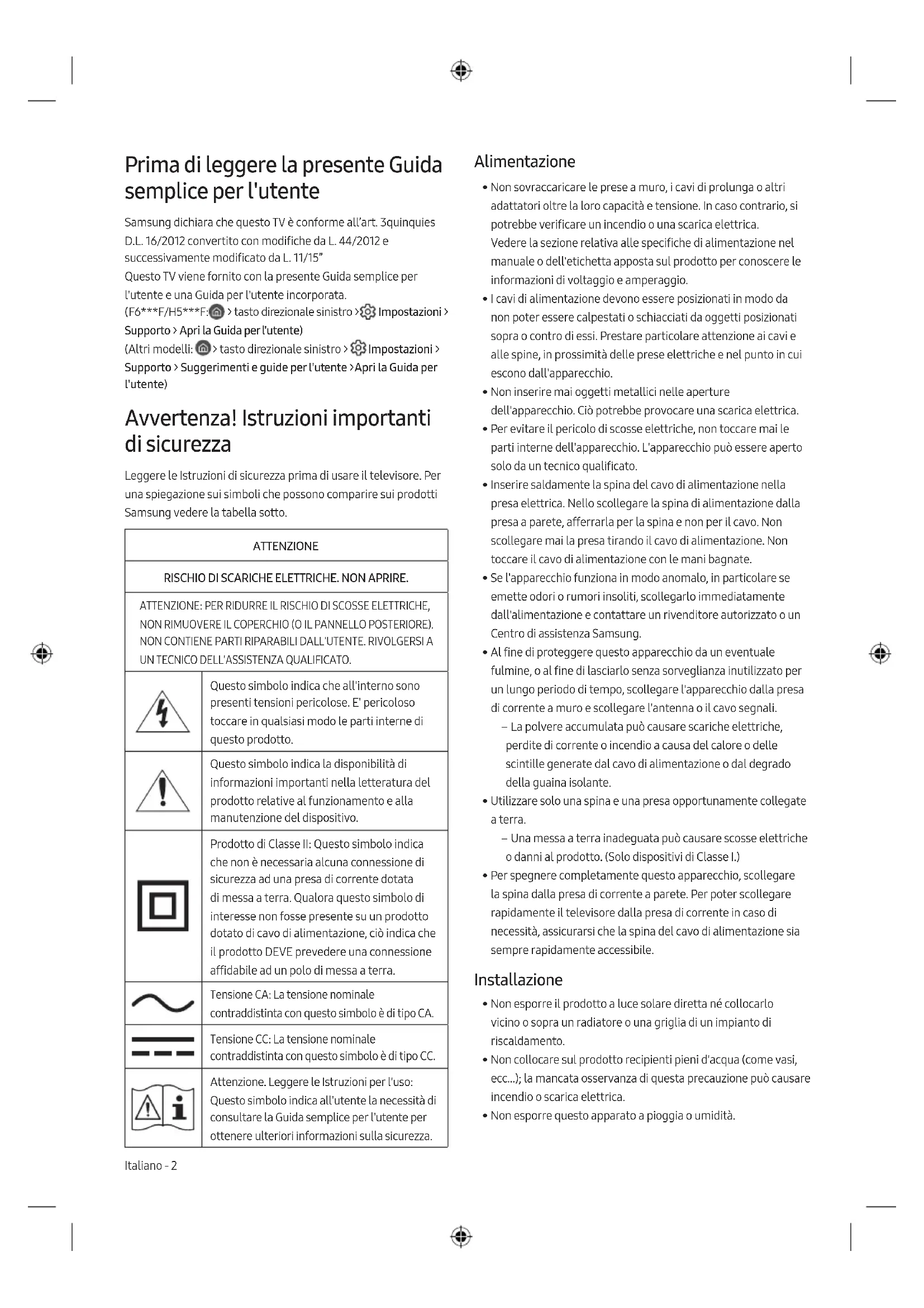 - Le nom de modèle de votre Smart Control figure sur l'étiquette apposée au dos de la télécommande. Français - 10Cette page est laissée intentionnellement vierge.Prima di leggere la presente Guida semplice per l'utente Samsung dichiara che questo TV è conforme all’art. 3quinquies D.L. 16/2012 convertito con modifiche da L. 44/2012 e successivamente modificato da L. 11/15” Questo TV viene fornito con la presente Guida semplice per l'utente e una Guida per l'utente incorporata. (F6***F/H5***F: > tasto direzionale sinistro > Impostazioni > Supporto > Apri la Guida per l'utente) (Altri modelli: > tasto direzionale sinistro > Impostazioni > Supporto > Suggerimenti e guide per l'utente >Apri la Guida per l'utente) Avvertenza! Istruzioni importanti di sicurezza Leggere le Istruzioni di sicurezza prima di usare il televisore. Per una spiegazione sui simboli che possono comparire sui prodotti Samsung vedere la tabella sotto. ATTENZIONE RISCHIO DI SCARICHE ELETTRICHE. NON APRIRE. ATTENZIONE: PER RIDURRE IL RISCHIO DI SCOSSE ELETTRICHE, NON RIMUOVERE IL COPERCHIO (O IL PANNELLO POSTERIORE). NON CONTIENE PARTI RIPARABILI DALL'UTENTE. RIVOLGERSI A UN TECNICO DELL'ASSISTENZA QUALIFICATO. Questo simbolo indica che all'interno sono presenti tensioni pericolose. E' pericoloso toccare in qualsiasi modo le parti interne di questo prodotto. Questo simbolo indica la disponibilità di informazioni importanti nella letteratura del prodotto relative al funzionamento e alla manutenzione del dispositivo. Prodotto di Classe II: Questo simbolo indica che non è necessaria alcuna connessione di sicurezza ad una presa di corrente dotata di messa a terra. Qualora questo simbolo di interesse non fosse presente su un prodotto dotato di cavo di alimentazione, ciò indica che il prodotto DEVE prevedere una connessione affidabile ad un polo di messa a terra. Tensione CA: La tensione nominale contraddistinta con questo simbolo è di tipo CA. Tensione CC: La tensione nominale contraddistinta con questo simbolo è di tipo CC. Attenzione. Leggere le Istruzioni per l'uso: Questo simbolo indica all'utente la necessità di consultare la Guida semplice per l'utente per ottenere ulteriori informazioni sulla sicurezza. Alimentazione