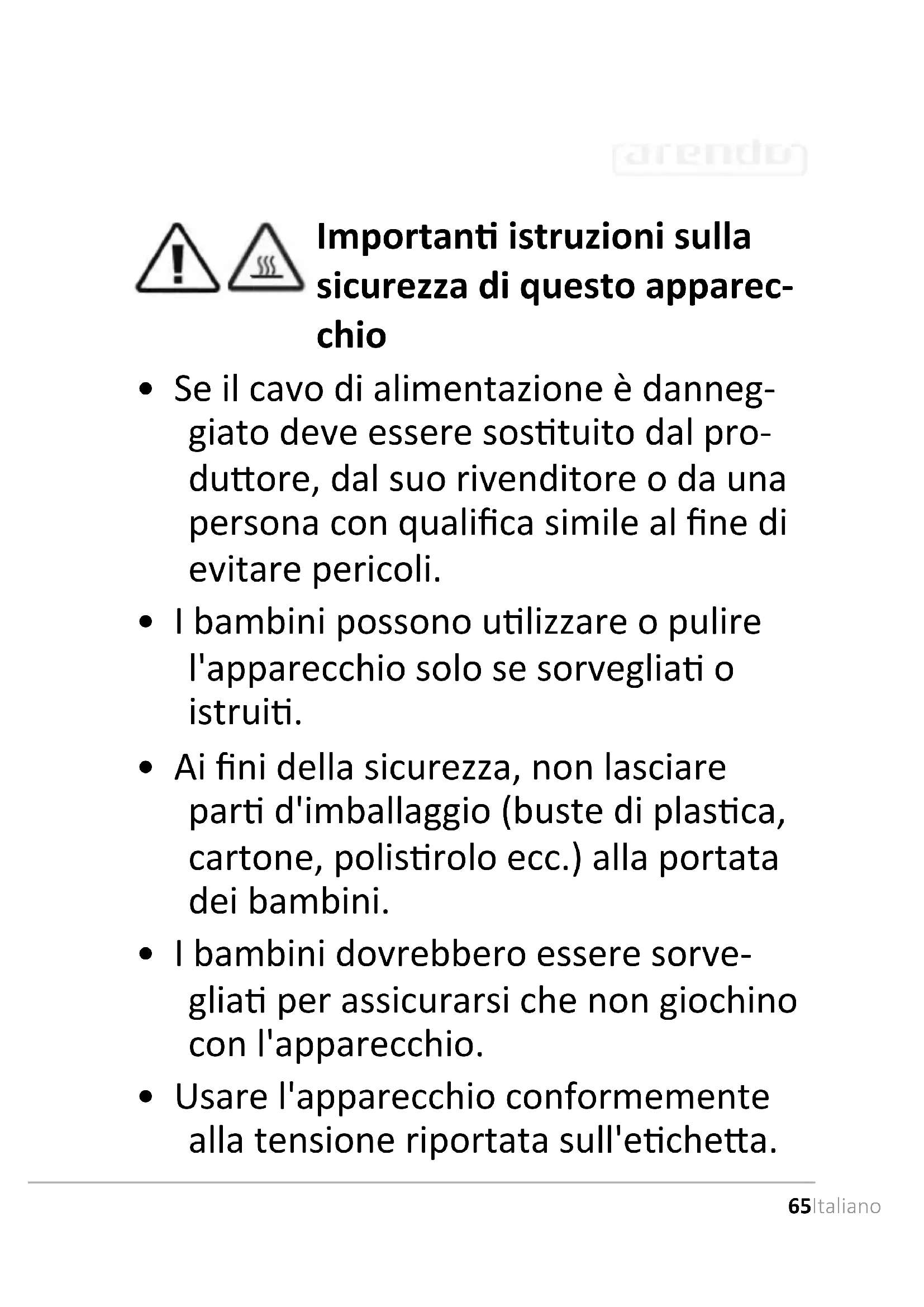 - Non coprire le uscite dell'aria sull’ap- parecchio.68 Italiano Grazie per aver scelto un prodoo di Arendo. Per ulizzare con soddisfazione il prodoo acquistato, si prega di leggere aentamente le seguen istruzioni per l'uso. Prima della messa in funzione della merce consegnata, vericare che sia integra, esente da dife e non danneggiata.