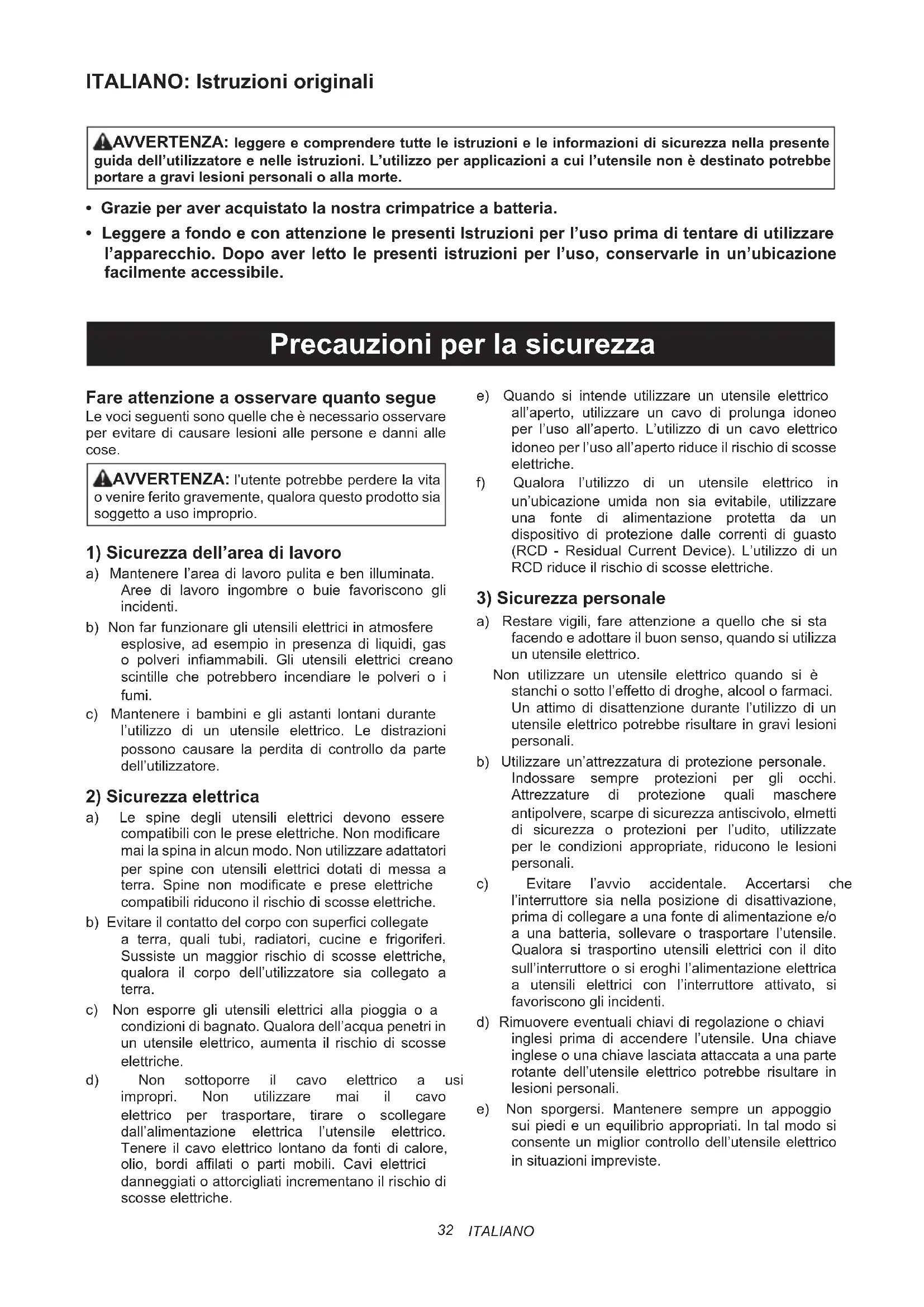 a) Far sottoporre il proprio utensile elettrico a interventi di assistenza da parte di un tecnico qualicato che utilizzi solo pezzi di ricambio identici. In tal modo, si assicura che la sicurezza dell’utensile elettrico venga preservata. b) Non sottoporre mai a interventi di assistenza batterie danneggiate. Gli intervalli di assistenza sulle batterie andrebbero eseguiti solo dal produttore o da fornitori di assistenza autorizzati. Mantenere l’utensile elettrico mediante le superci di impugnatura isolate, quando si intende eseguire un’operazione in cui l’elemento di ssaggio potrebbe entrare in contatto con cablaggi nascosti. Gli elementi di ssaggio contenenti un lo elettrico sotto tensione possono rendere le parti metalliche esposte dell’utensile elettrico sotto tensione, e potrebbero trasmettere all’operatore una scossa elettrica.34 ITALIANO Precauzioni nell’utilizzo della crimpatrice a batteria
